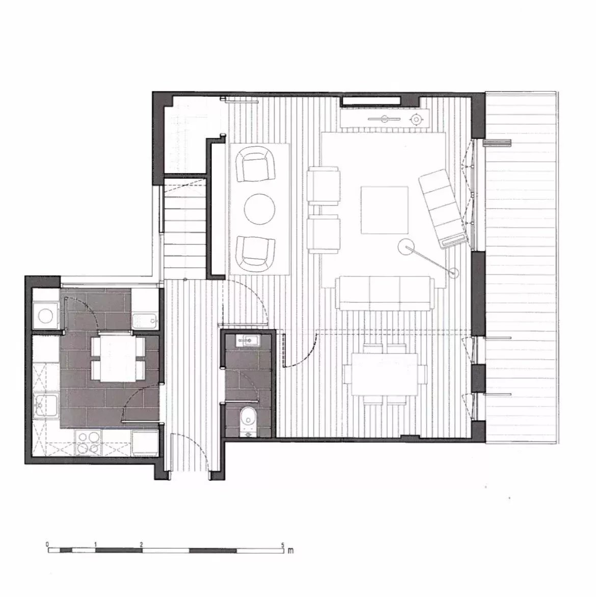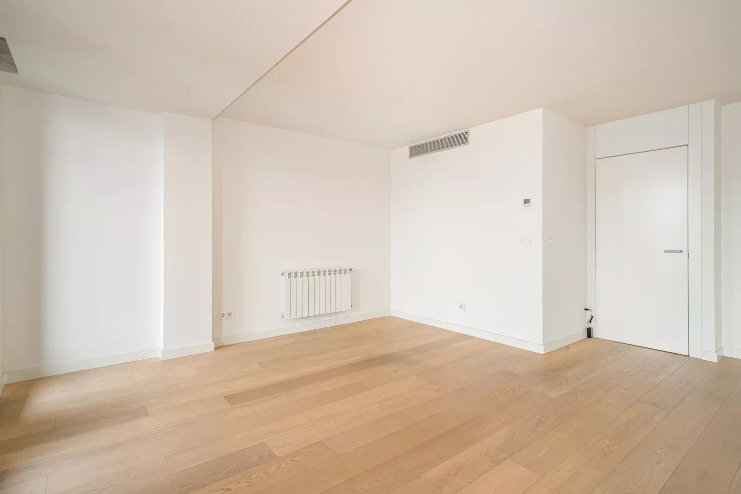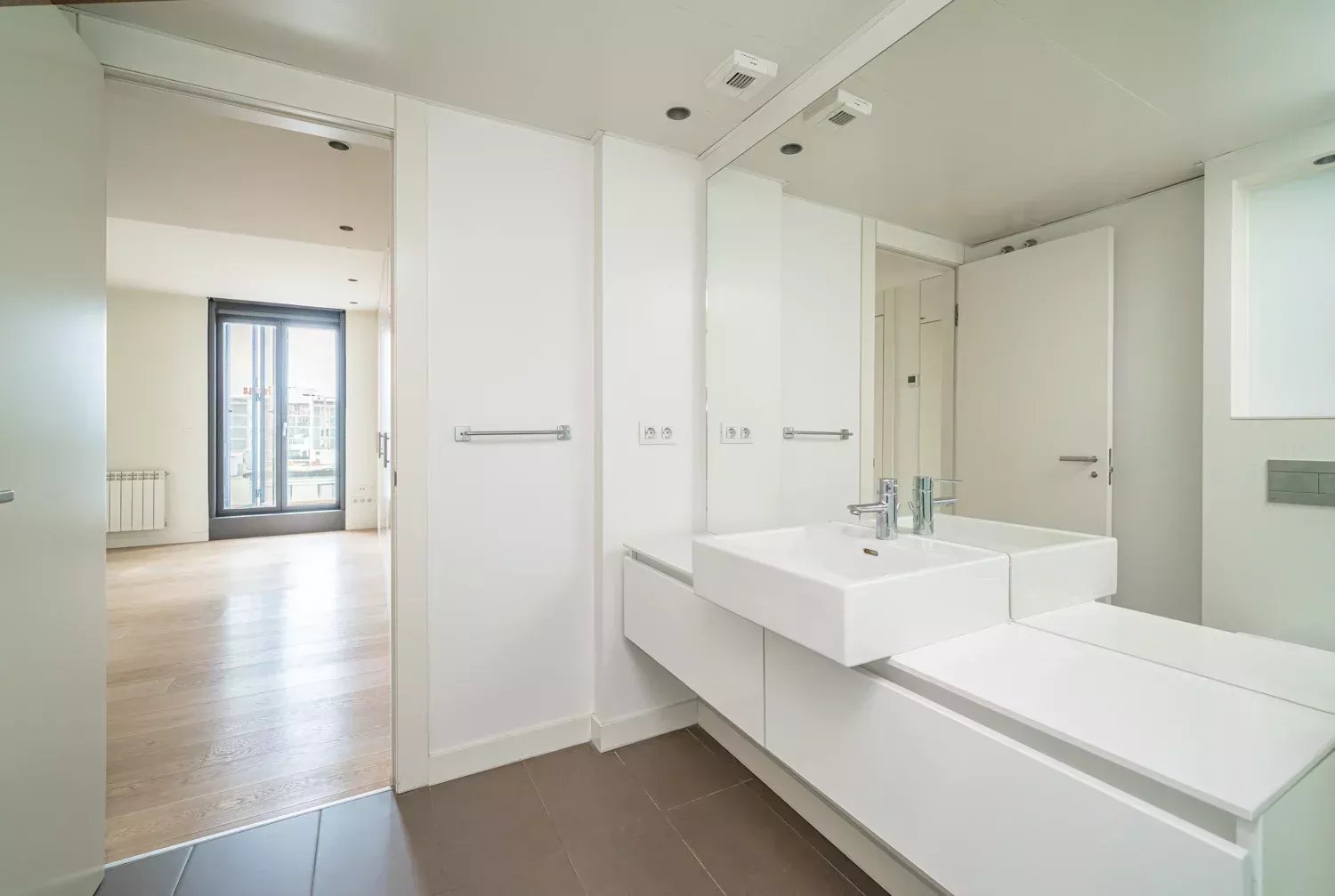 On the main floor, the entrance leads to a spacious social area, consisting of a generous living-dining room. Originally designed with a third bedroom, this was removed to enhance the openness of the space. However, the third bedroom could easily be restored and would also have direct access to a bathroom. From the living room, you can access one of the two private terraces — a true privilege in this area of Madrid.