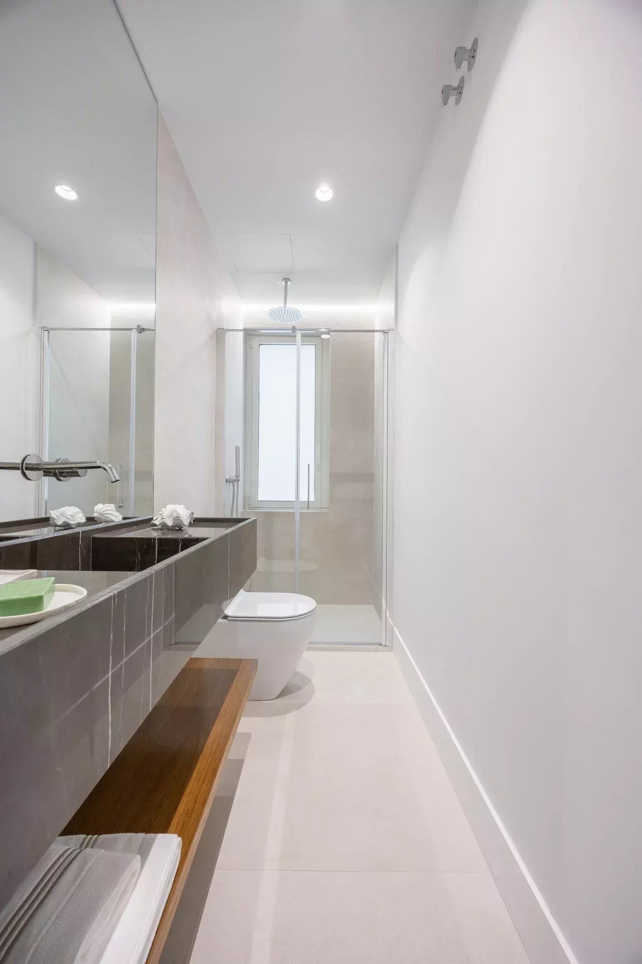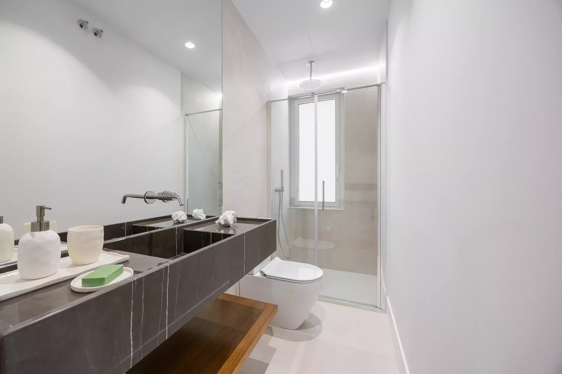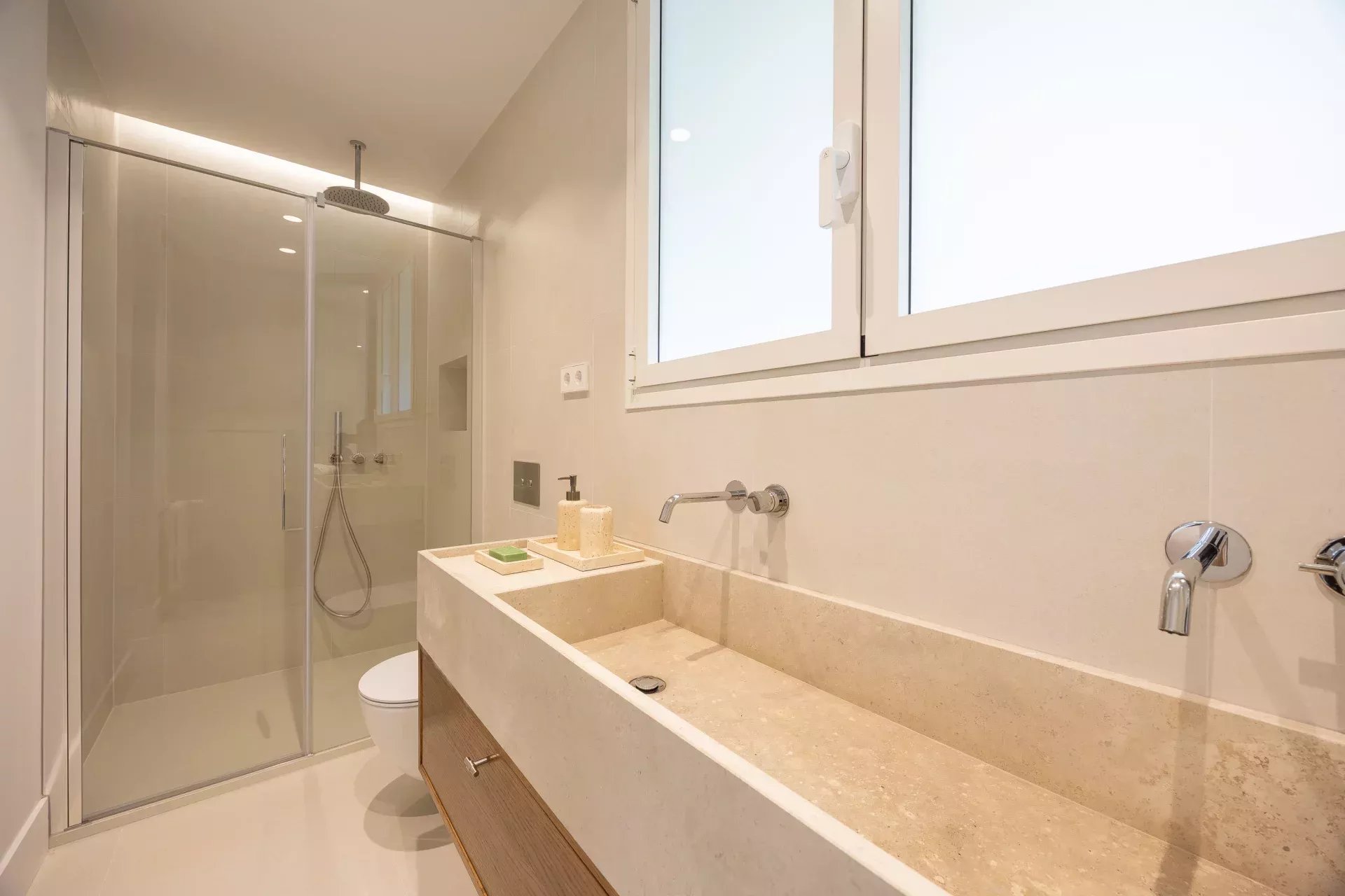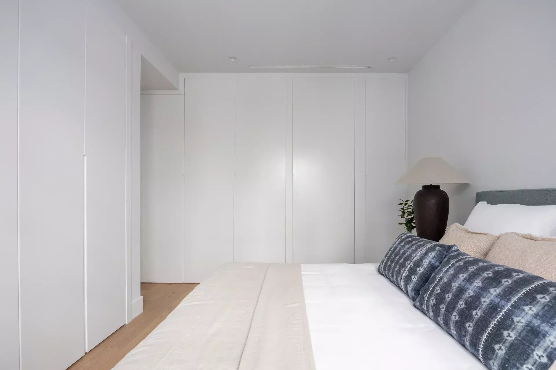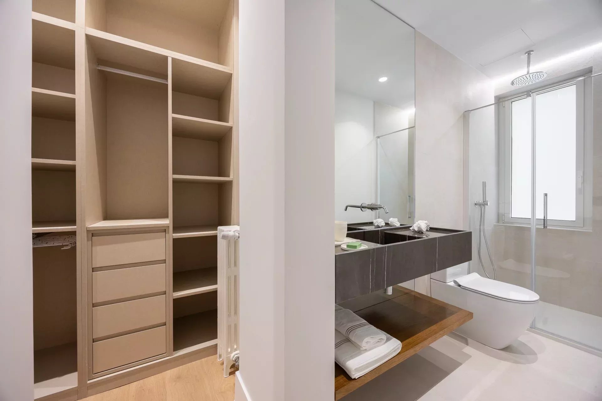 This luxurious home features three en-suite bedrooms, all with built-in wardrobes. Each bathroom has been carefully designed with noble materials such as natural marble, walk-in showers, and top-quality fittings. One of the suites is exterior, while the other two overlook an interior courtyard; one of them includes a spacious walk-in closet, providing generous storage and comfort.