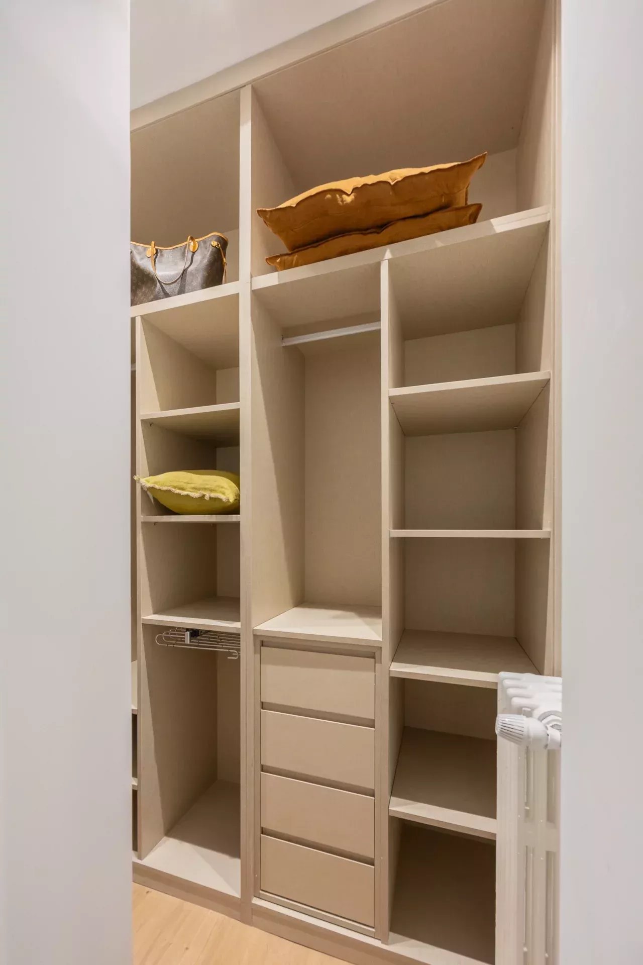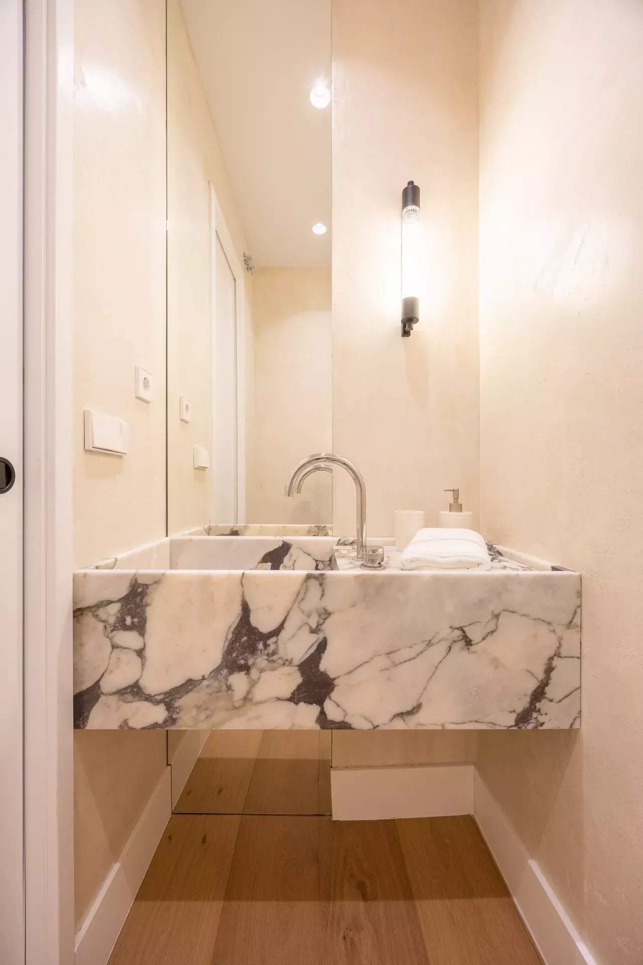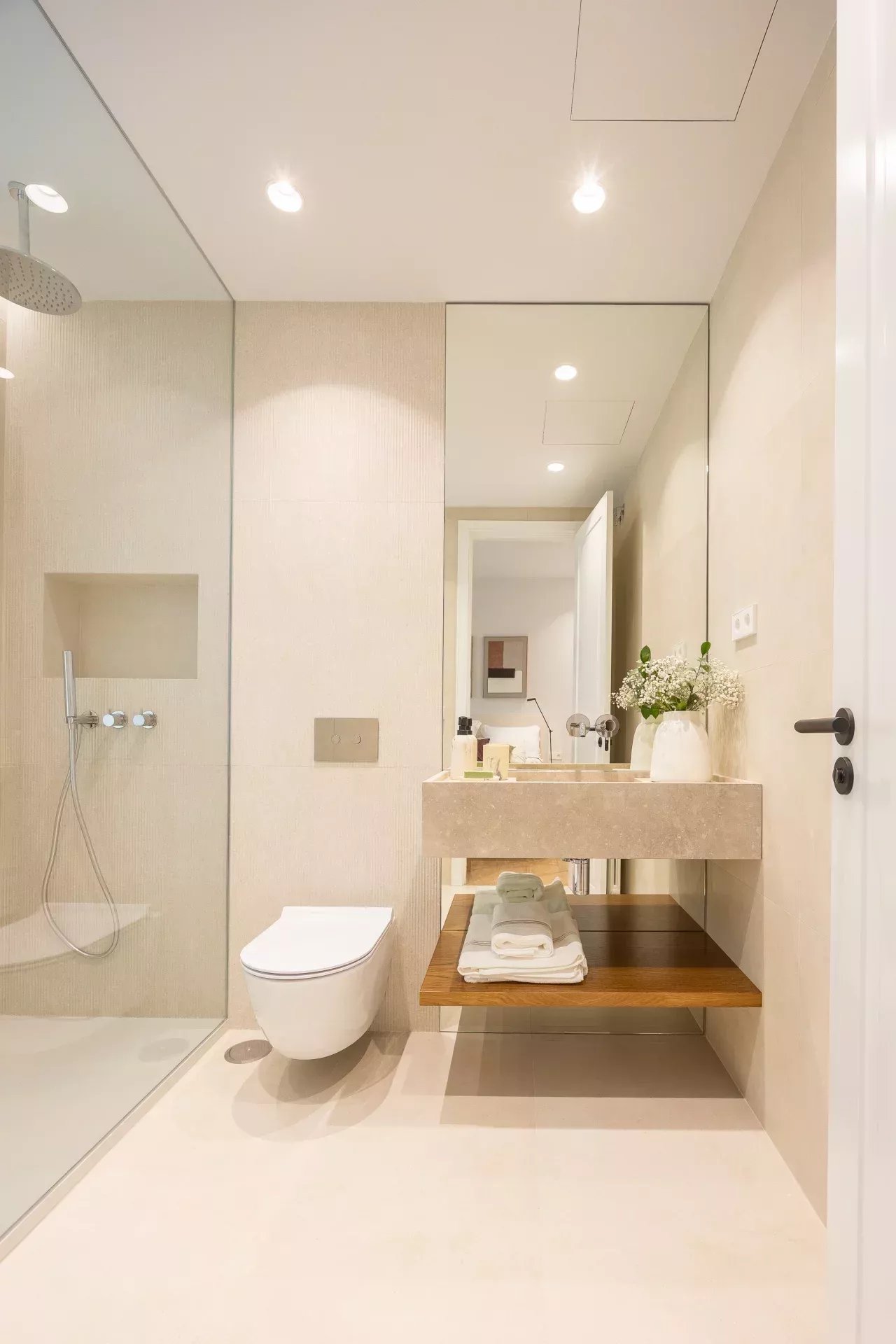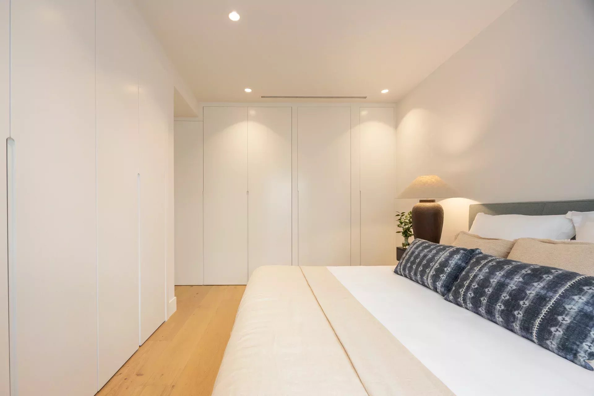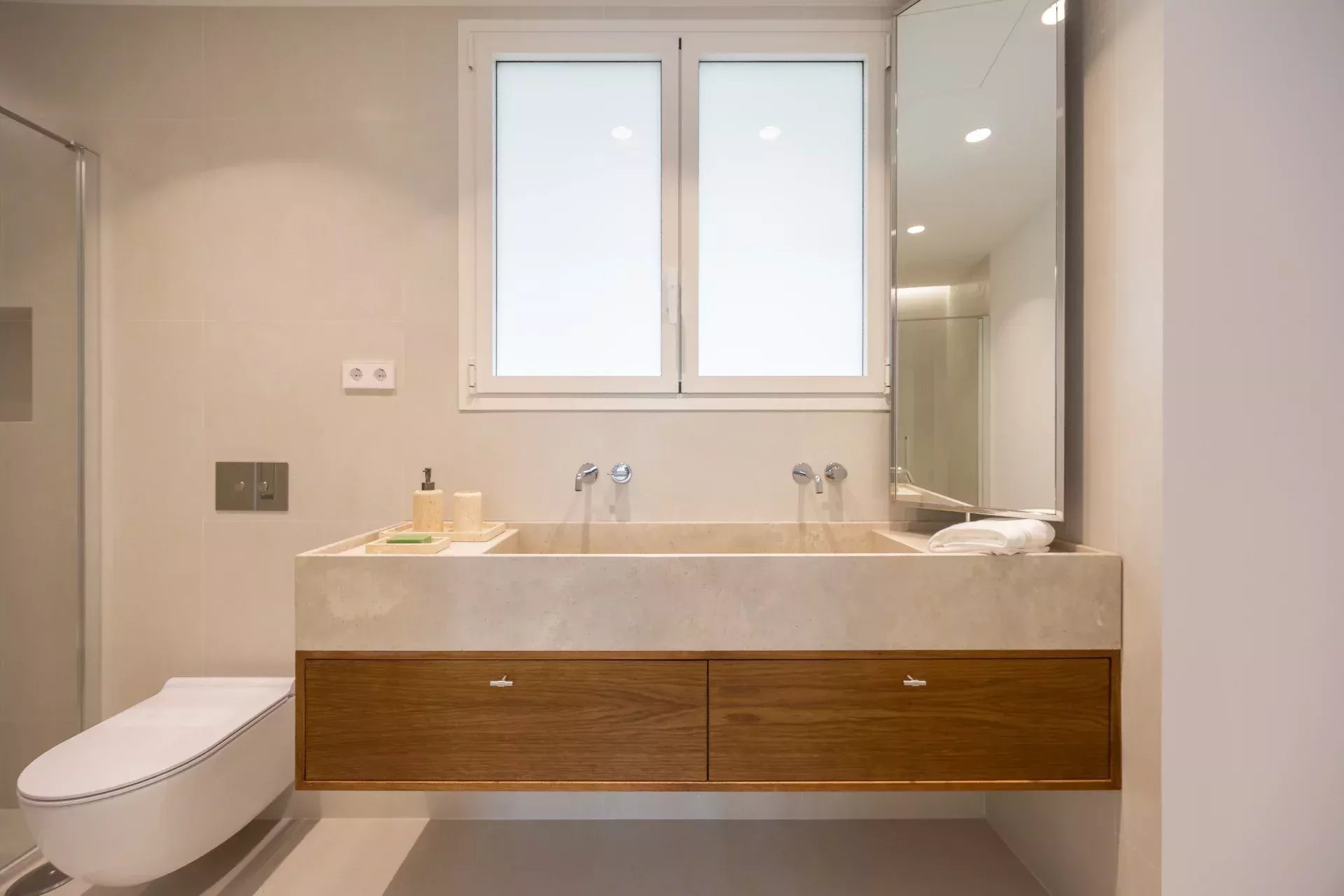 This luxurious home features three en-suite bedrooms, all with built-in wardrobes. Each bathroom has been carefully designed with noble materials such as natural marble, walk-in showers, and top-quality fittings. One of the suites is exterior, while the other two overlook an interior courtyard; one of them includes a spacious walk-in closet, providing generous storage and comfort.