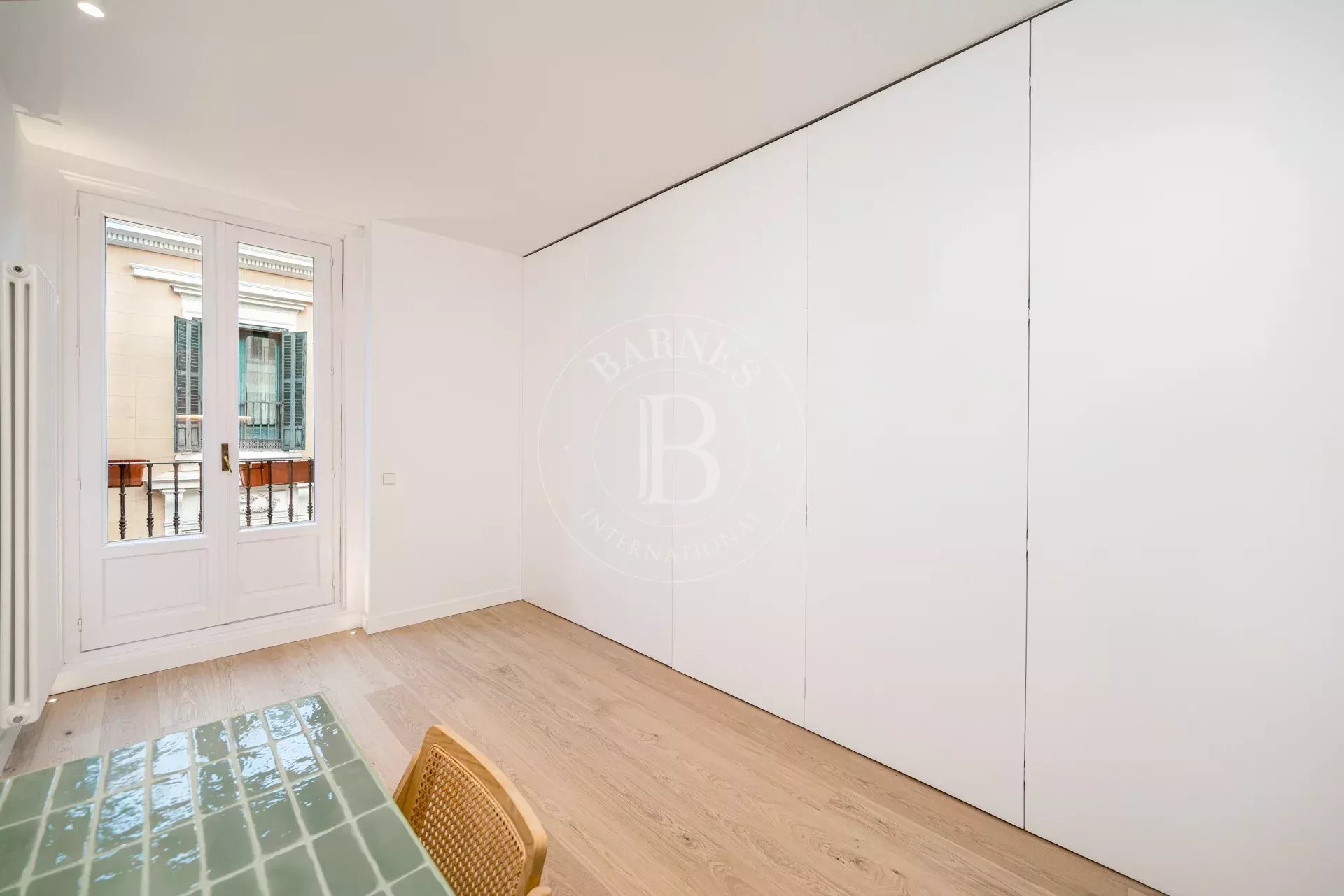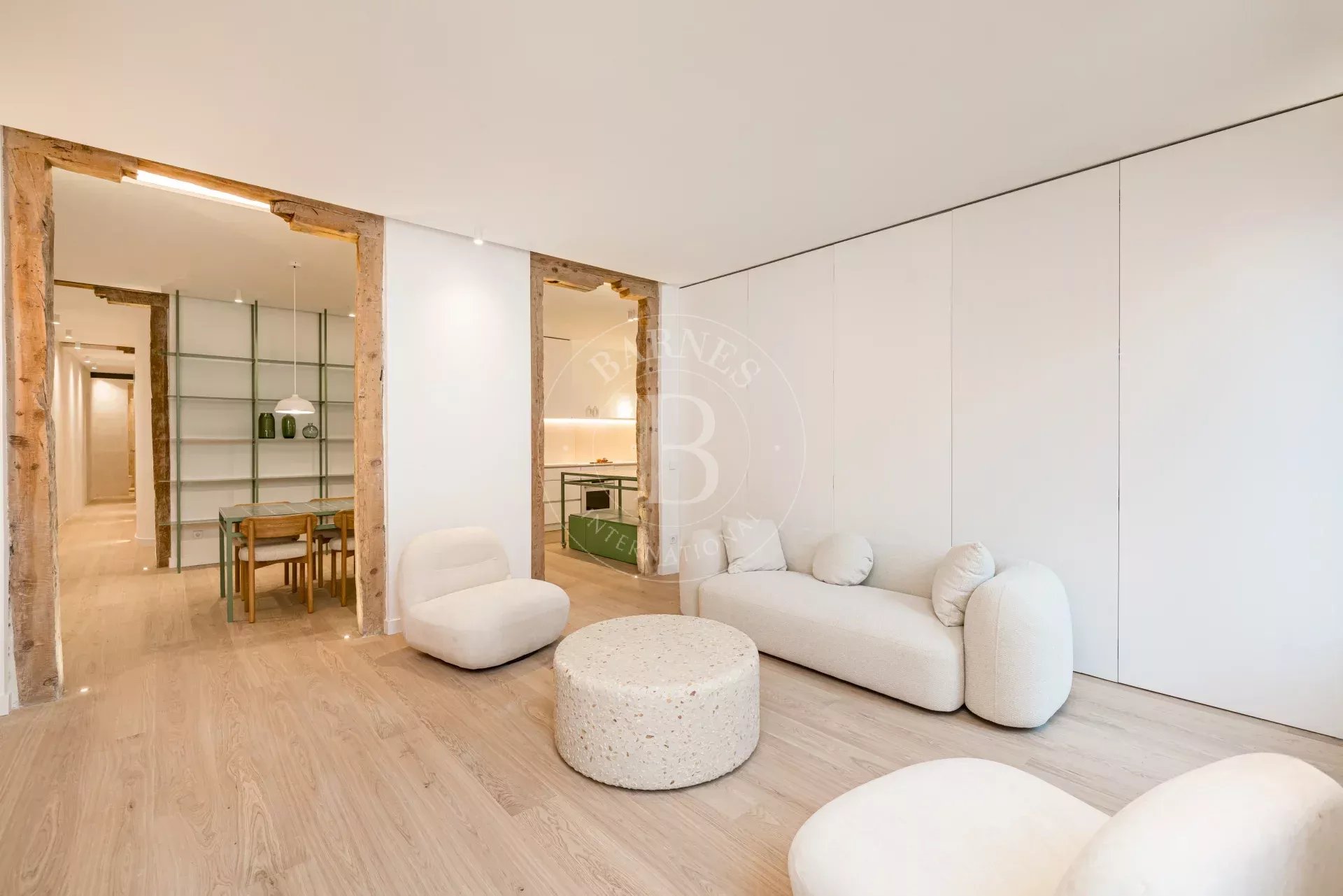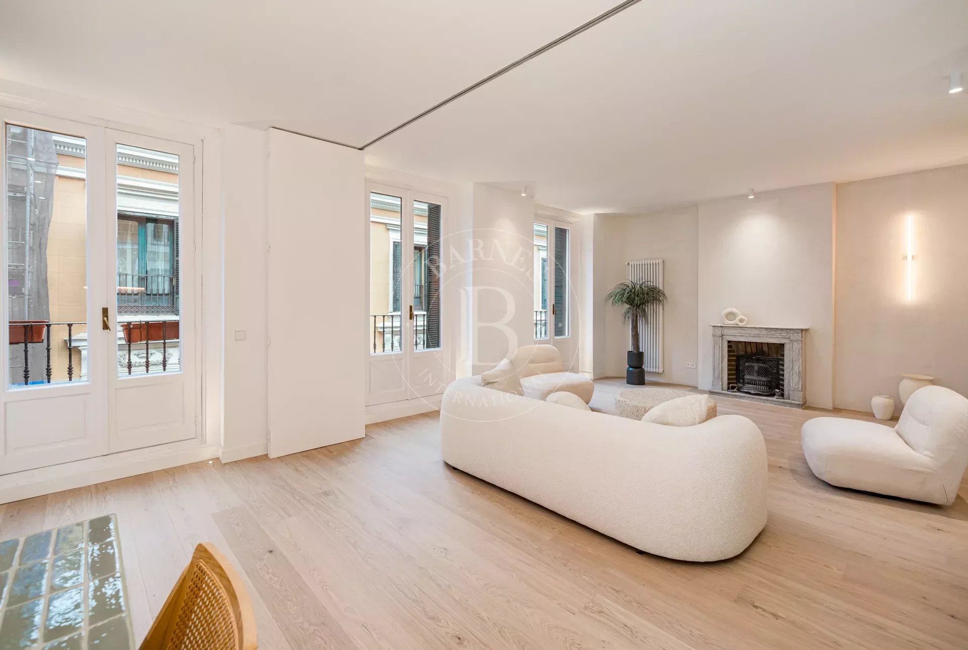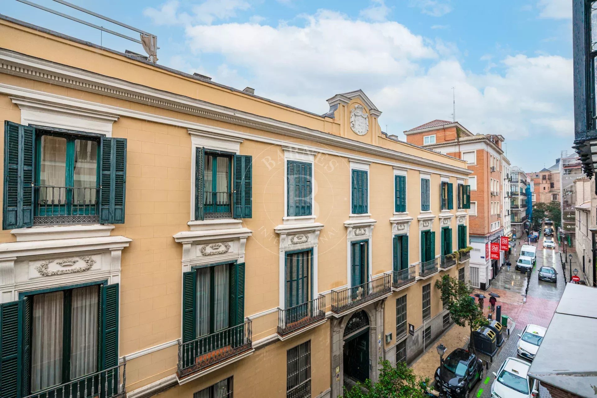 The apartment is exterior and filled with natural light, featuring three balconies overlooking the street that provide openness and a strong connection to the surroundings. It preserves original features such as high ceilings and exposed wooden beams, adding authenticity and charm. The layout centers around a spacious open-plan living area with kitchen, dining, and lounge, complemented by several bedrooms, including suites with dressing rooms, as well as a versatile room with sliding panels.
