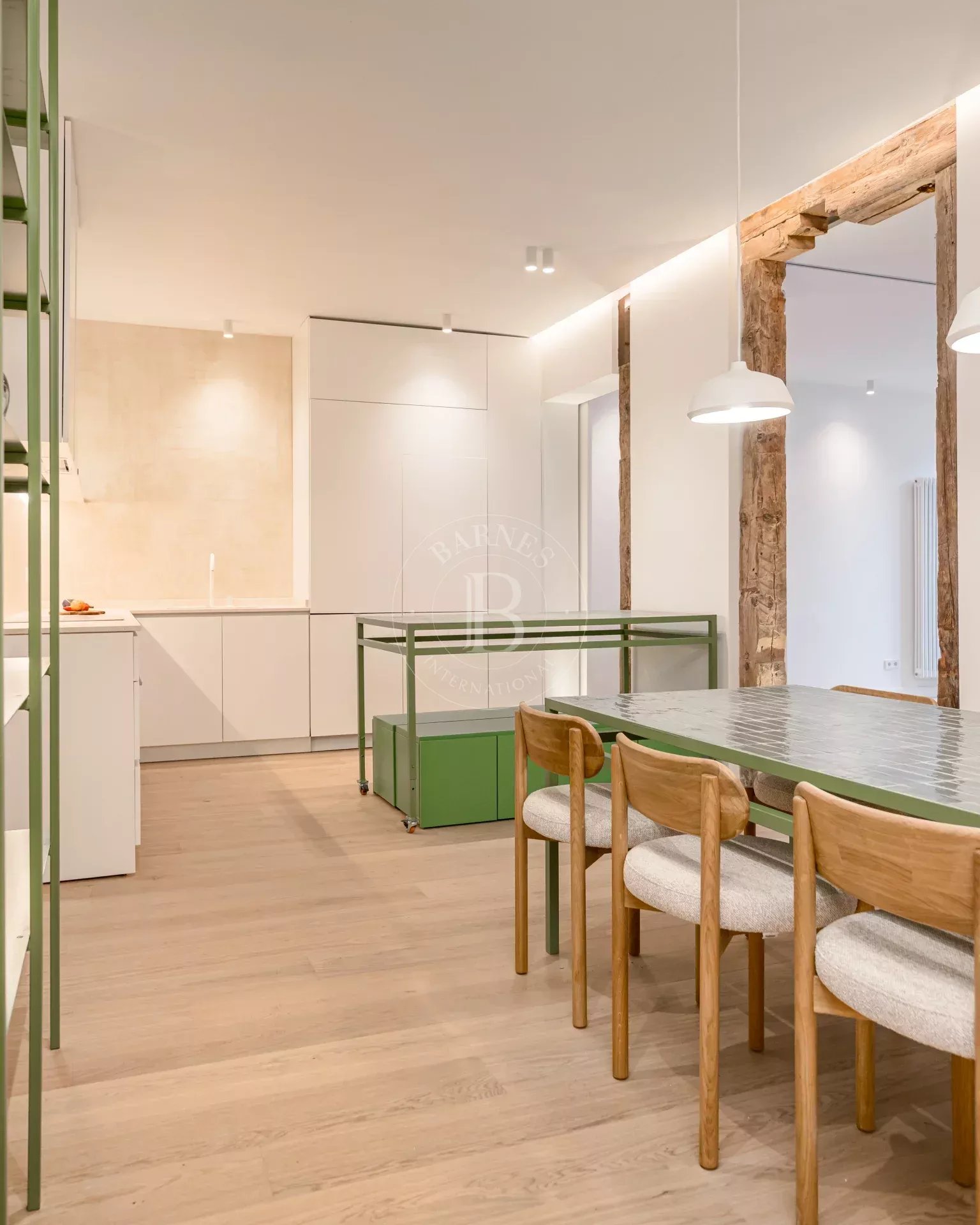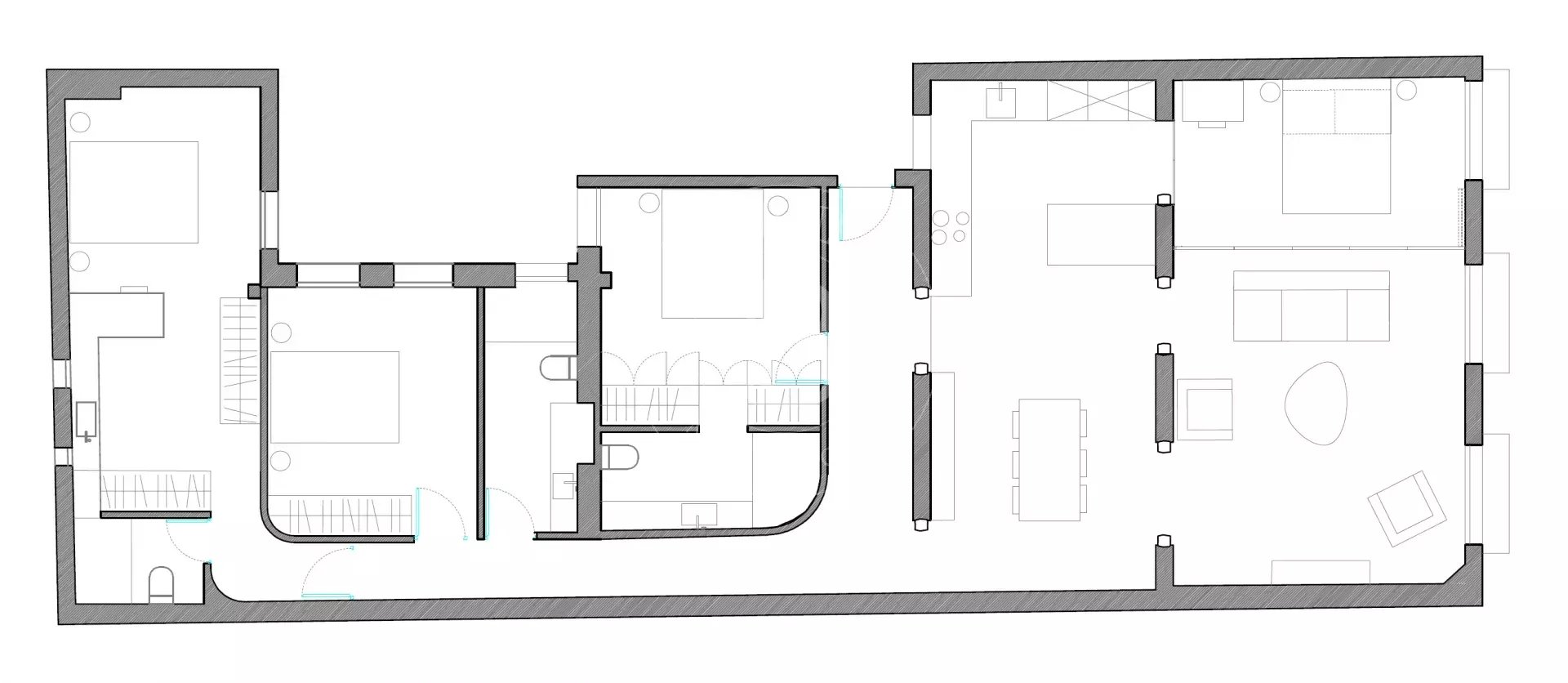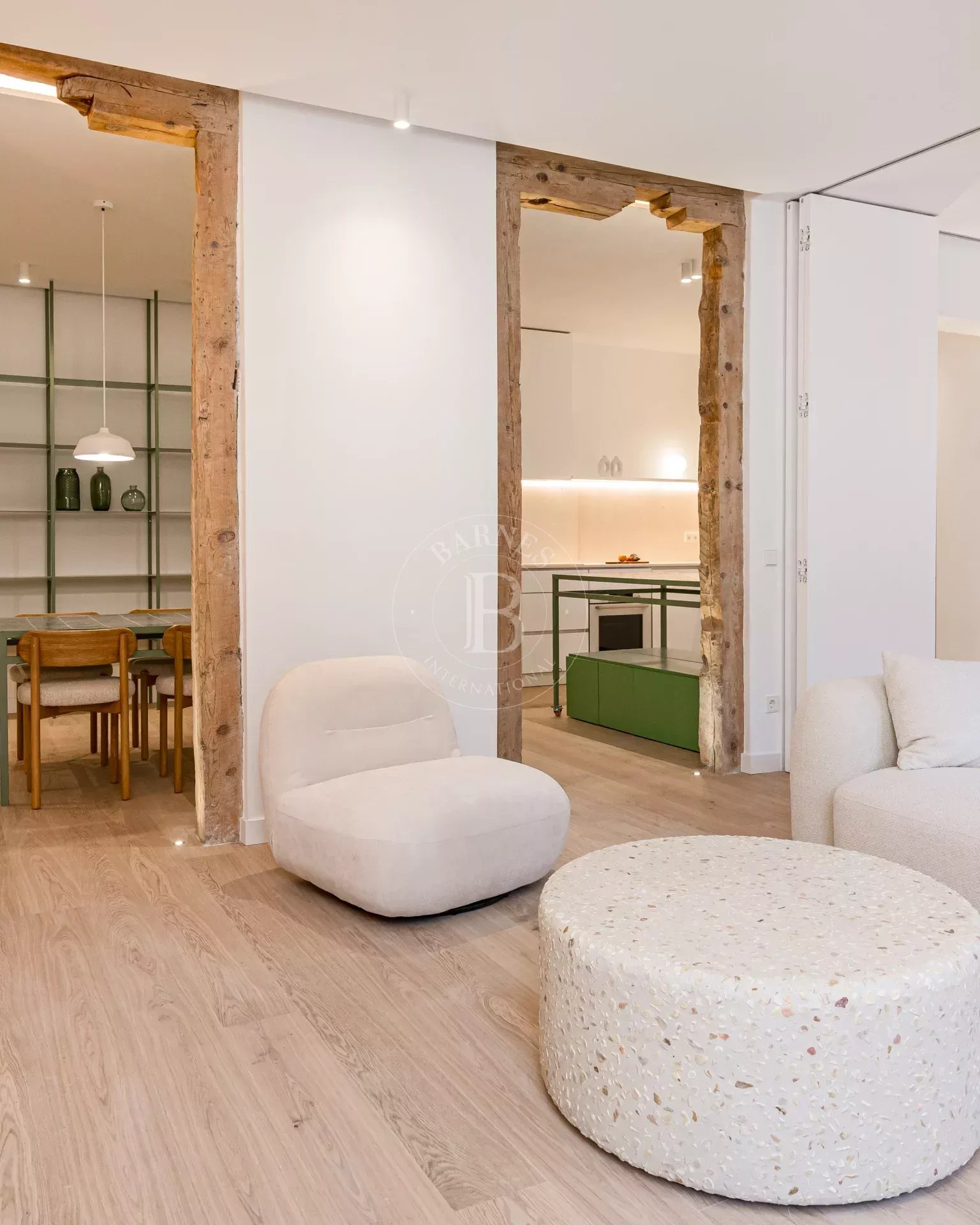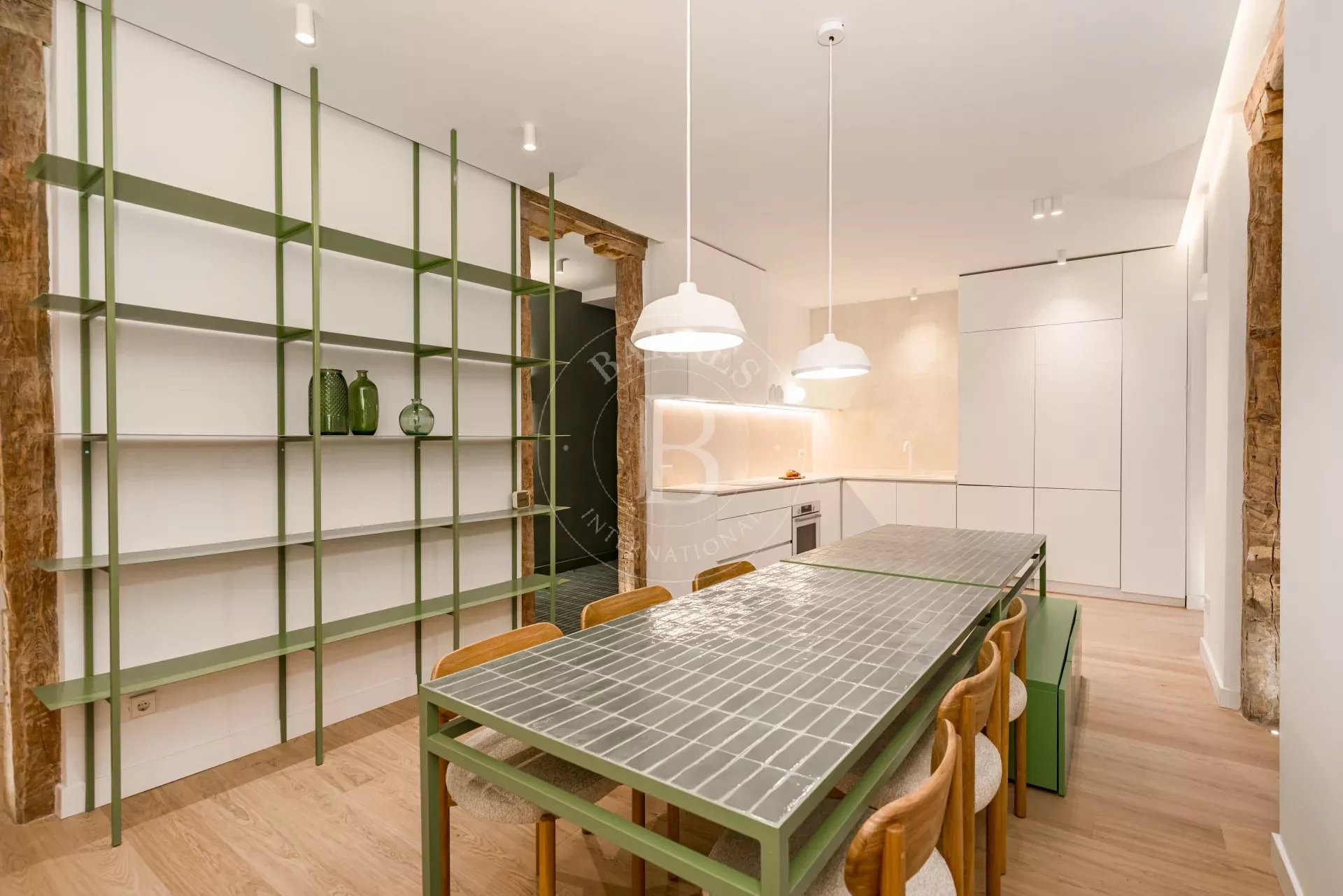 The apartment is exterior and filled with natural light, featuring three balconies overlooking the street that provide openness and a strong connection to the surroundings. It preserves original features such as high ceilings and exposed wooden beams, adding authenticity and charm. The layout centers around a spacious open-plan living area with kitchen, dining, and lounge, complemented by several bedrooms, including suites with dressing rooms, as well as a versatile room with sliding panels.