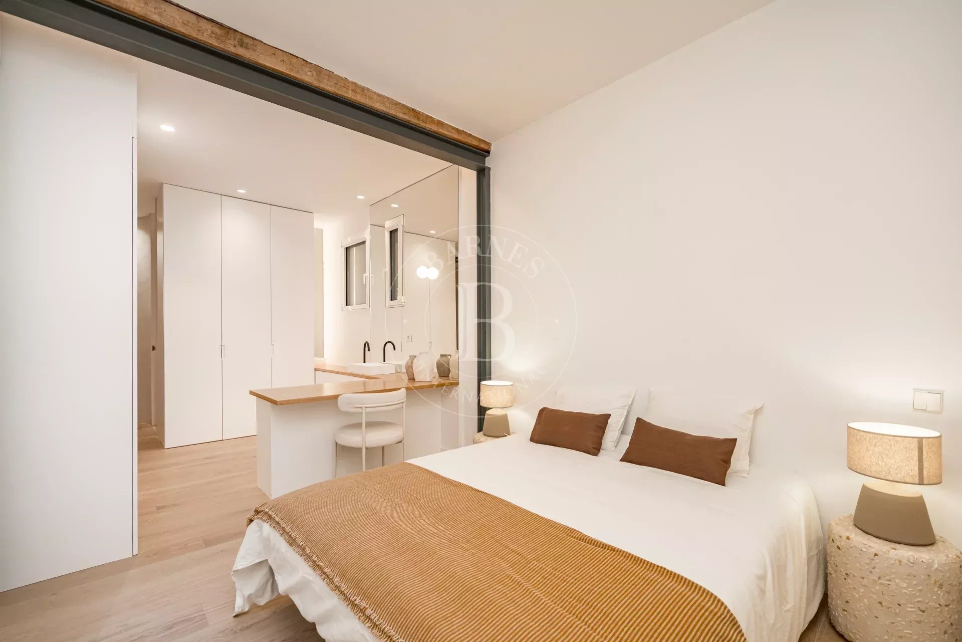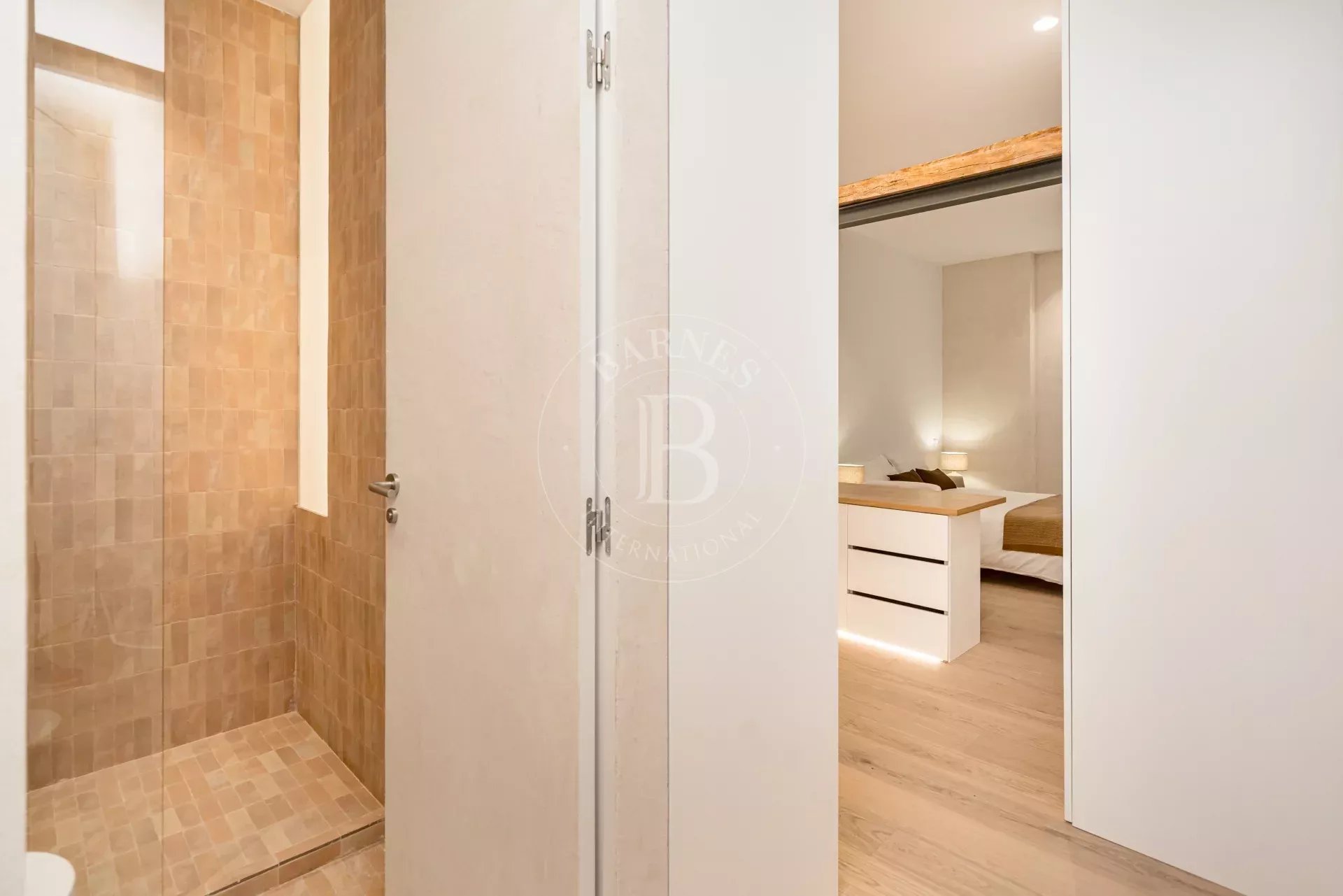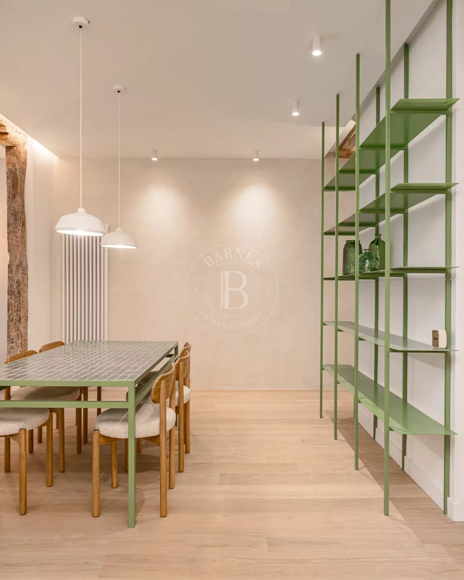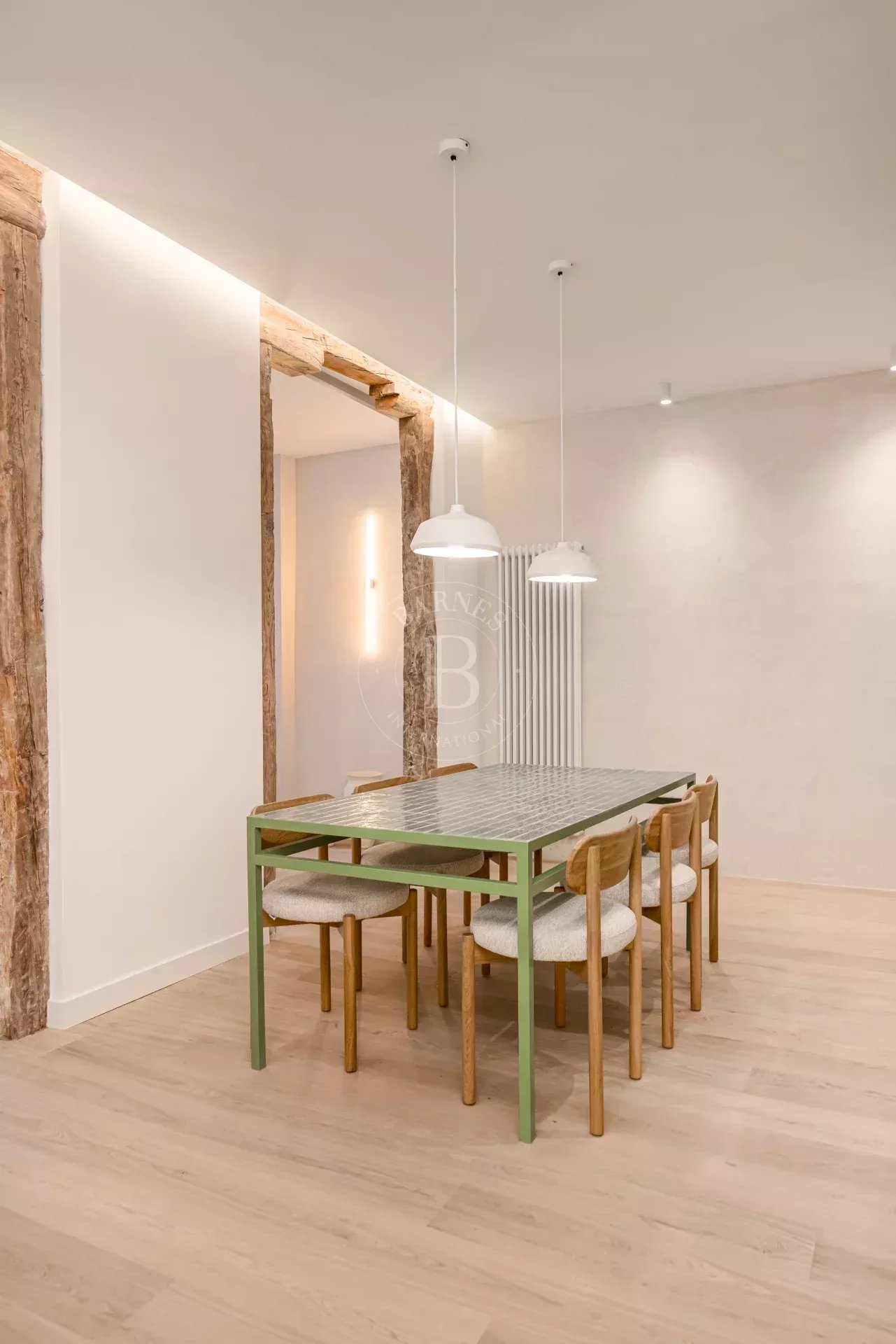 The apartment is exterior and filled with natural light, featuring three balconies overlooking the street that provide openness and a strong connection to the surroundings. It preserves original features such as high ceilings and exposed wooden beams, adding authenticity and charm. The layout centers around a spacious open-plan living area with kitchen, dining, and lounge, complemented by several bedrooms, including suites with dressing rooms, as well as a versatile room with sliding panels.