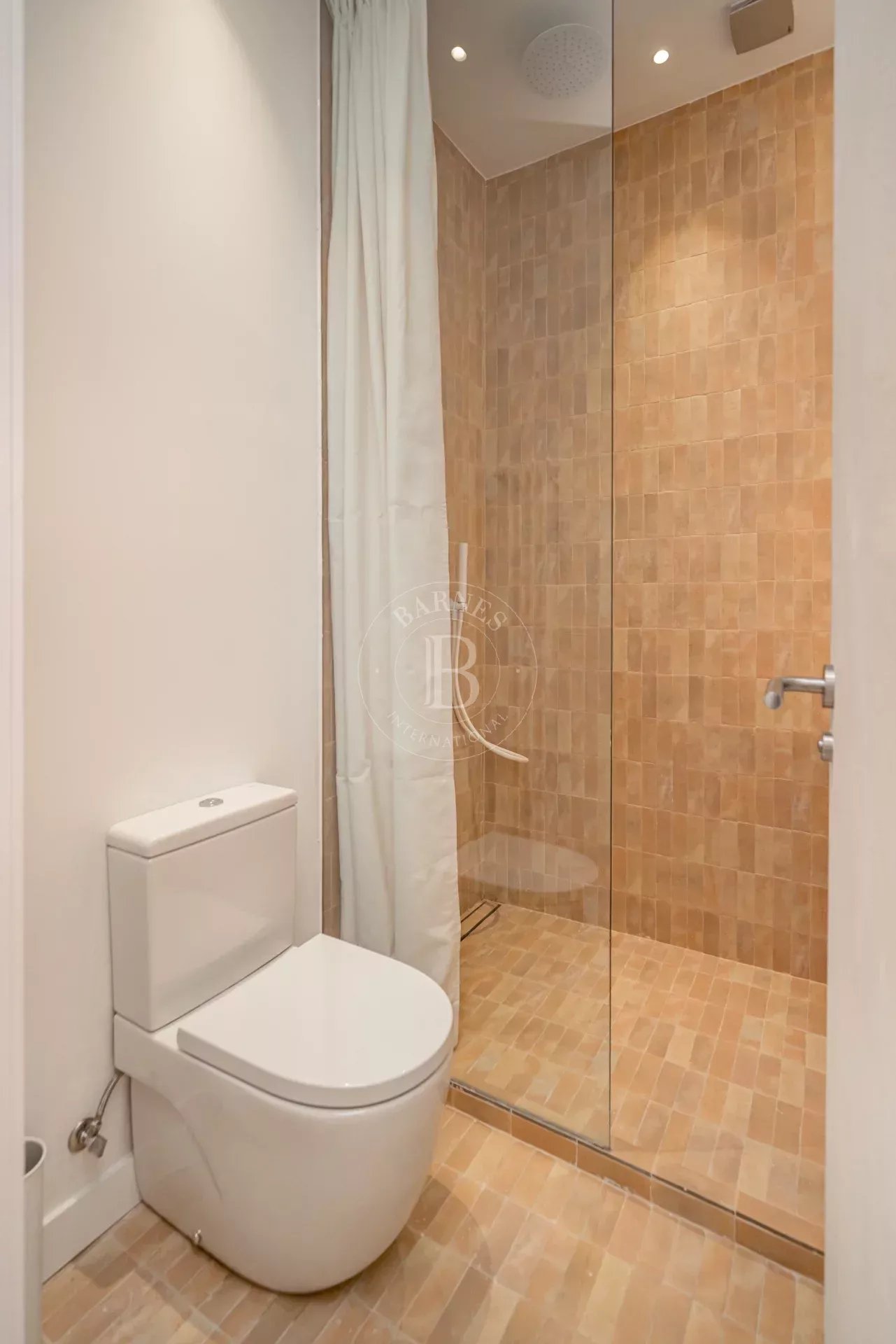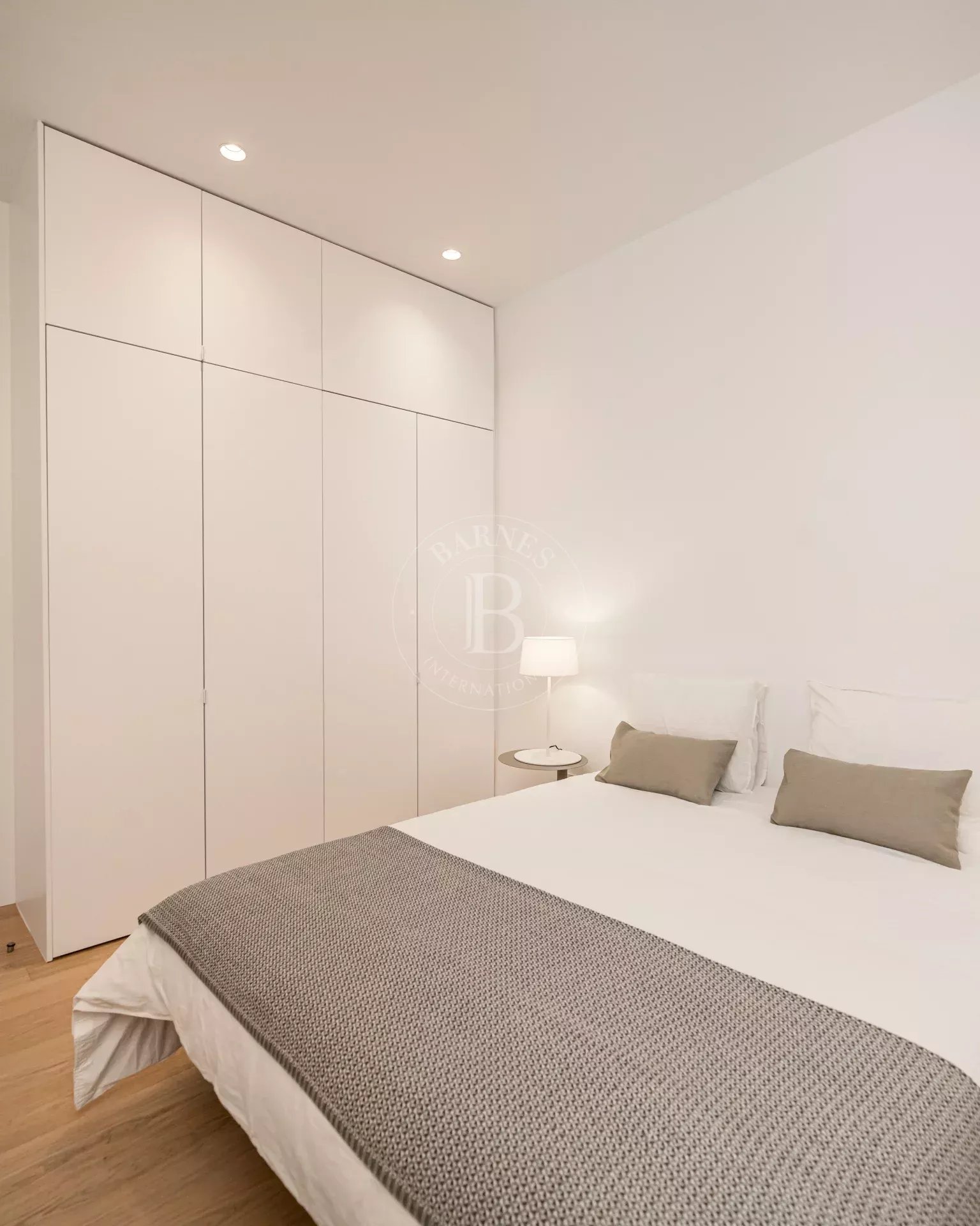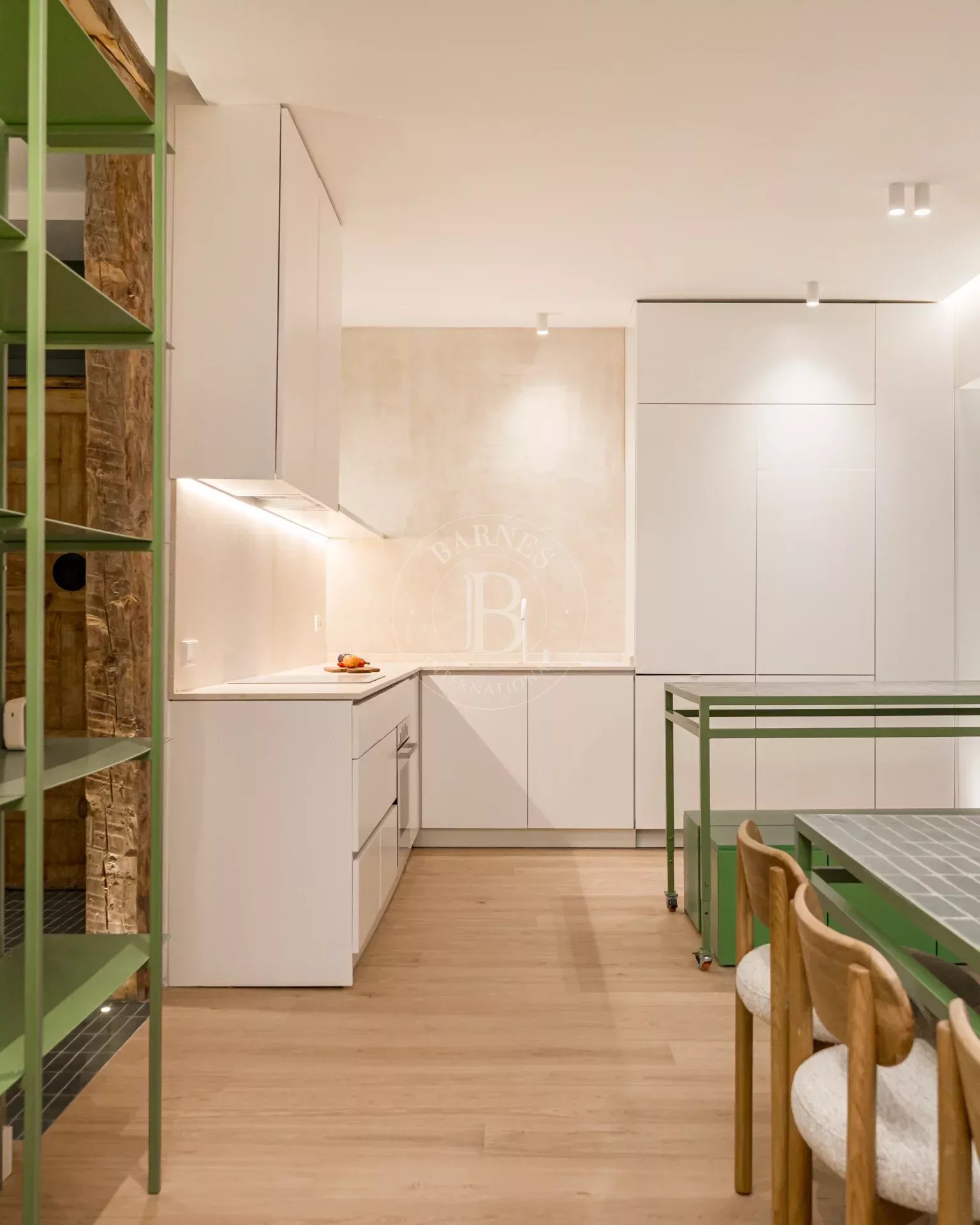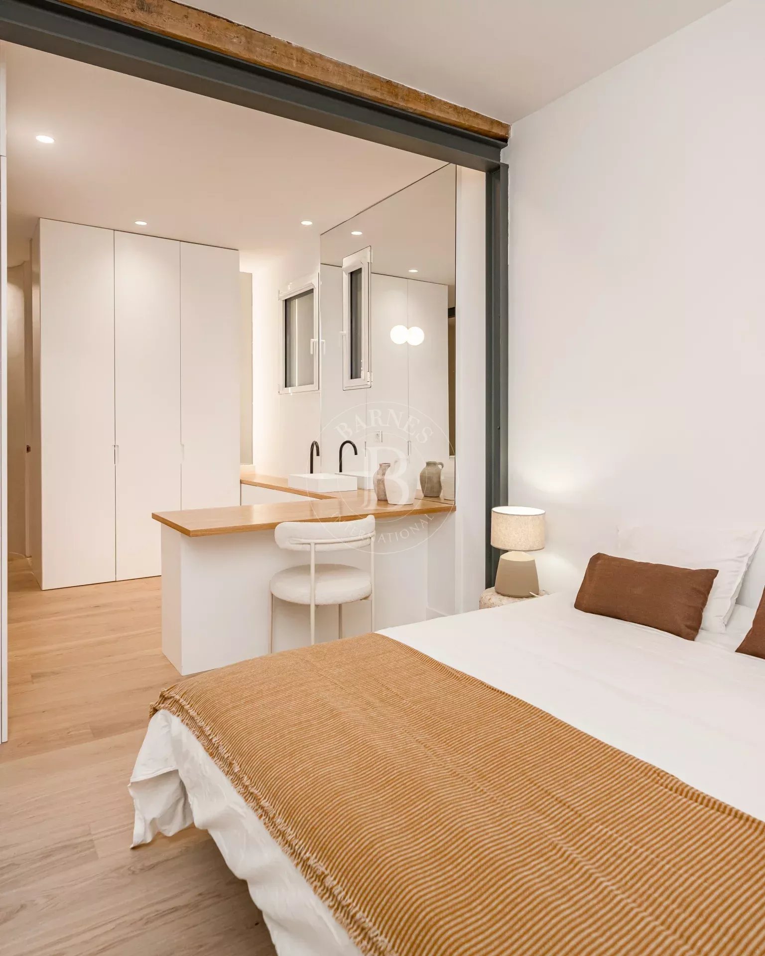 The apartment is exterior and filled with natural light, featuring three balconies overlooking the street that provide openness and a strong connection to the surroundings. It preserves original features such as high ceilings and exposed wooden beams, adding authenticity and charm. The layout centers around a spacious open-plan living area with kitchen, dining, and lounge, complemented by several bedrooms, including suites with dressing rooms, as well as a versatile room with sliding panels.