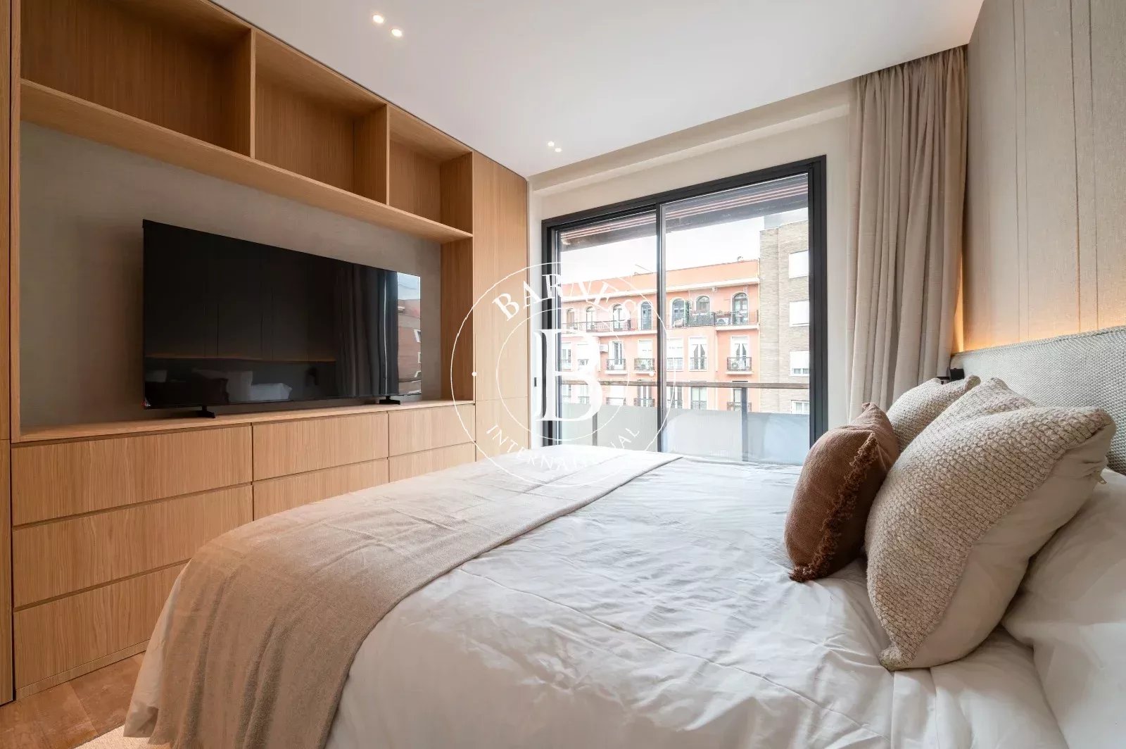 The master bedroom benefits from direct access to a terrace overlooking Diego de León street. The original terrace of the building has been restored, allowing for exceptional natural light through floor-to-ceiling windows and a full-opening system that seamlessly connects the interior with the exterior. The property also includes a separate laundry area, a guest toilet in the day area, and a spacious storage room.