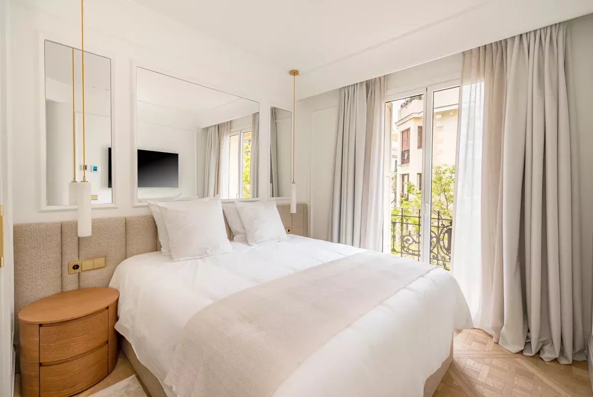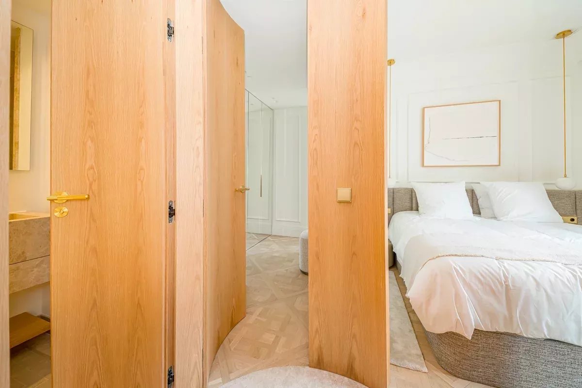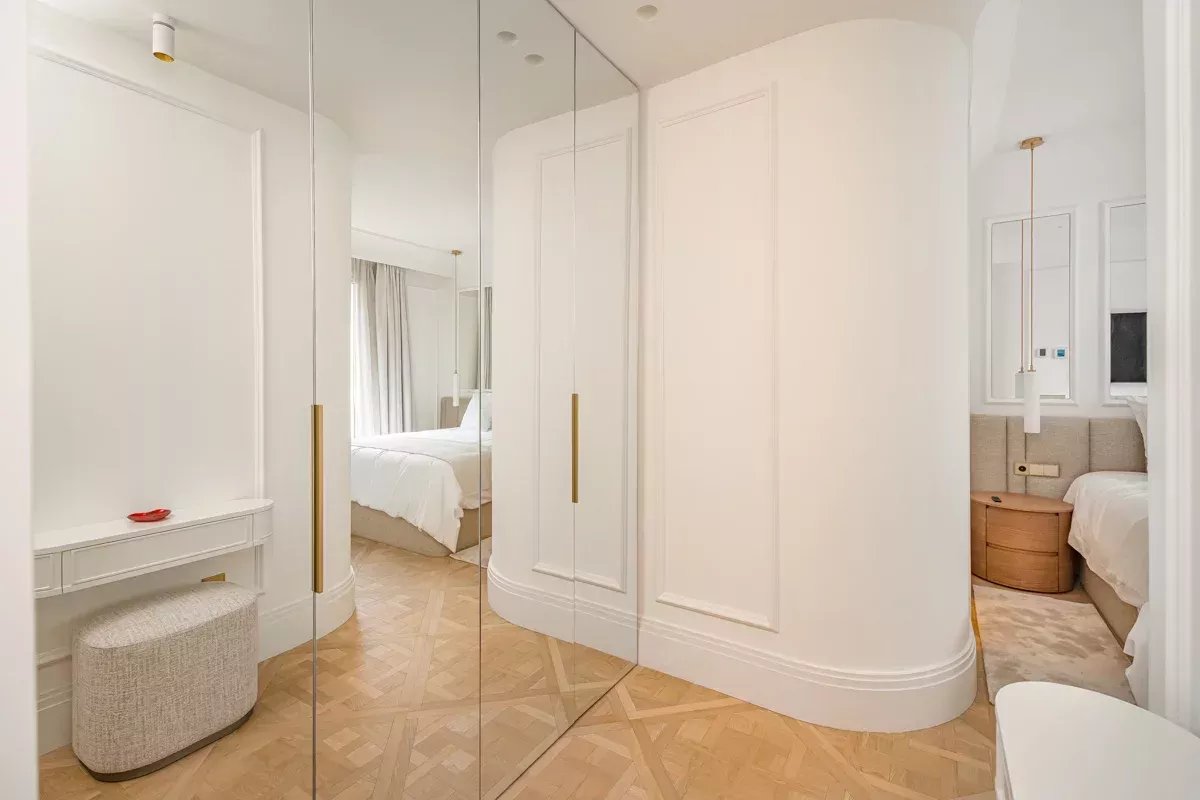 The night area comprises two en-suite bedrooms designed with exquisite attention to form and function: generous walk-in storage, street-facing balconies, designer beds with integrated storage, and bathrooms clad in natural stone with smart sanitary ware. Altogether, the property meets the highest standards among luxury homes for sale in the Barrio de Salamanca.