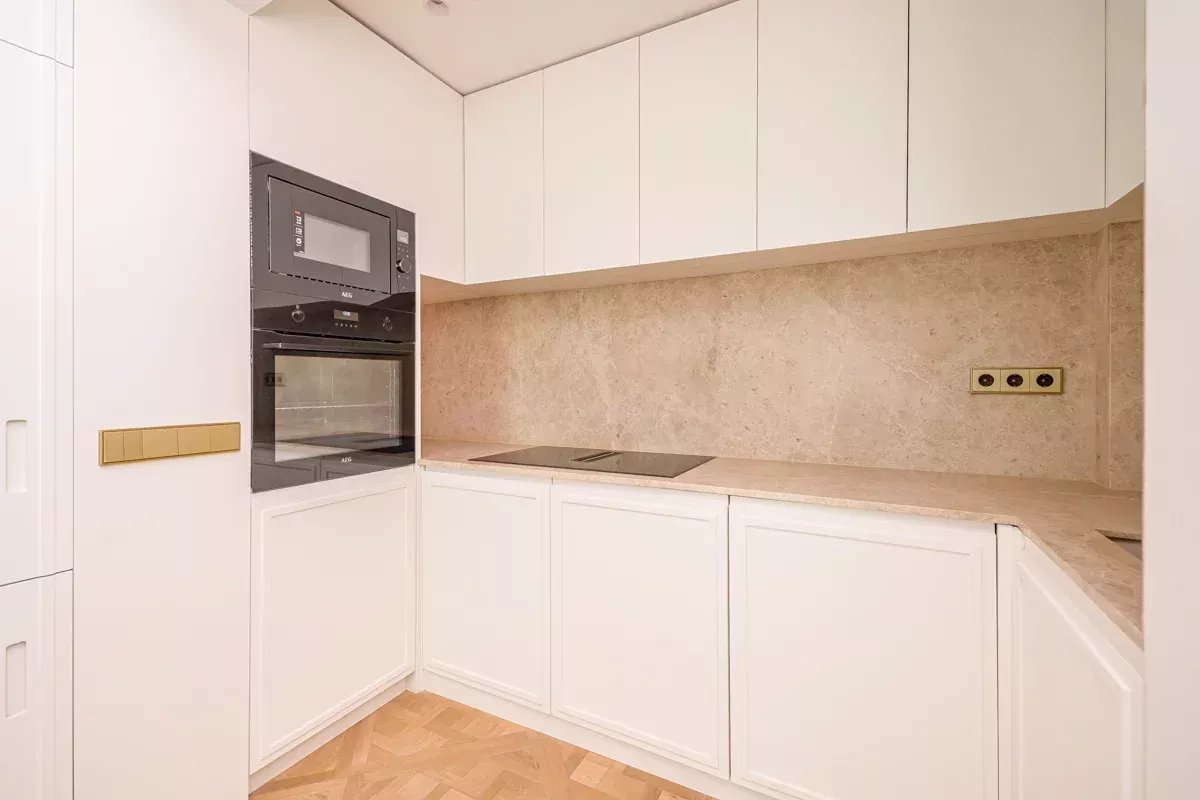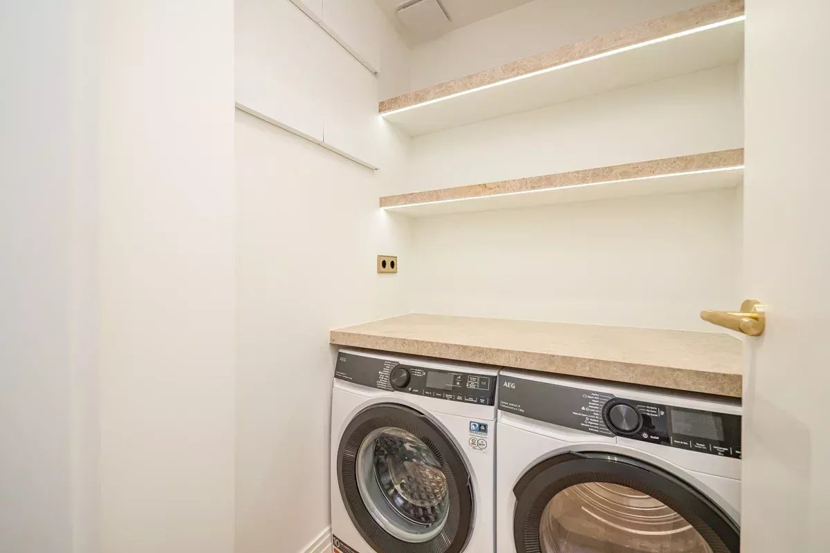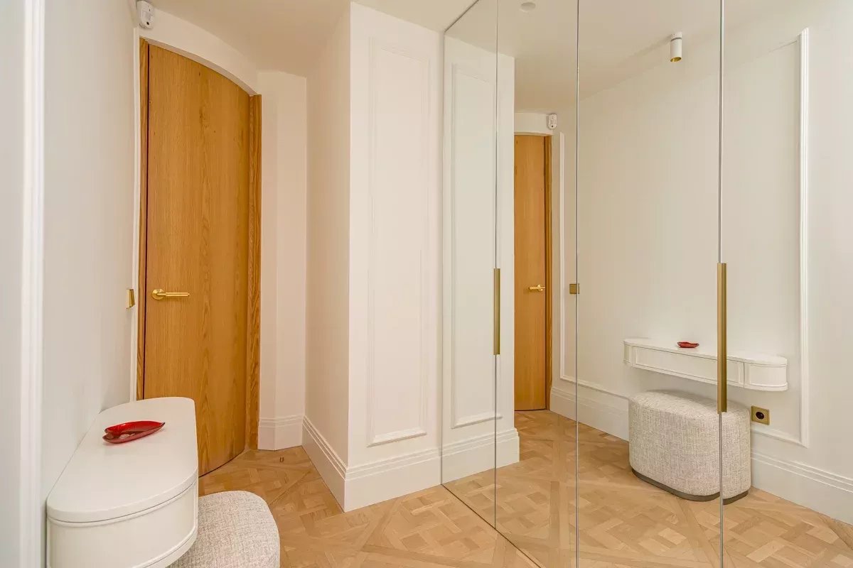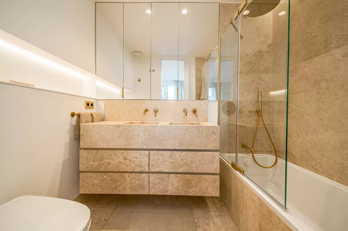 The night area comprises two en-suite bedrooms designed with exquisite attention to form and function: generous walk-in storage, street-facing balconies, designer beds with integrated storage, and bathrooms clad in natural stone with smart sanitary ware. Altogether, the property meets the highest standards among luxury homes for sale in the Barrio de Salamanca.