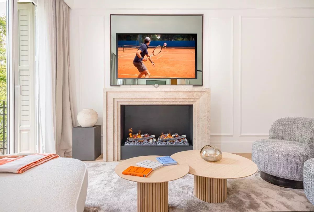 Housed in a carefully restored classical building with on-site concierge, gym, and impeccable common areas, the home blends traditional architecture with contemporary comfort. The main open-plan space combines living, dining, and an “invisible” designer kitchen, whose luxury finishes align with clean lines and forward-looking solutions. Details such as a smart smoked mirror concealing the TV or an eco-friendly water-vapor fireplace enhance both aesthetics and sustainability—attributes highly valued in Madrid luxury real estate.