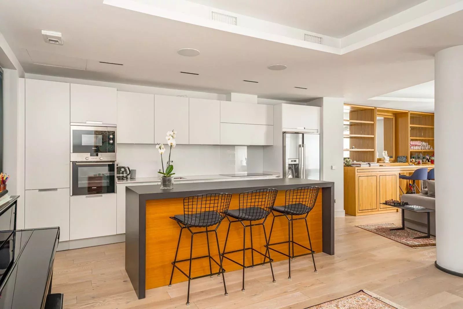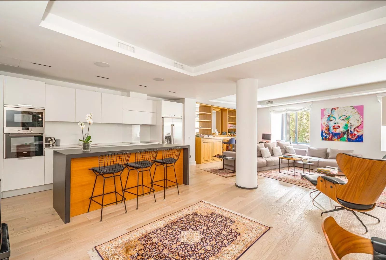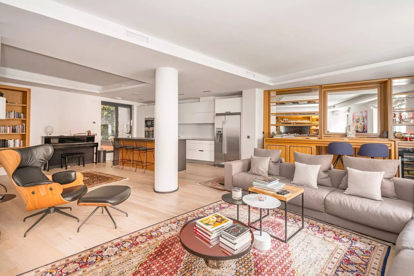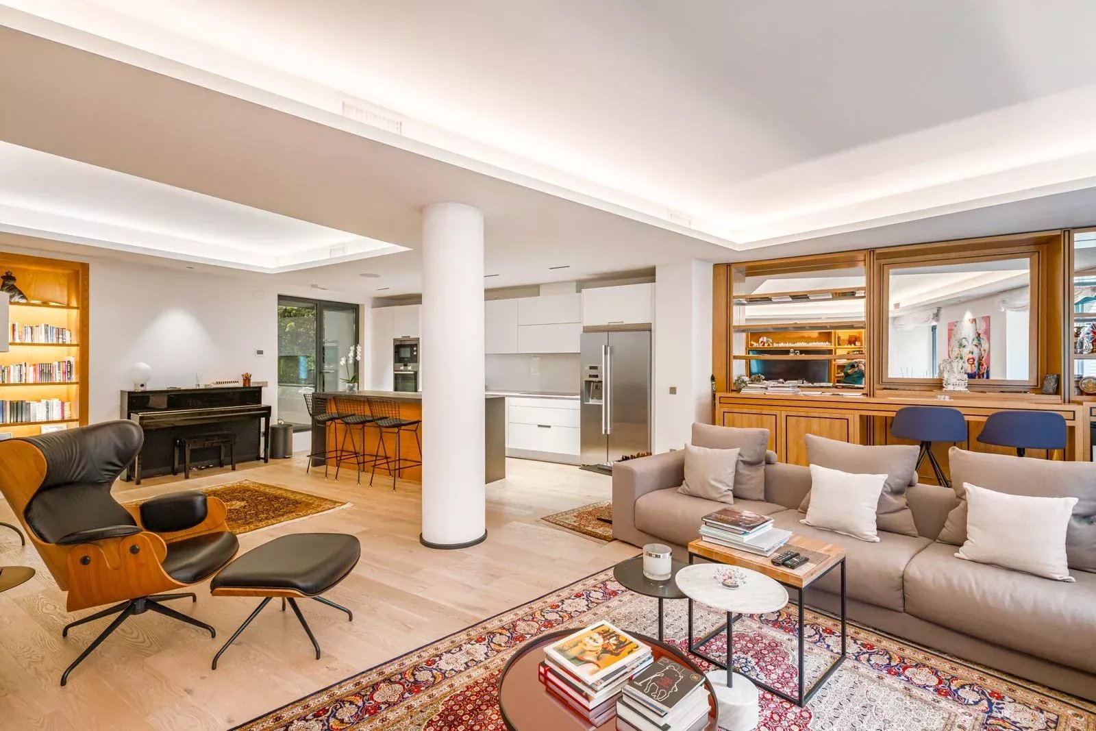 Living-dining room overlooking Recoletos street and integrated kitchen, it also has access to an interior terrace that fills the room with light.