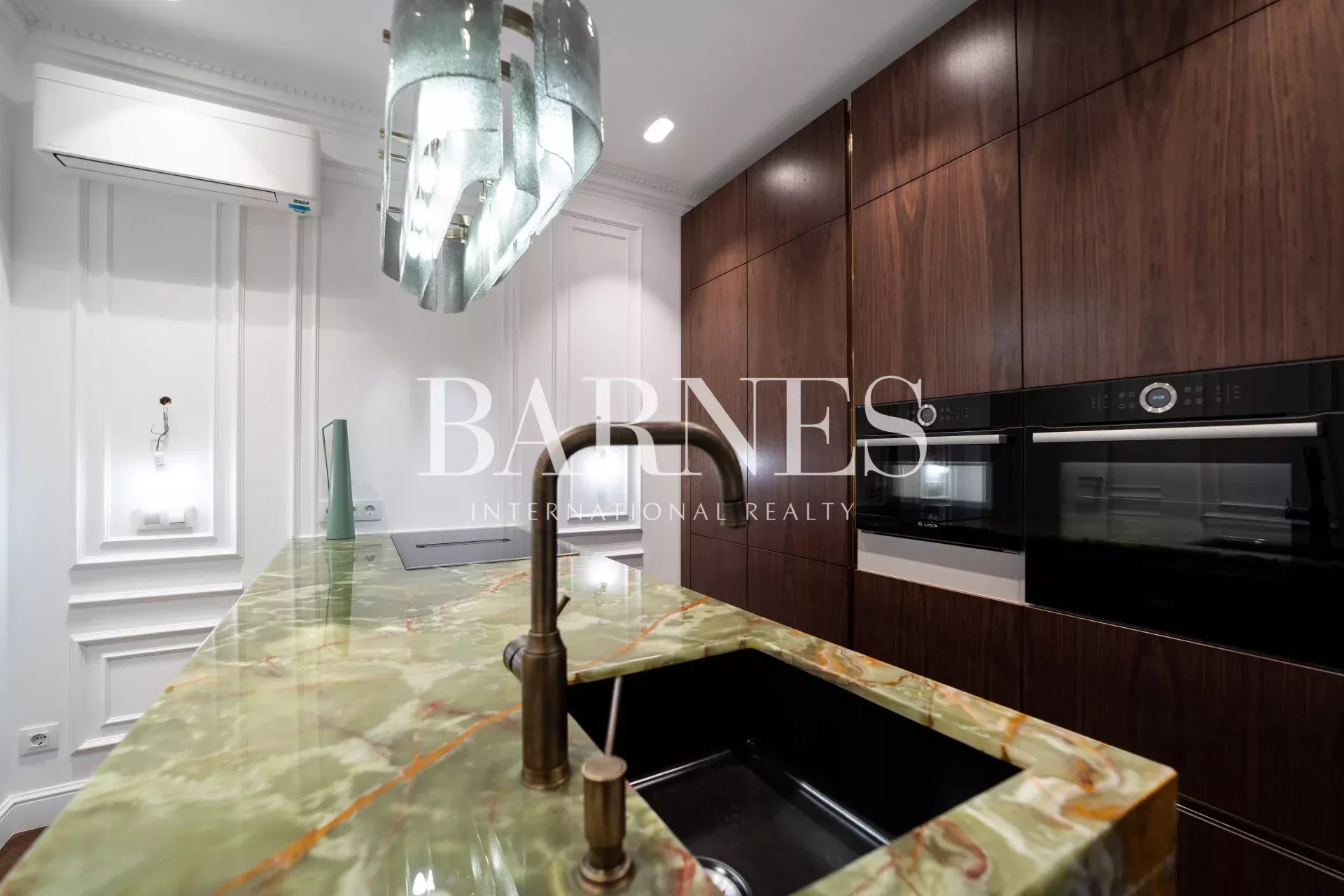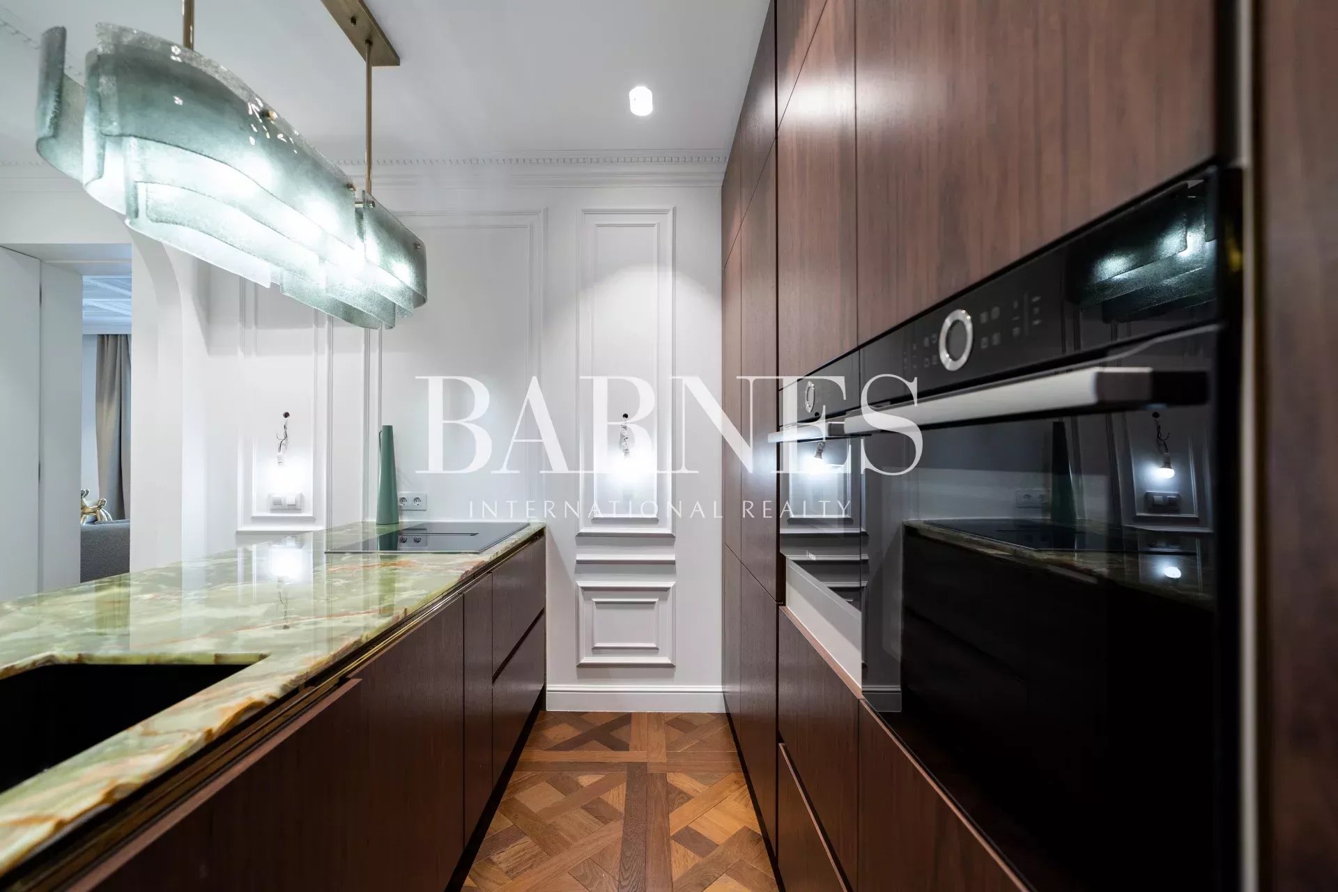 The stylish and highly functional kitchen is equipped with premium appliances and features a stunning backlit onyx countertop that adds a distinctive and sophisticated touch.