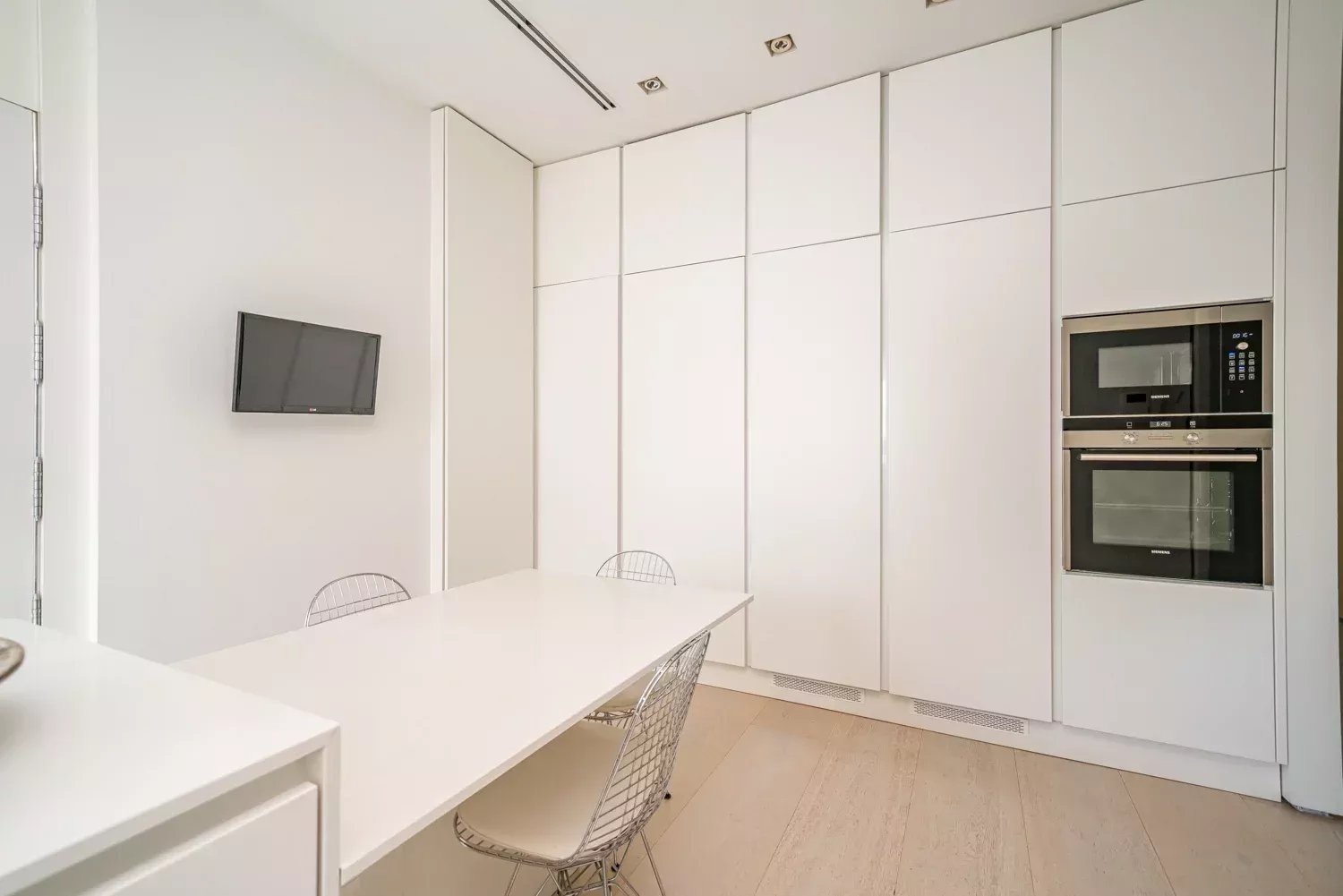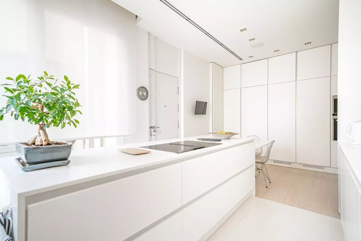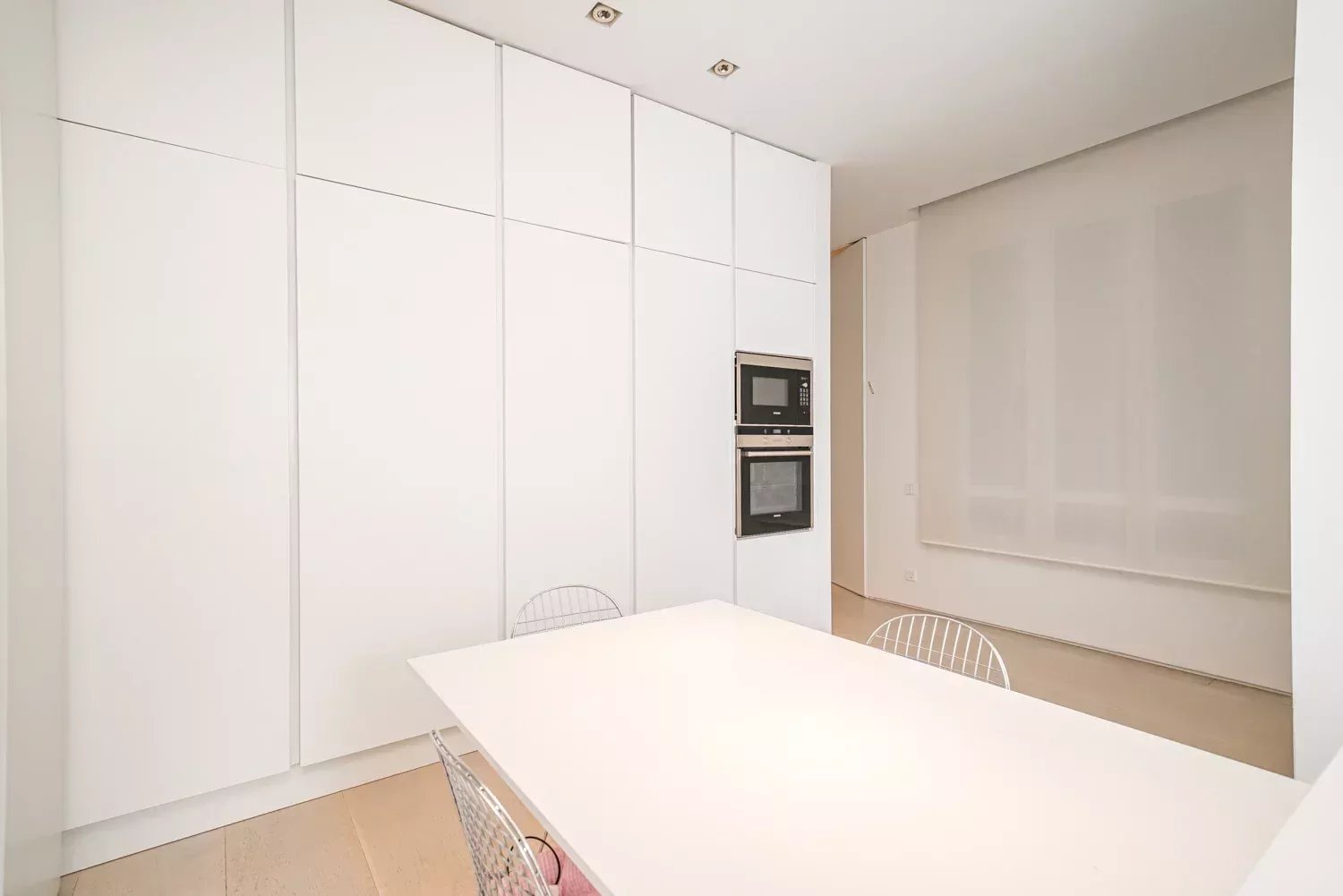The night area comprises three spacious bedrooms, all with en-suite bathrooms to ensure privacy and comfort. The exquisitely designed kitchen includes a large central island and leading-brand appliances, with a practical, functional configuration where natural light takes center stage. This level of detail meets the expectations of buyers comparing luxury apartments for sale in Madrid and valuing move-in-ready prime homes.