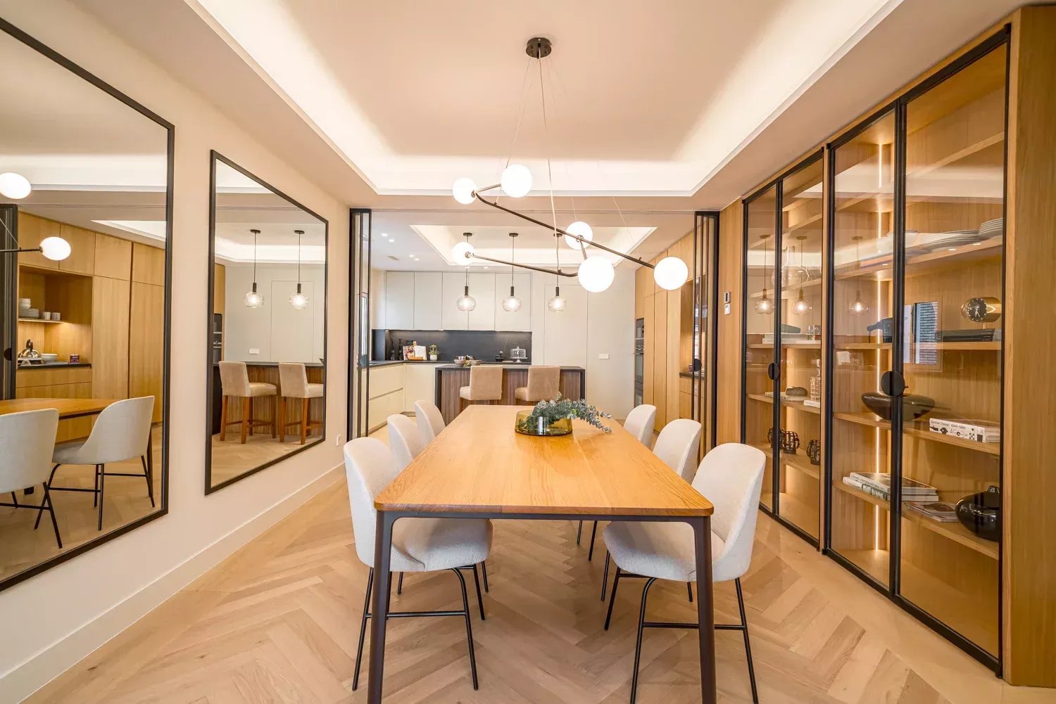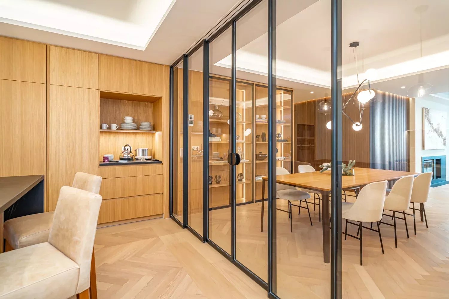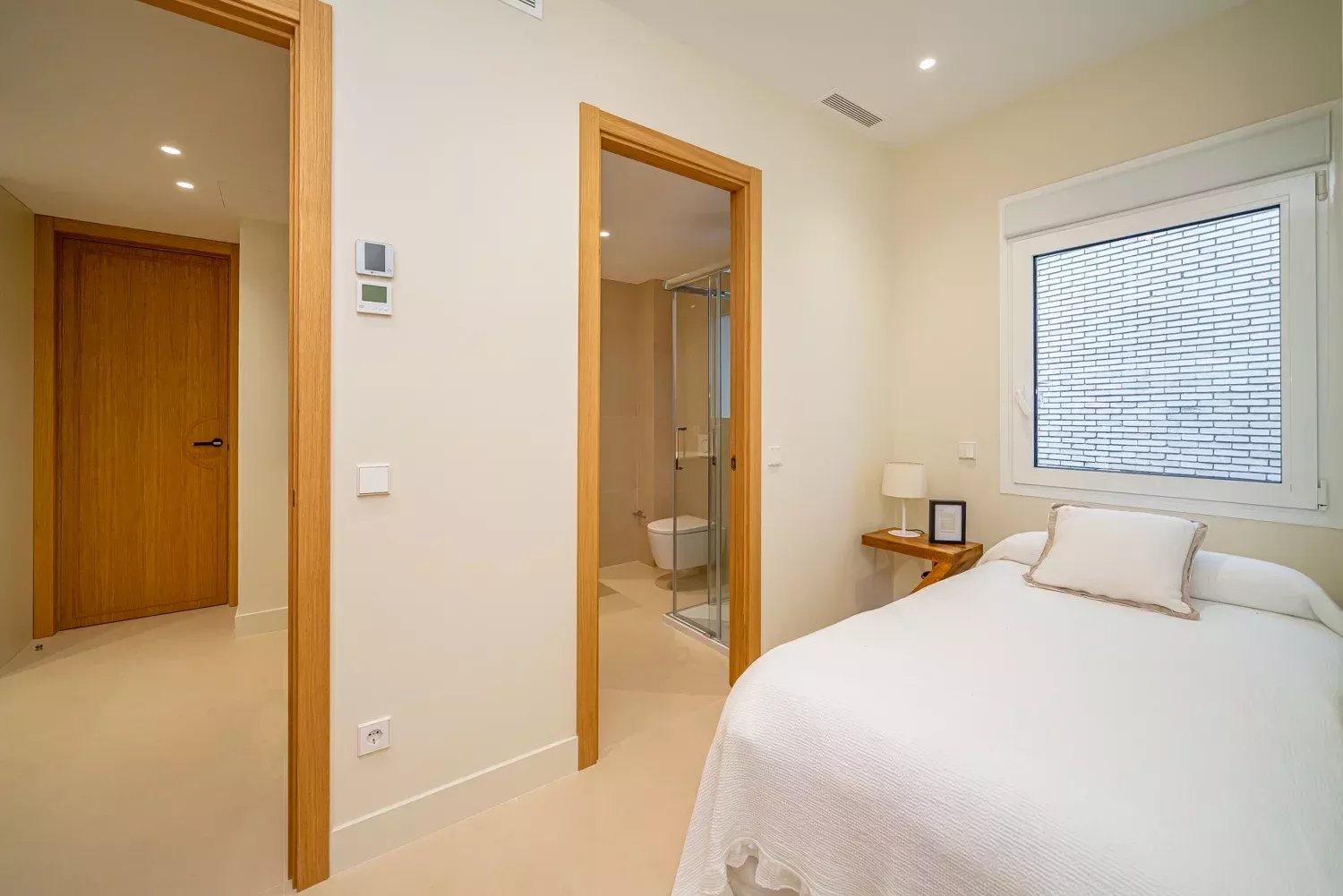 The day area includes an entrance hall, a living room with access to a large terrace boasting privileged views and the option to enclose it for year-round use. The kitchen, equipped with a central island and state-of-the-art appliances, is separated from the dining room by sliding glass doors, designed for gastronomy enthusiasts.