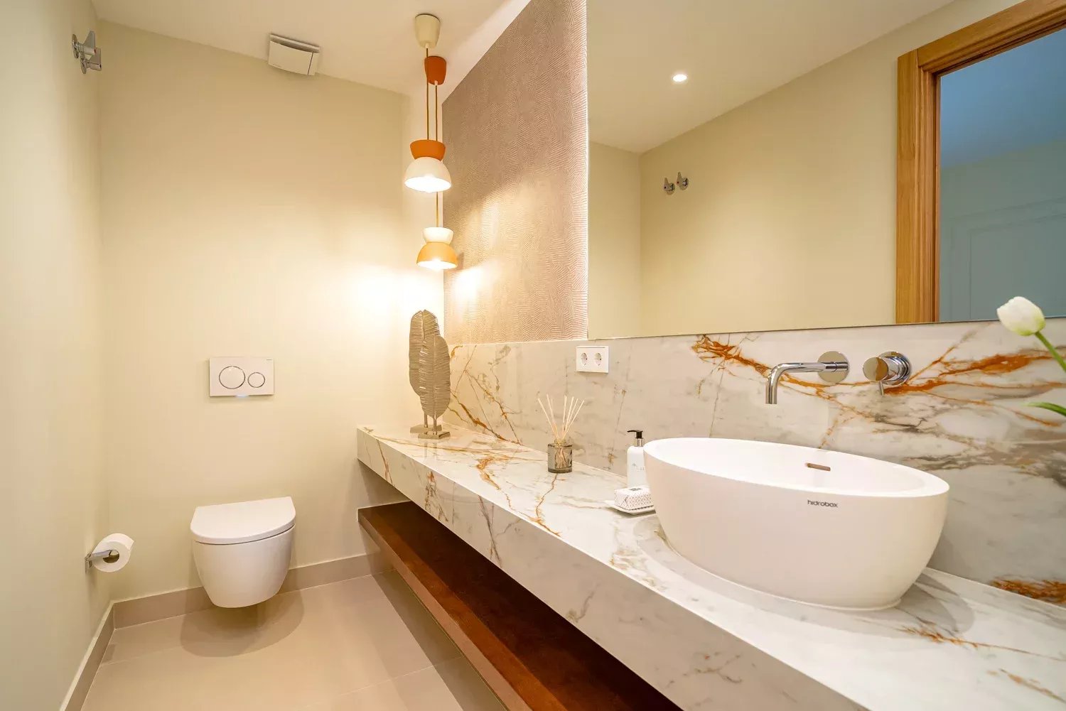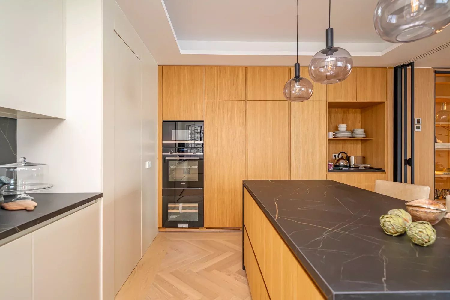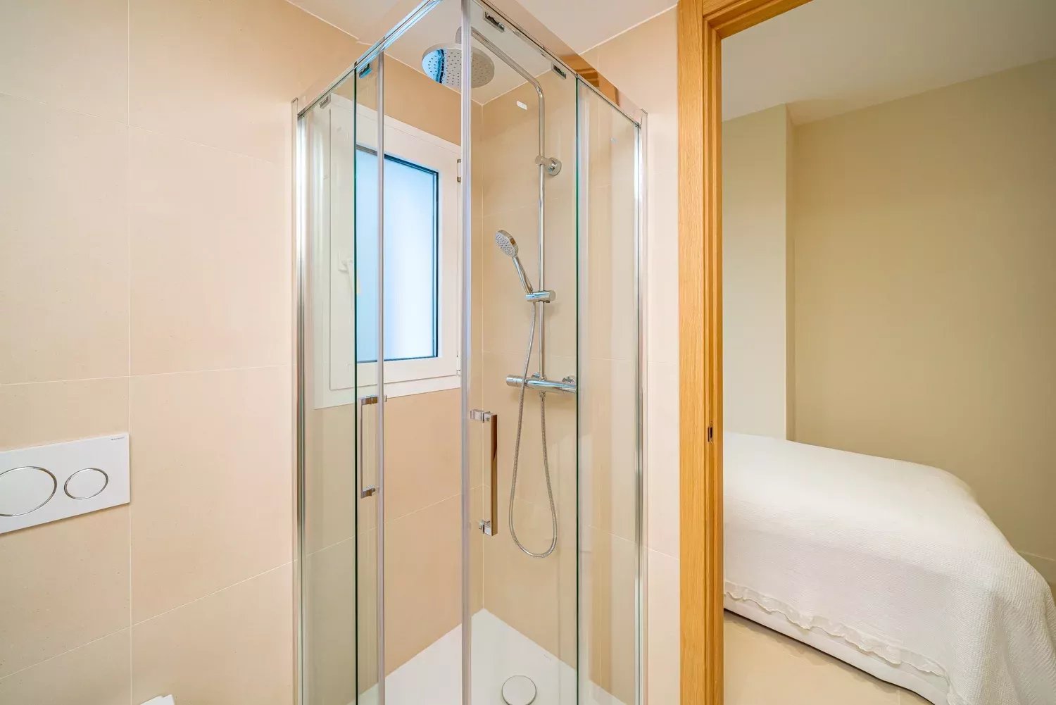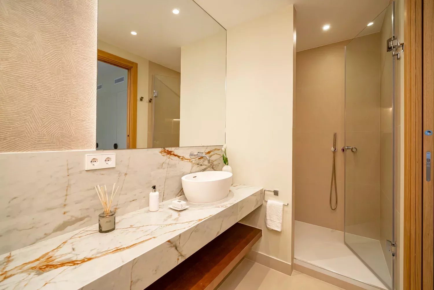 The day area includes an entrance hall, a living room with access to a large terrace boasting privileged views and the option to enclose it for year-round use. The kitchen, equipped with a central island and state-of-the-art appliances, is separated from the dining room by sliding glass doors, designed for gastronomy enthusiasts.