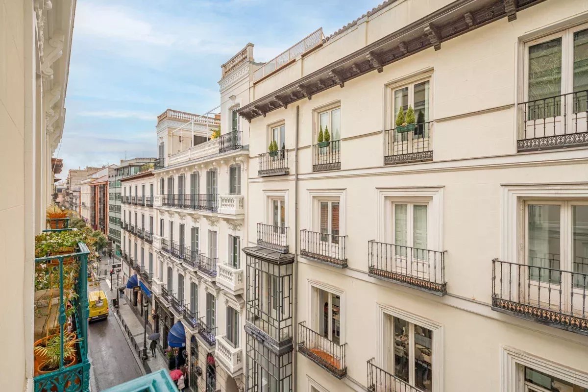 The apartment features nine balconies—seven facing Almirante Street and two overlooking Barquillo Street—and all rooms are exterior-facing, ensuring abundant natural light.