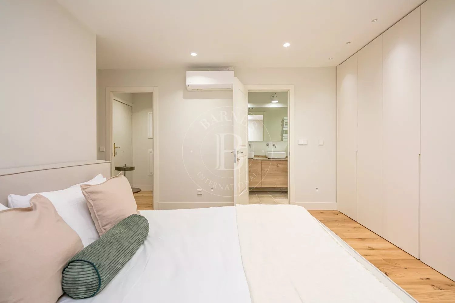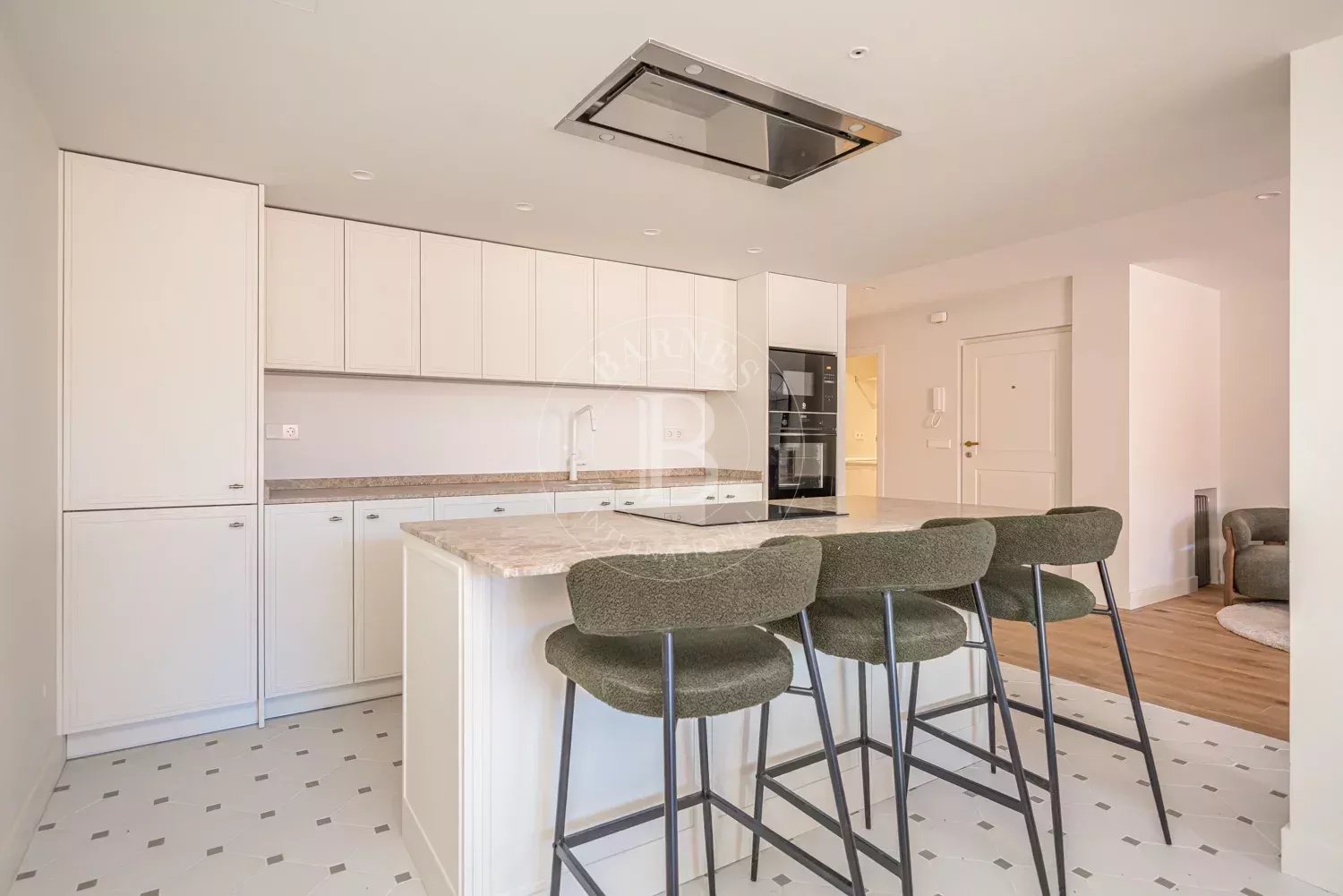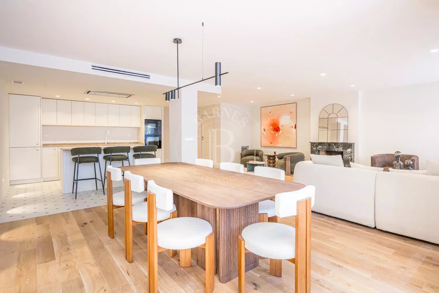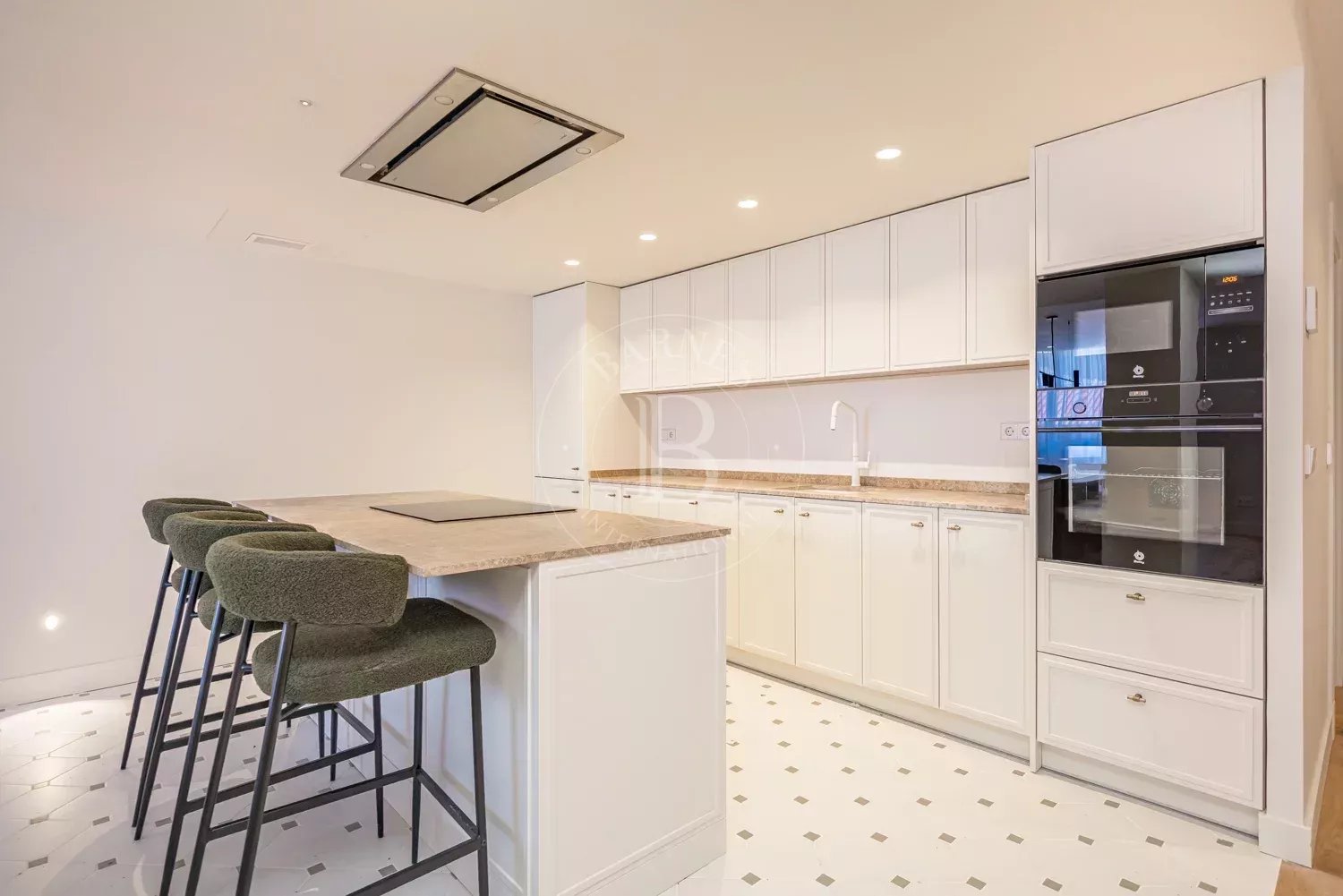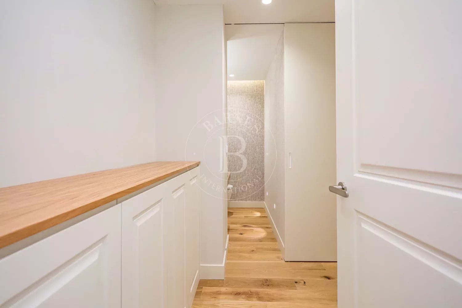 The renovation incorporates natural wood flooring, lacquered woodwork, combined direct and indirect lighting and a bespoke kitchen in soft tones with a central island, top-of-the-range appliances and a separate laundry area. The sleeping area consists of three spacious bedrooms, all with bespoke wardrobes, and three full bathrooms in microcement and porcelain, equipped with built-in taps and modern showers. The property also includes a storage room and a parking space on the premises.