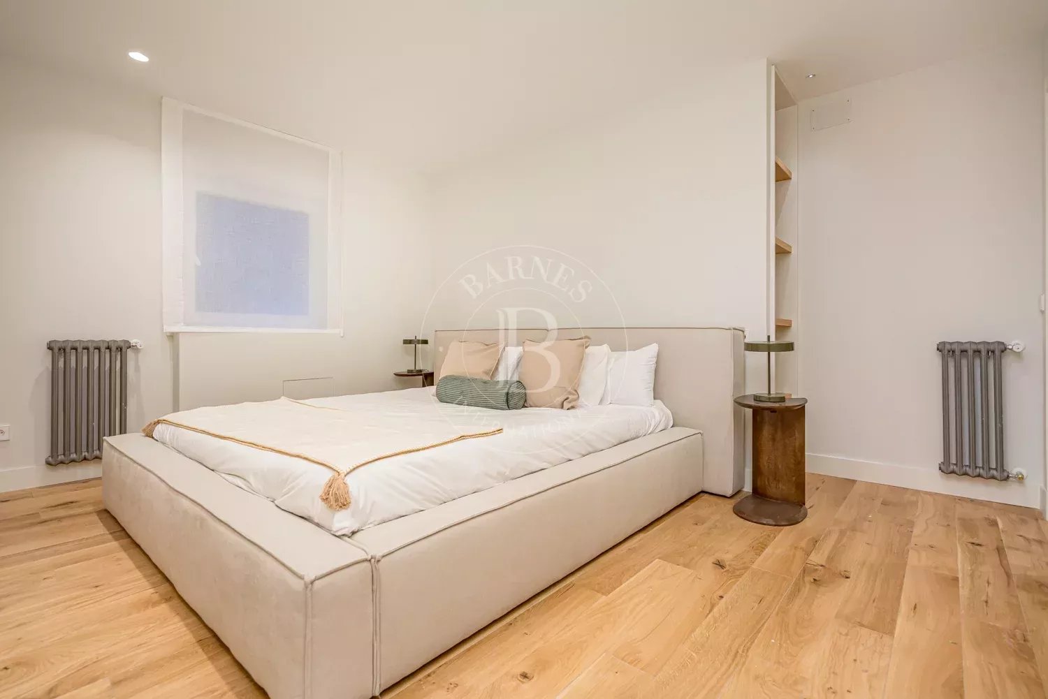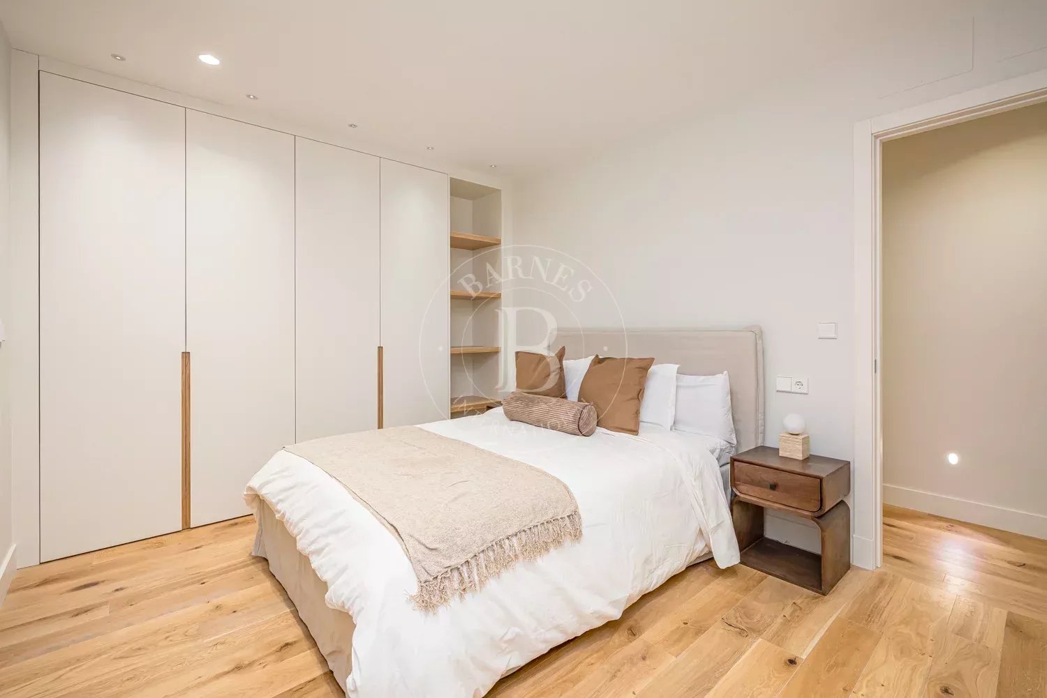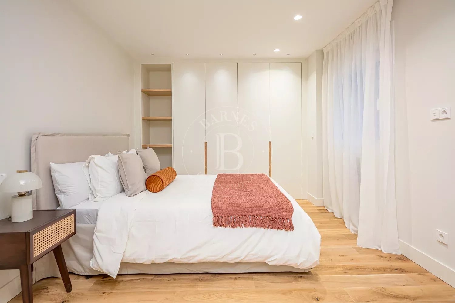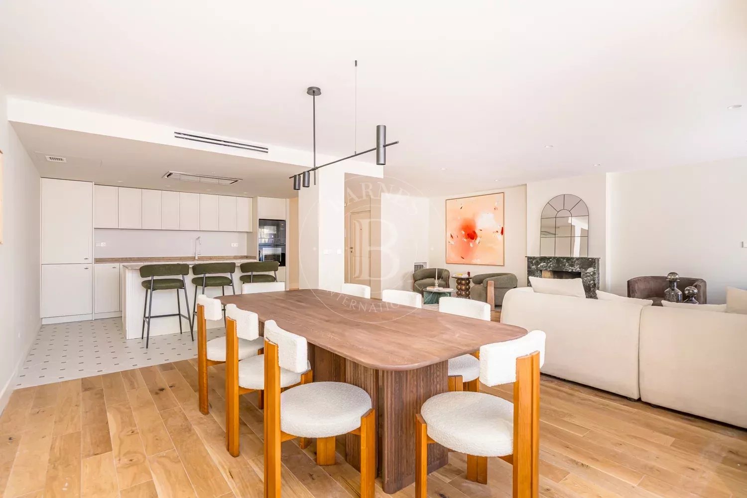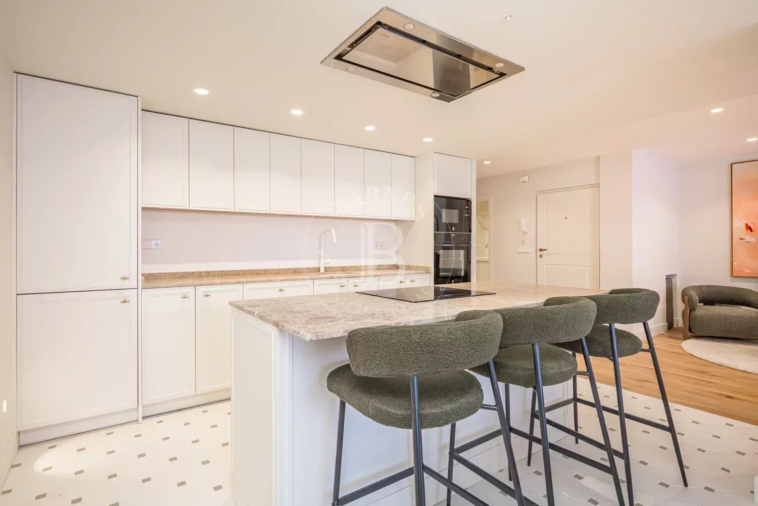 The renovation incorporates natural wood flooring, lacquered woodwork, combined direct and indirect lighting and a bespoke kitchen in soft tones with a central island, top-of-the-range appliances and a separate laundry area. The sleeping area consists of three spacious bedrooms, all with bespoke wardrobes, and three full bathrooms in microcement and porcelain, equipped with built-in taps and modern showers. The property also includes a storage room and a parking space on the premises.