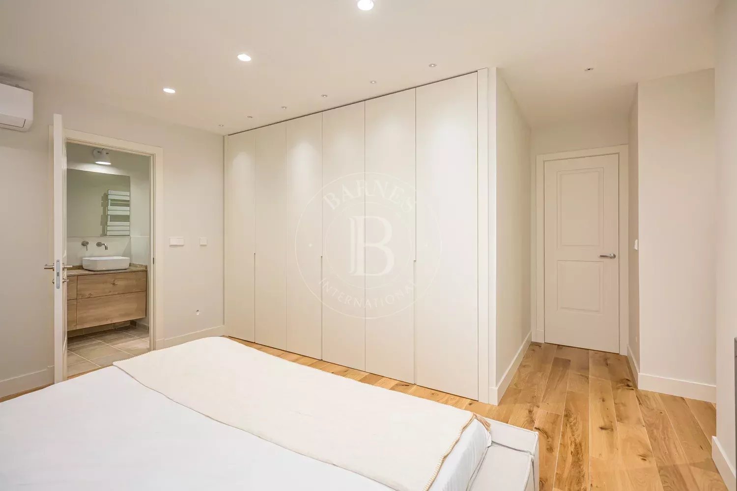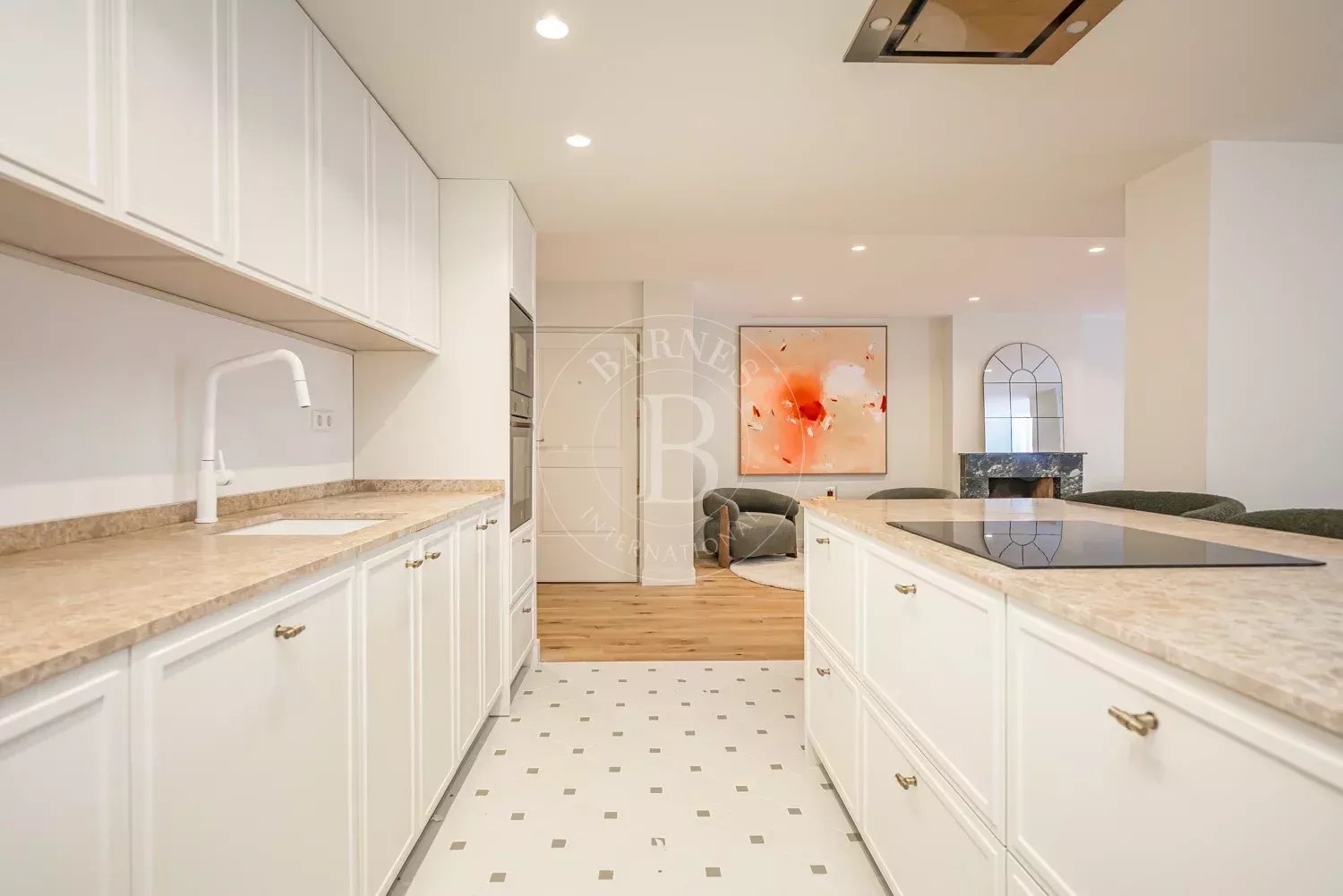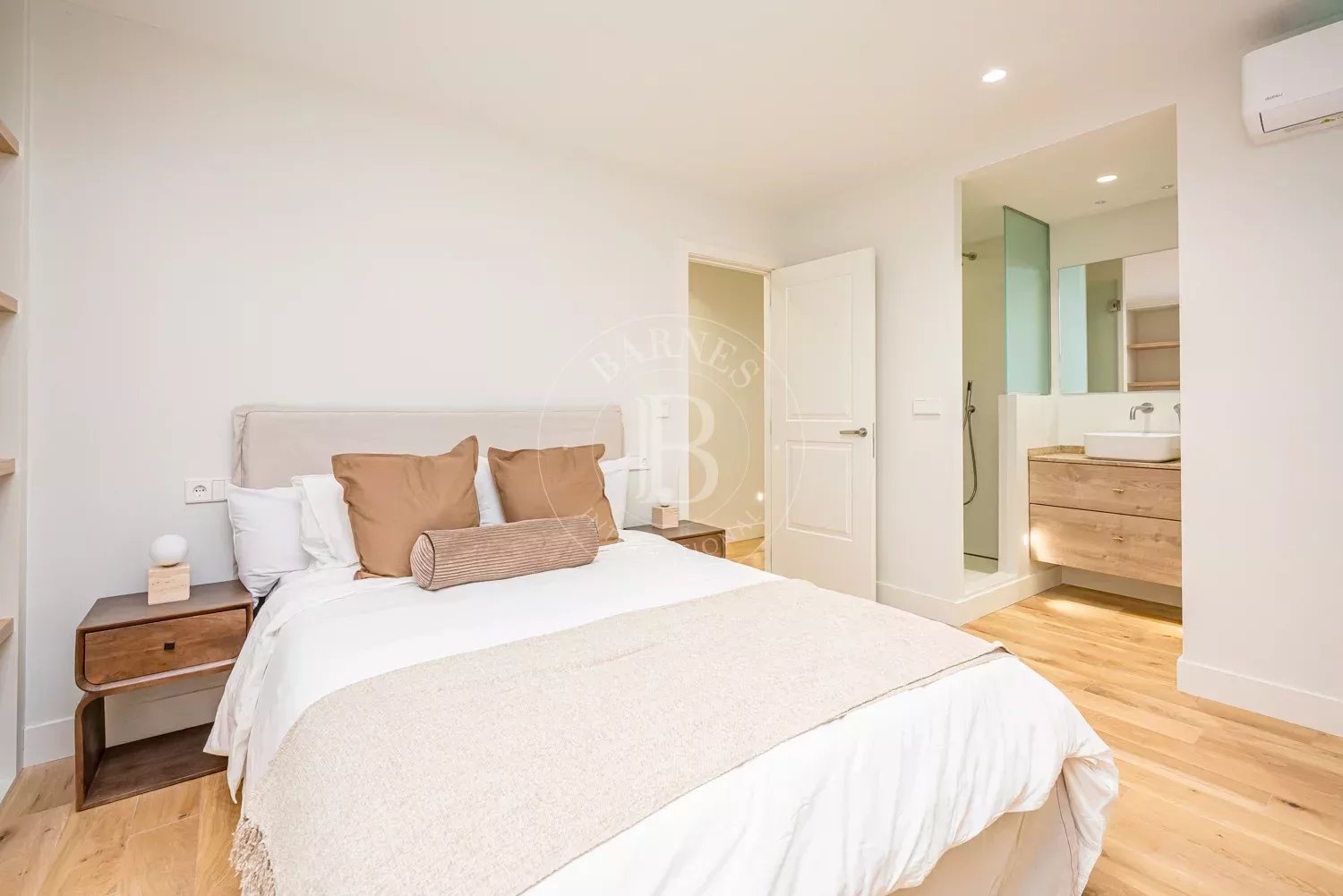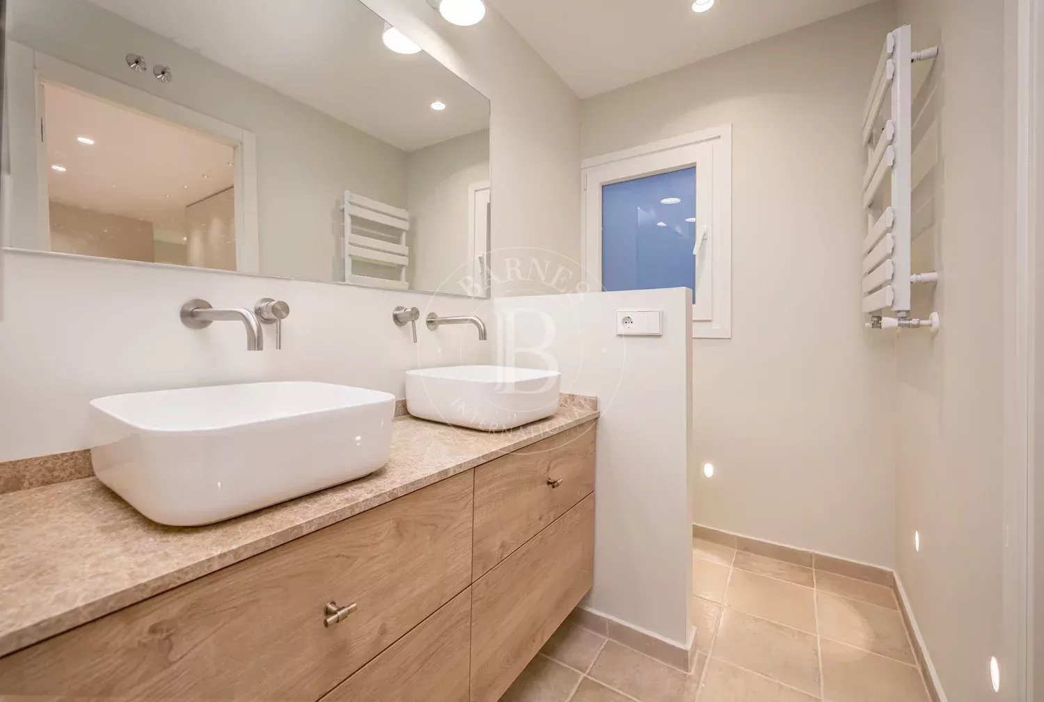 The renovation incorporates natural wood flooring, lacquered woodwork, combined direct and indirect lighting and a bespoke kitchen in soft tones with a central island, top-of-the-range appliances and a separate laundry area. The sleeping area consists of three spacious bedrooms, all with bespoke wardrobes, and three full bathrooms in microcement and porcelain, equipped with built-in taps and modern showers. The property also includes a storage room and a parking space on the premises.