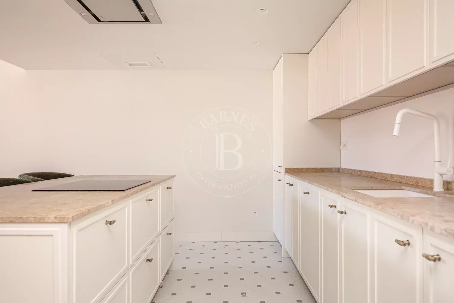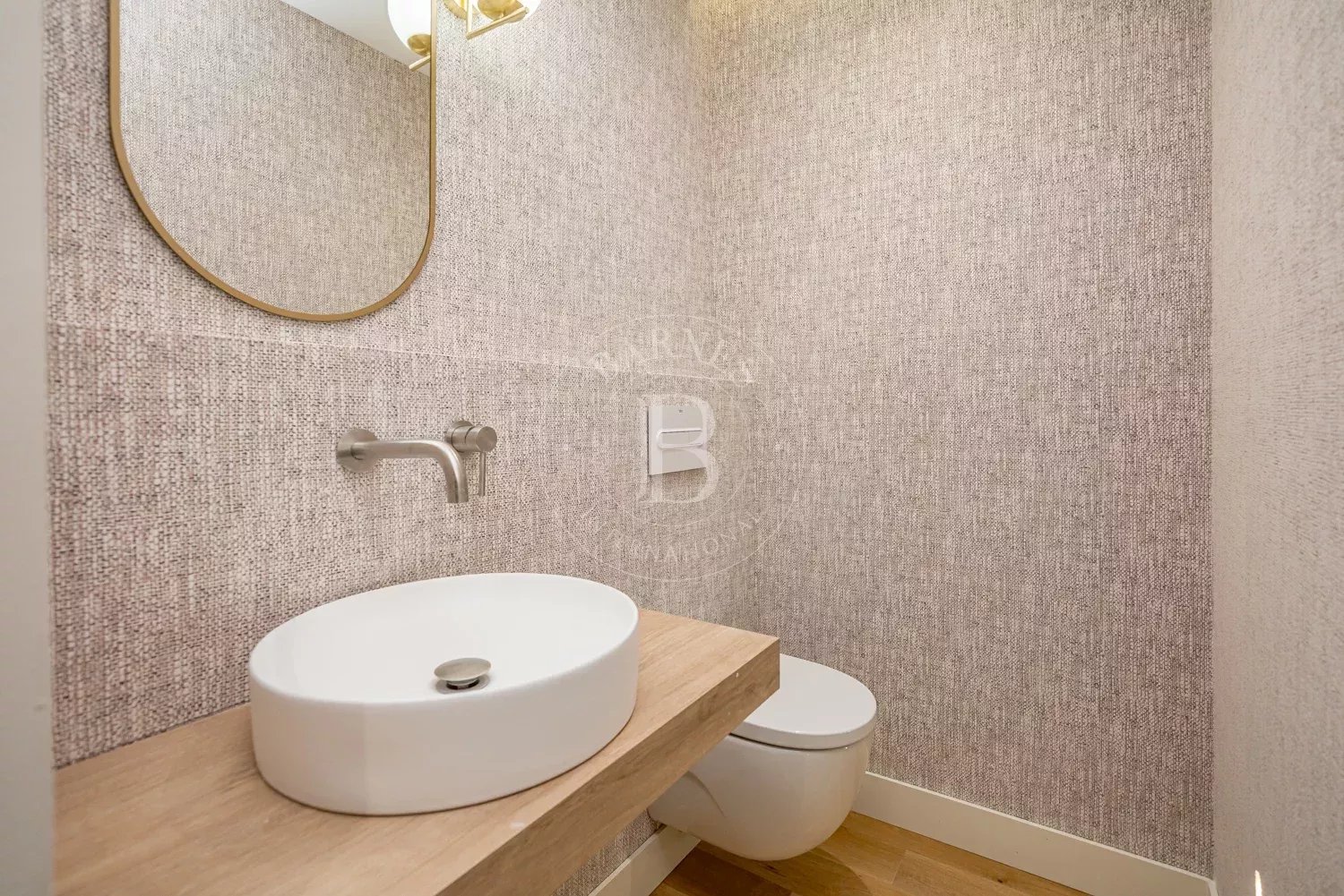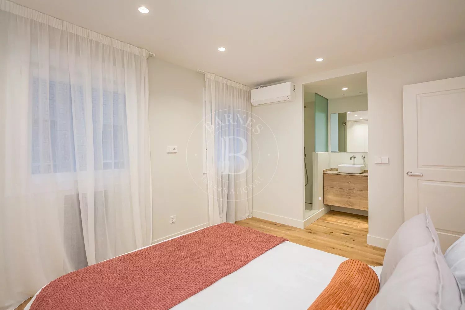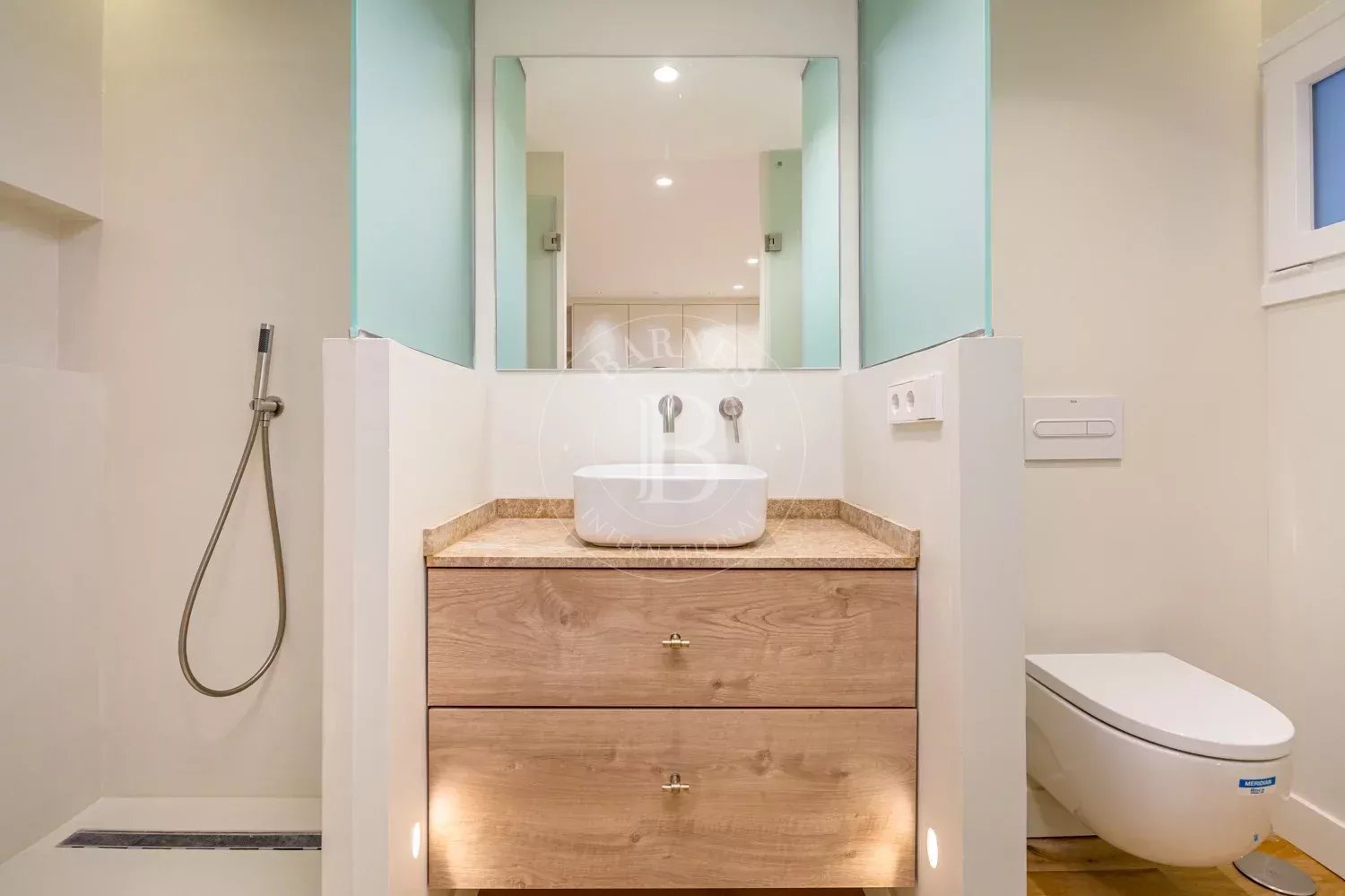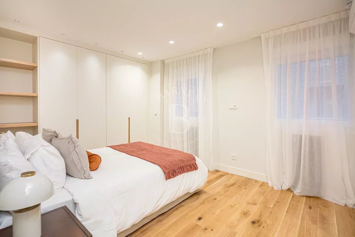 The renovation incorporates natural wood flooring, lacquered woodwork, combined direct and indirect lighting and a bespoke kitchen in soft tones with a central island, top-of-the-range appliances and a separate laundry area. The sleeping area consists of three spacious bedrooms, all with bespoke wardrobes, and three full bathrooms in microcement and porcelain, equipped with built-in taps and modern showers. The property also includes a storage room and a parking space on the premises.