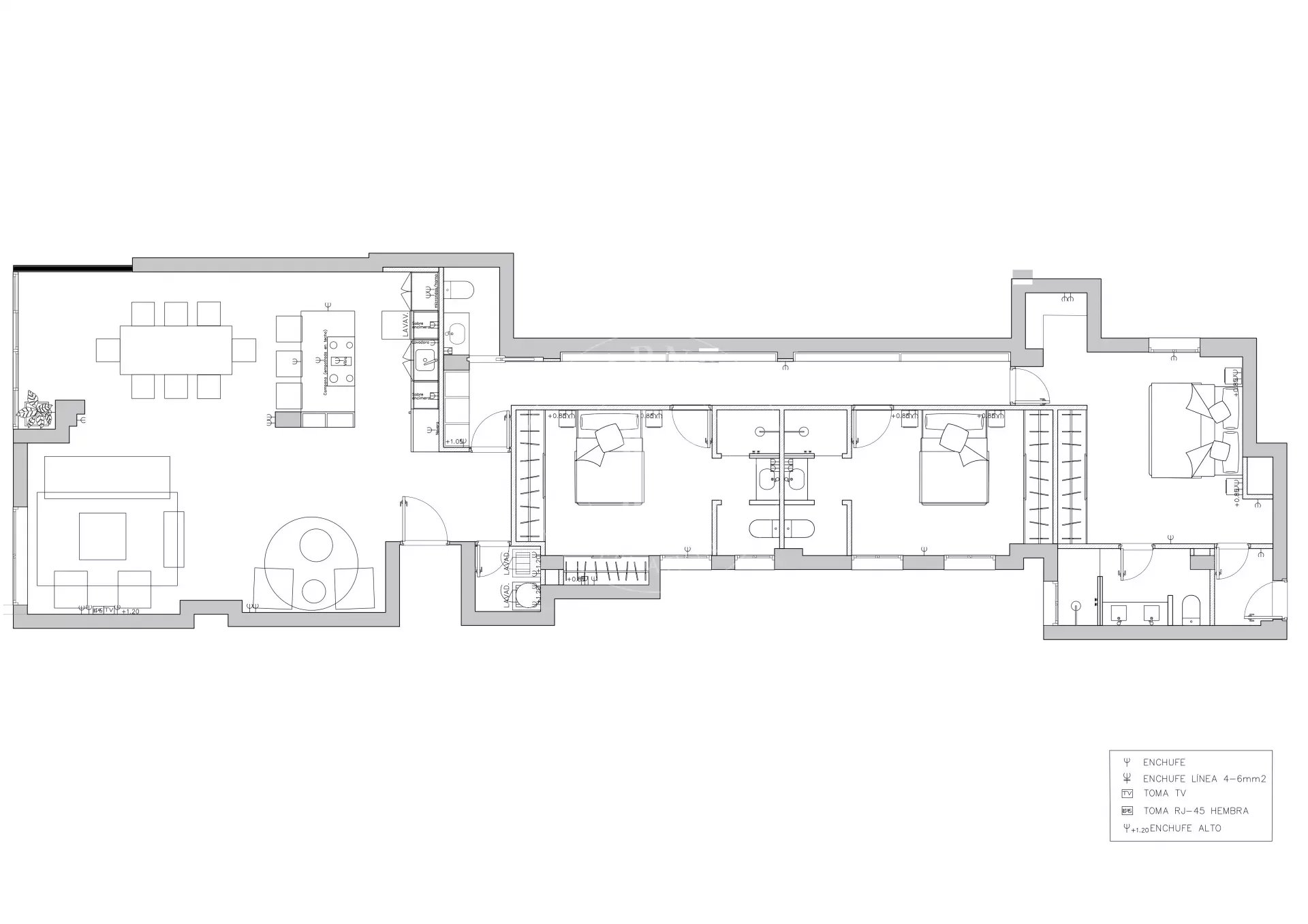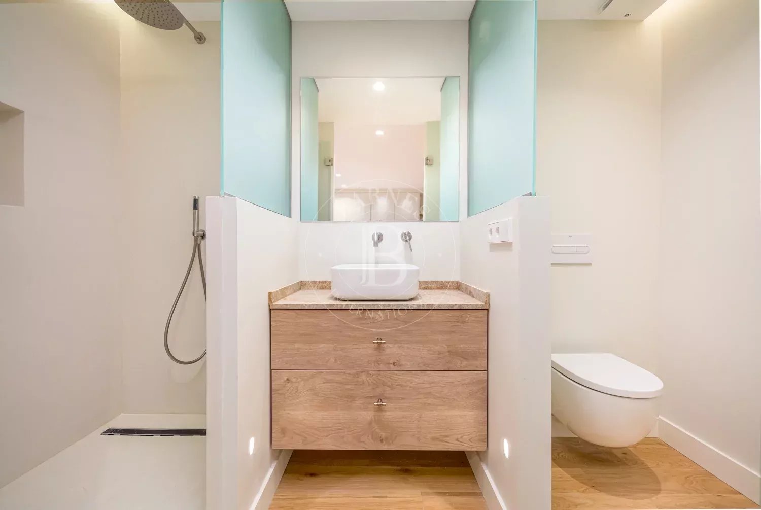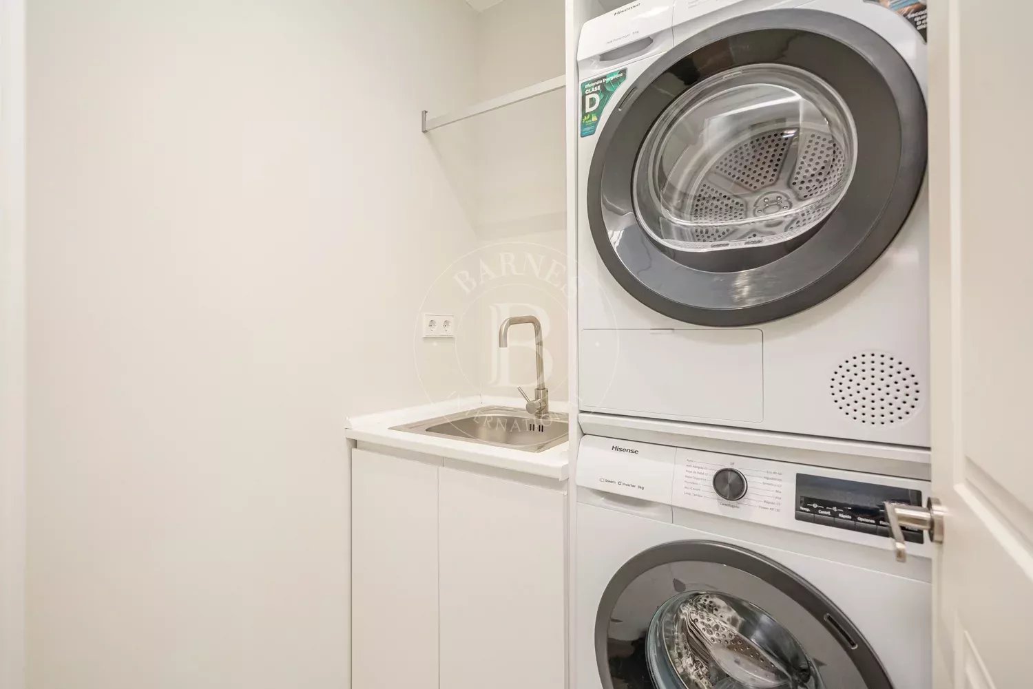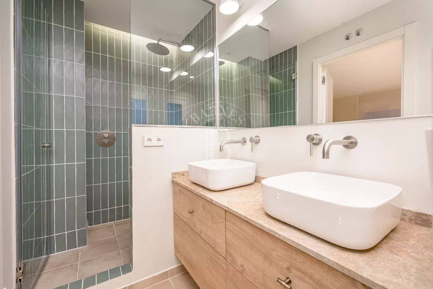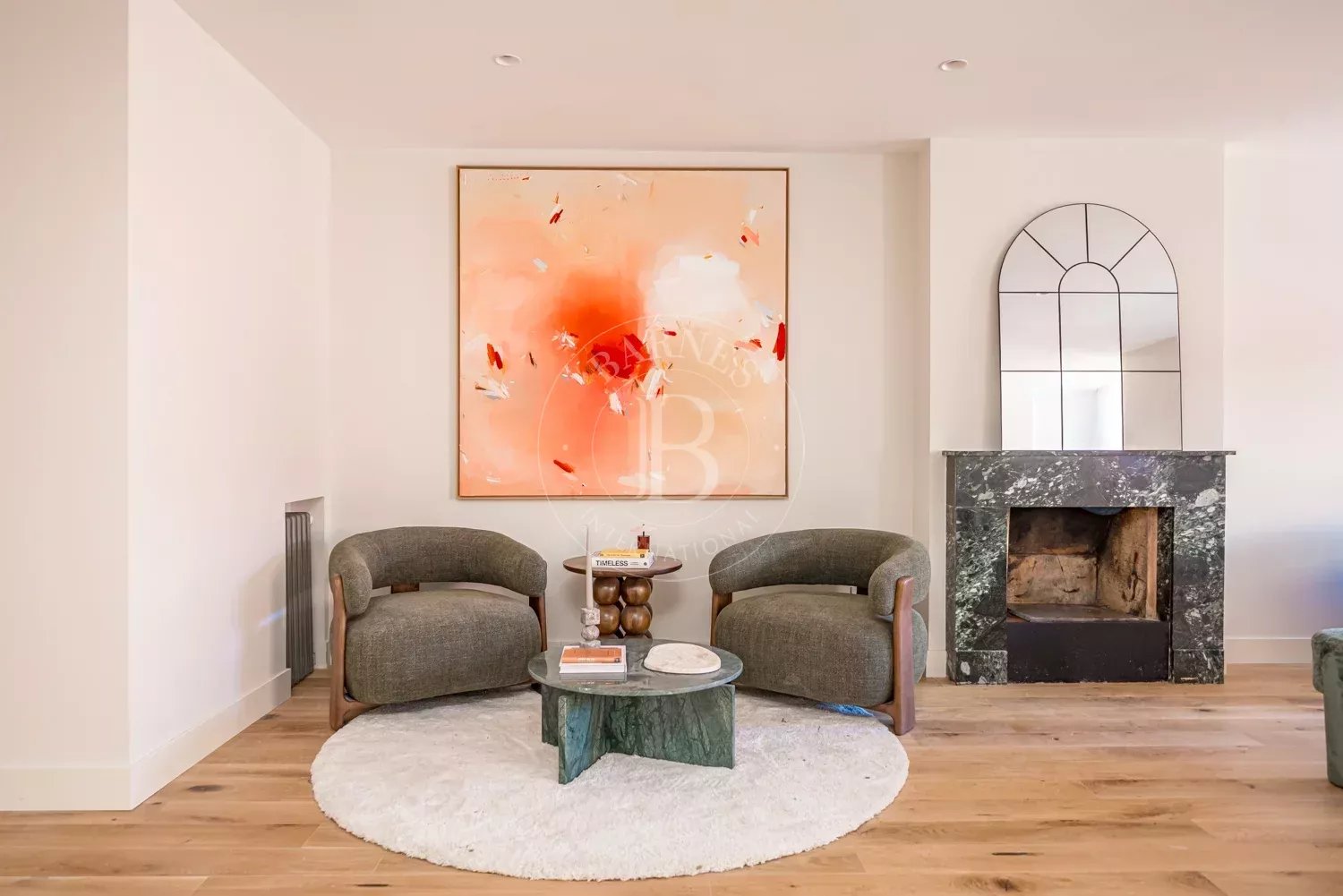 The renovation incorporates natural wood flooring, lacquered woodwork, combined direct and indirect lighting and a bespoke kitchen in soft tones with a central island, top-of-the-range appliances and a separate laundry area. The sleeping area consists of three spacious bedrooms, all with bespoke wardrobes, and three full bathrooms in microcement and porcelain, equipped with built-in taps and modern showers. The property also includes a storage room and a parking space on the premises.