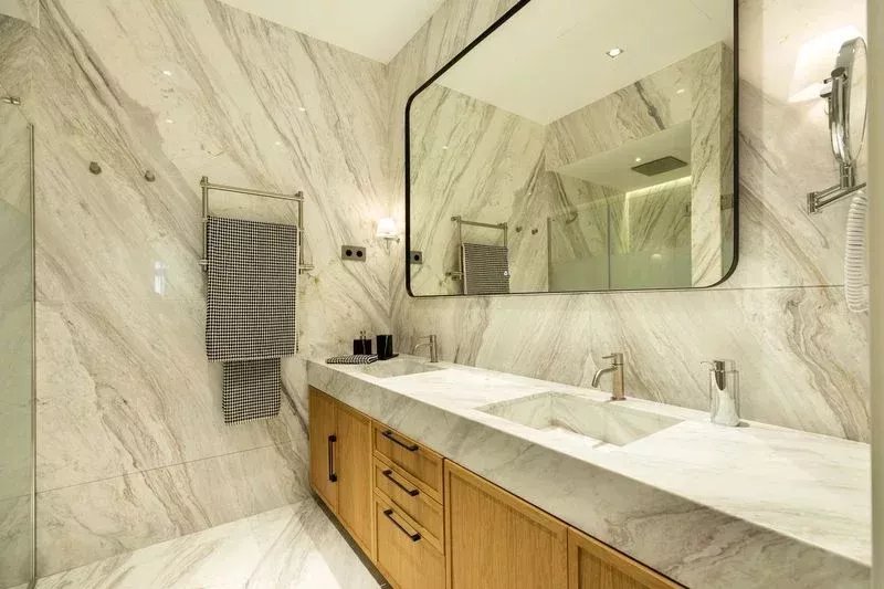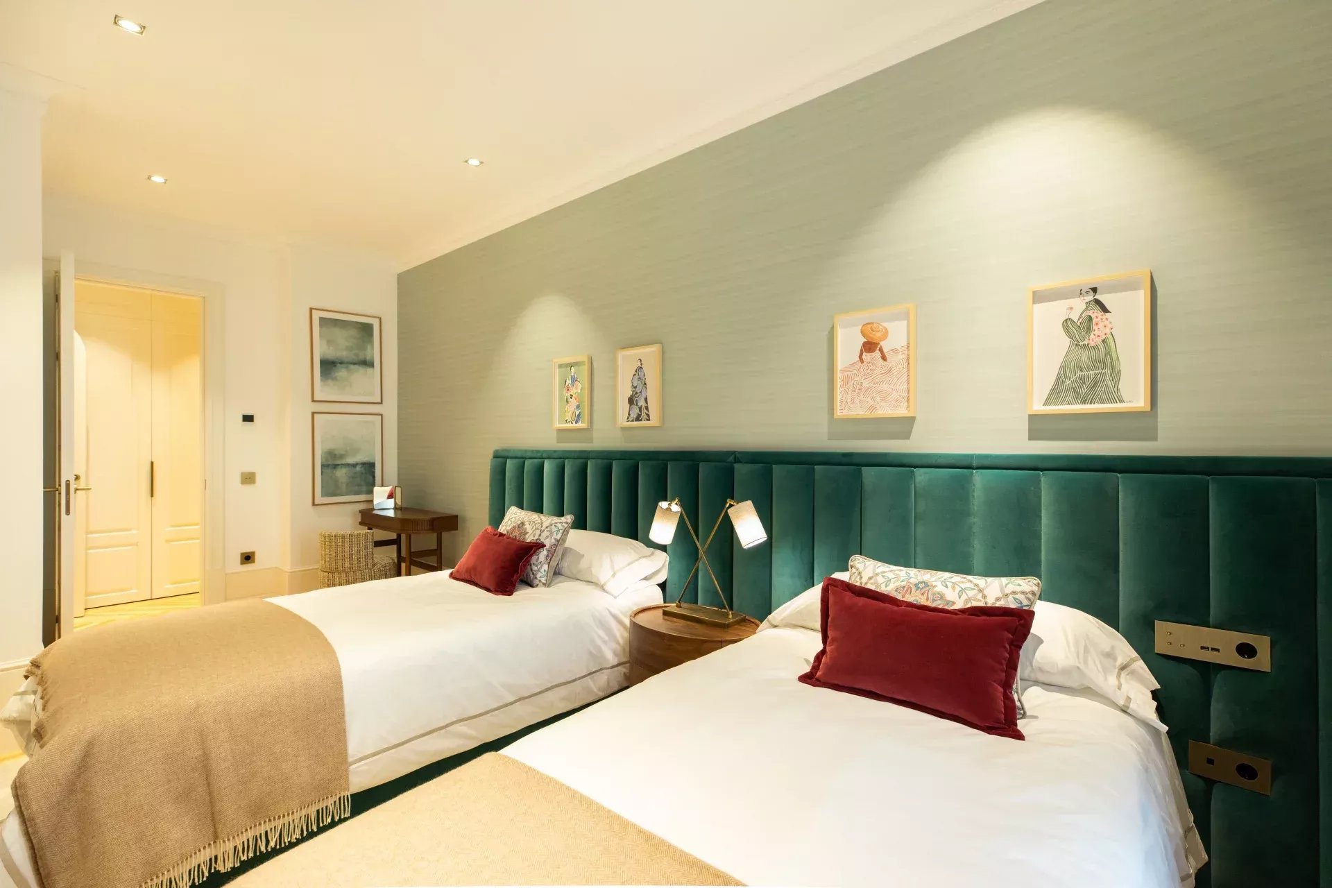 The private area features two double bedrooms with twin beds and built-in wardrobes, in addition to a master suite with a double bed, a large walk-in closet, and an en-suite bathroom with both bathtub and shower. A fourth additional bedroom completes the layout.
