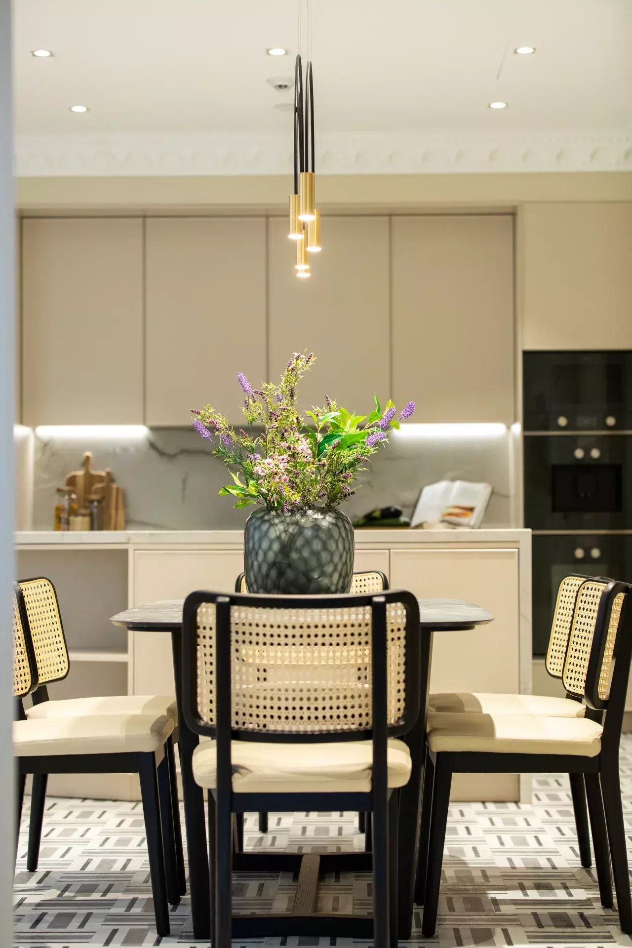The open-plan kitchen, fitted with top-of-the-line paneled appliances, includes a breakfast bar and is complemented by a separate dining room. There is also a laundry area and service quarters.