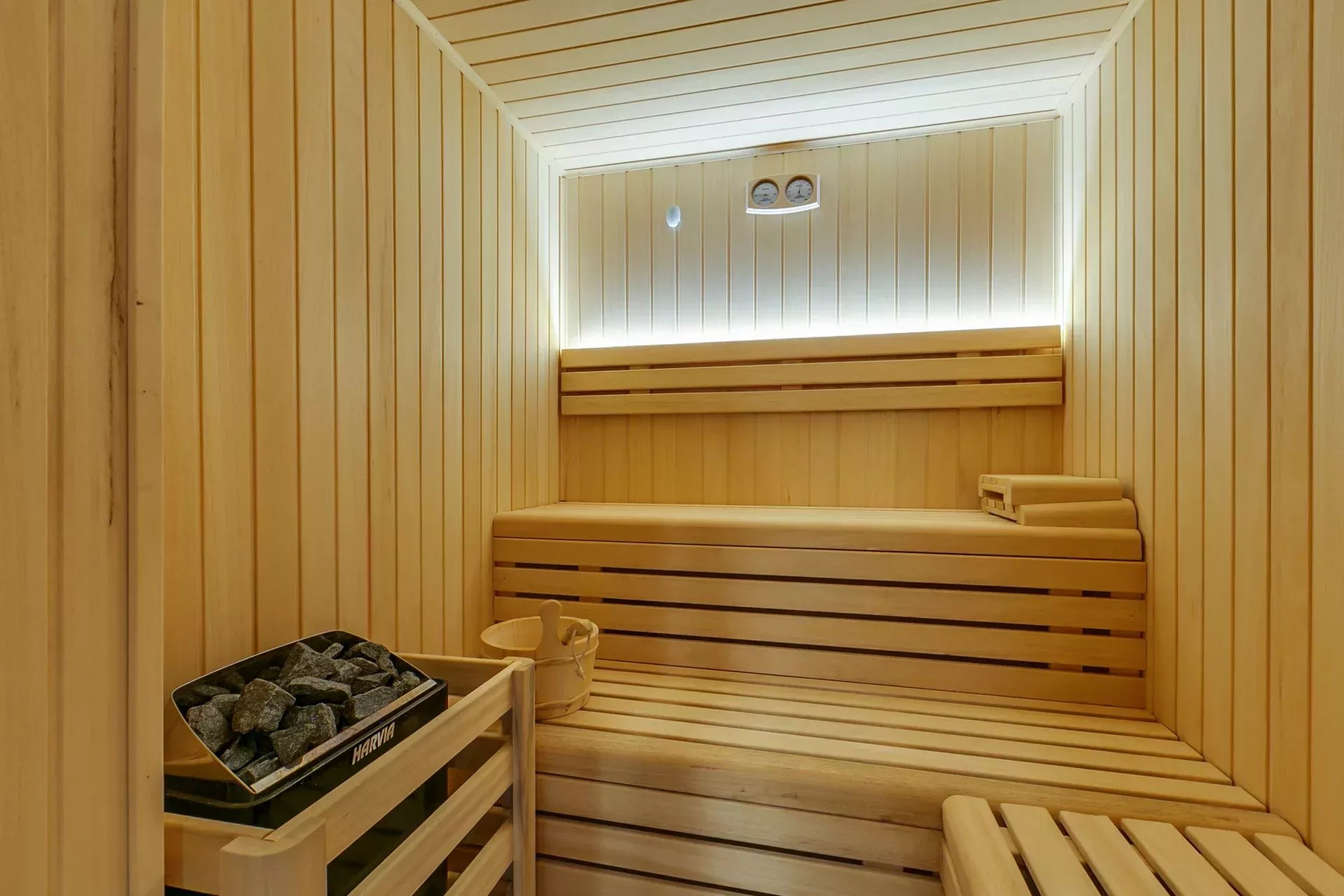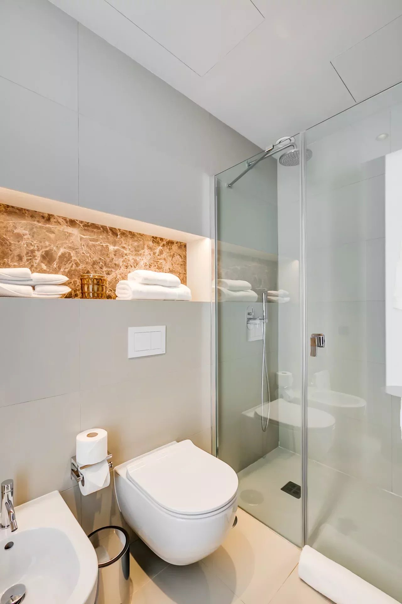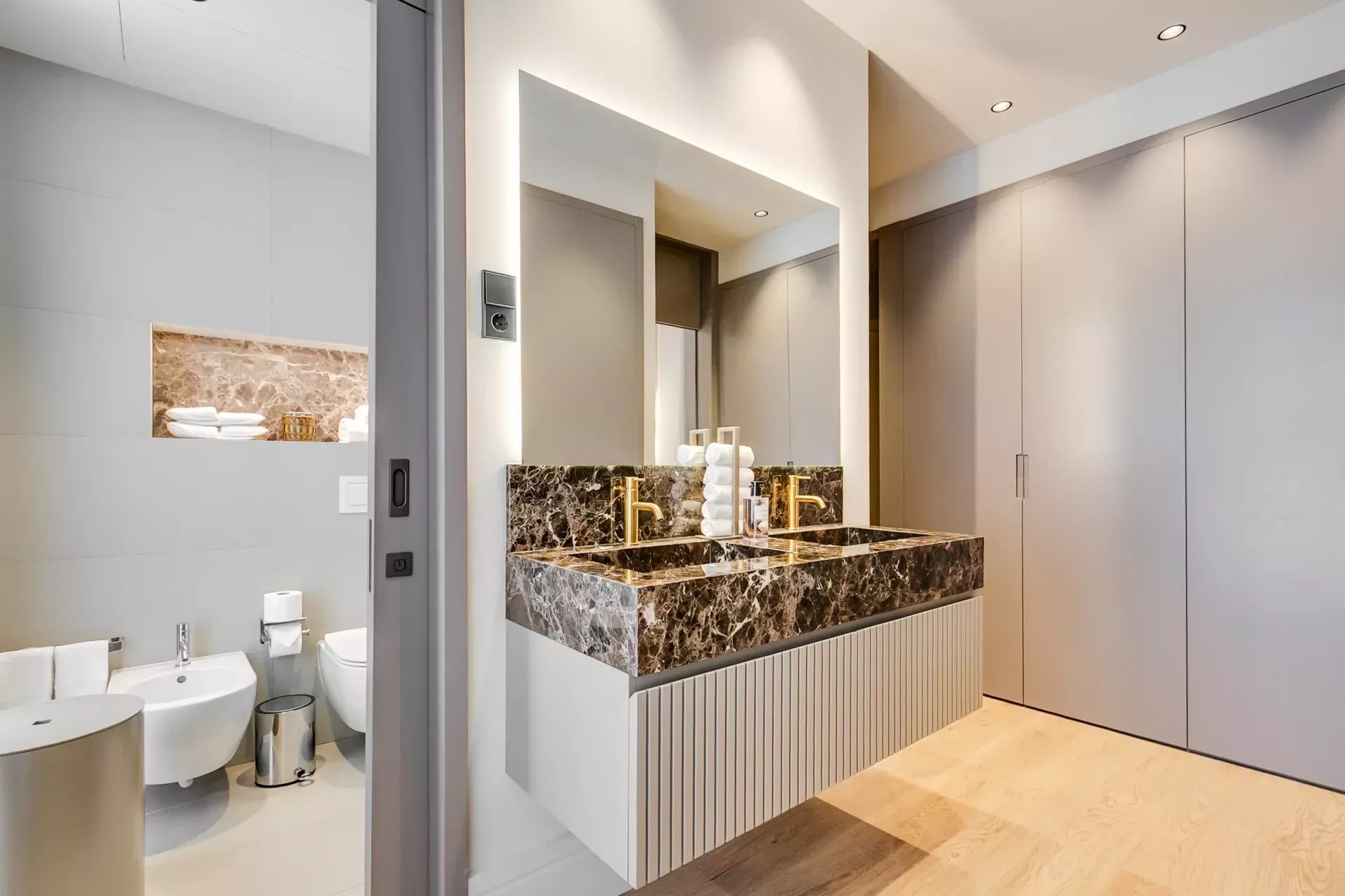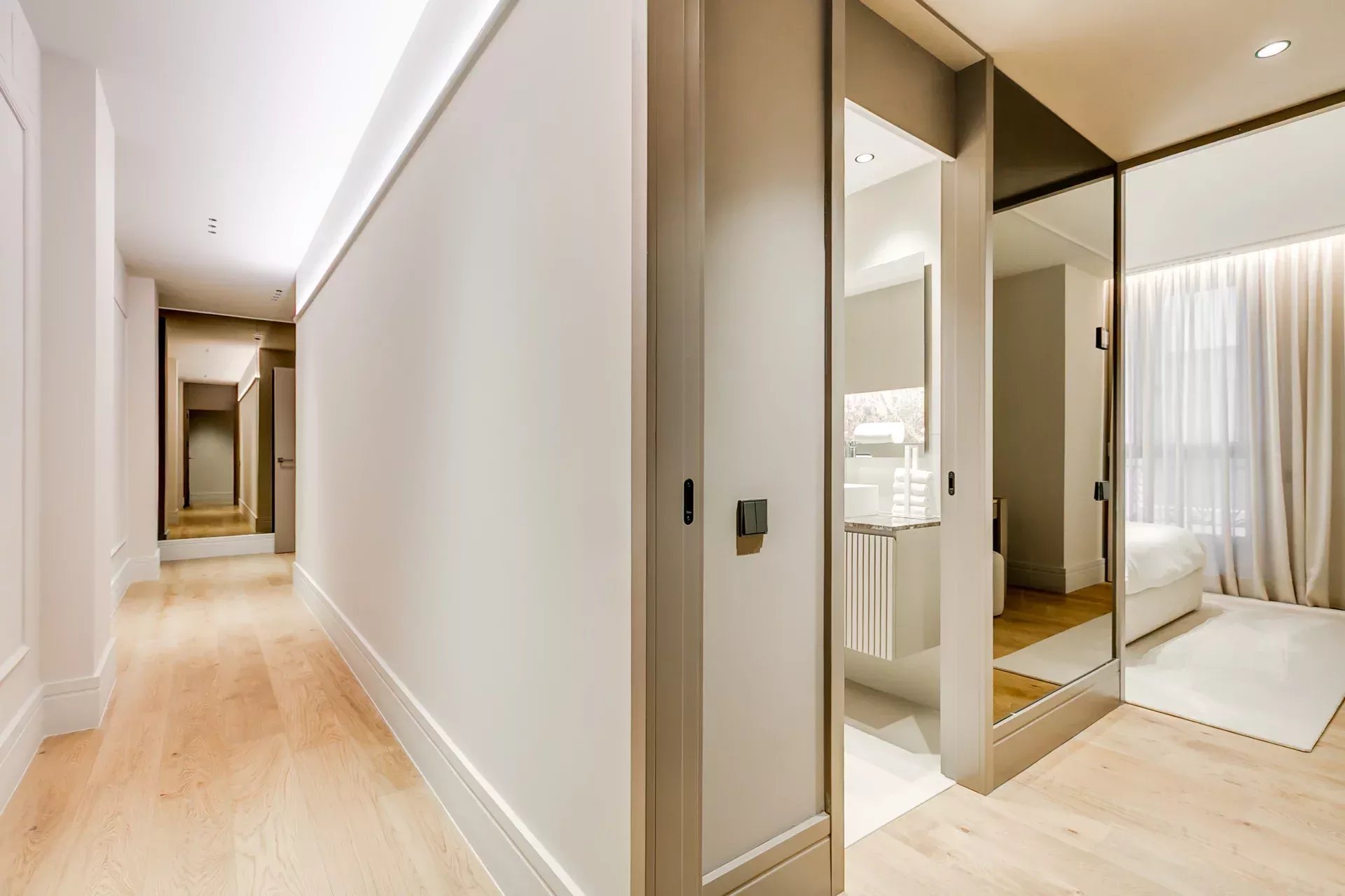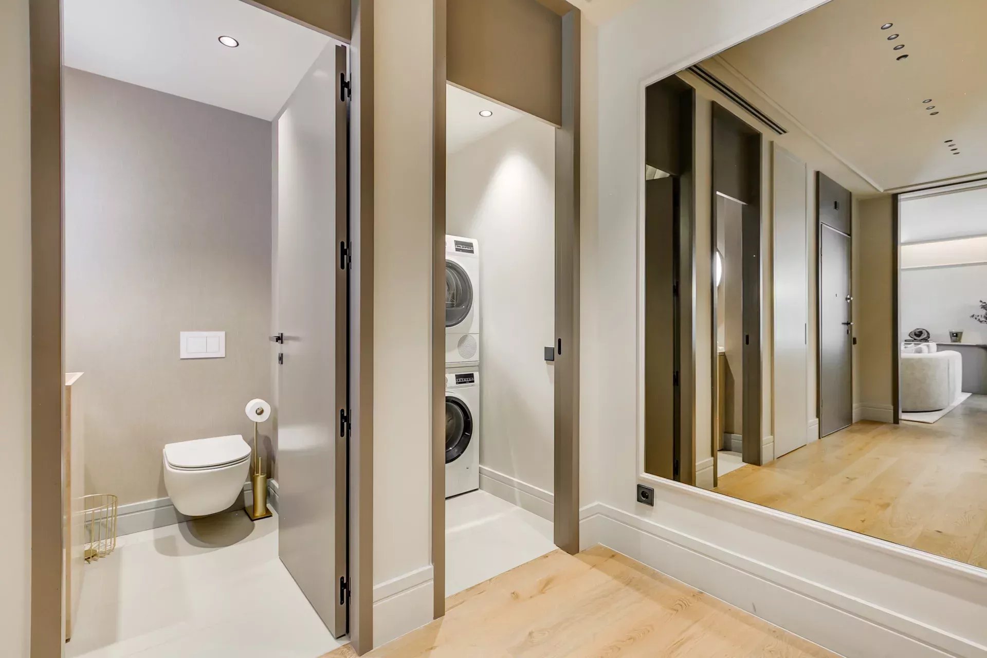The apartment boasts a generous entrance hall and corridors with motion sensor lighting, as well as carefully designed indirect lighting throughout. The modern and functional kitchen is fully equipped with high-end appliances. Additionally, there is an independent laundry room with a washer and dryer.
