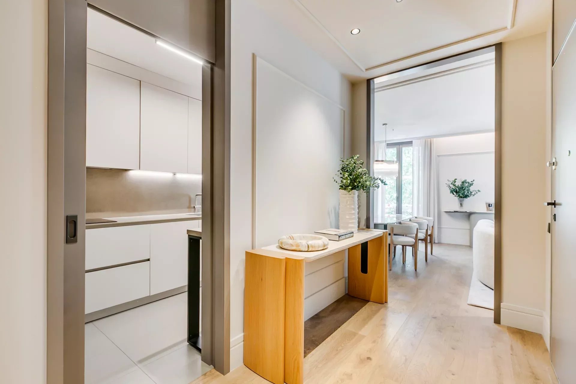The apartment has been renovated with noble materials and luxury finishes. It is furnished and decorated with designer pieces from brands like Armani Casa, Hermès, and Baccarat, creating a sophisticated and welcoming atmosphere.