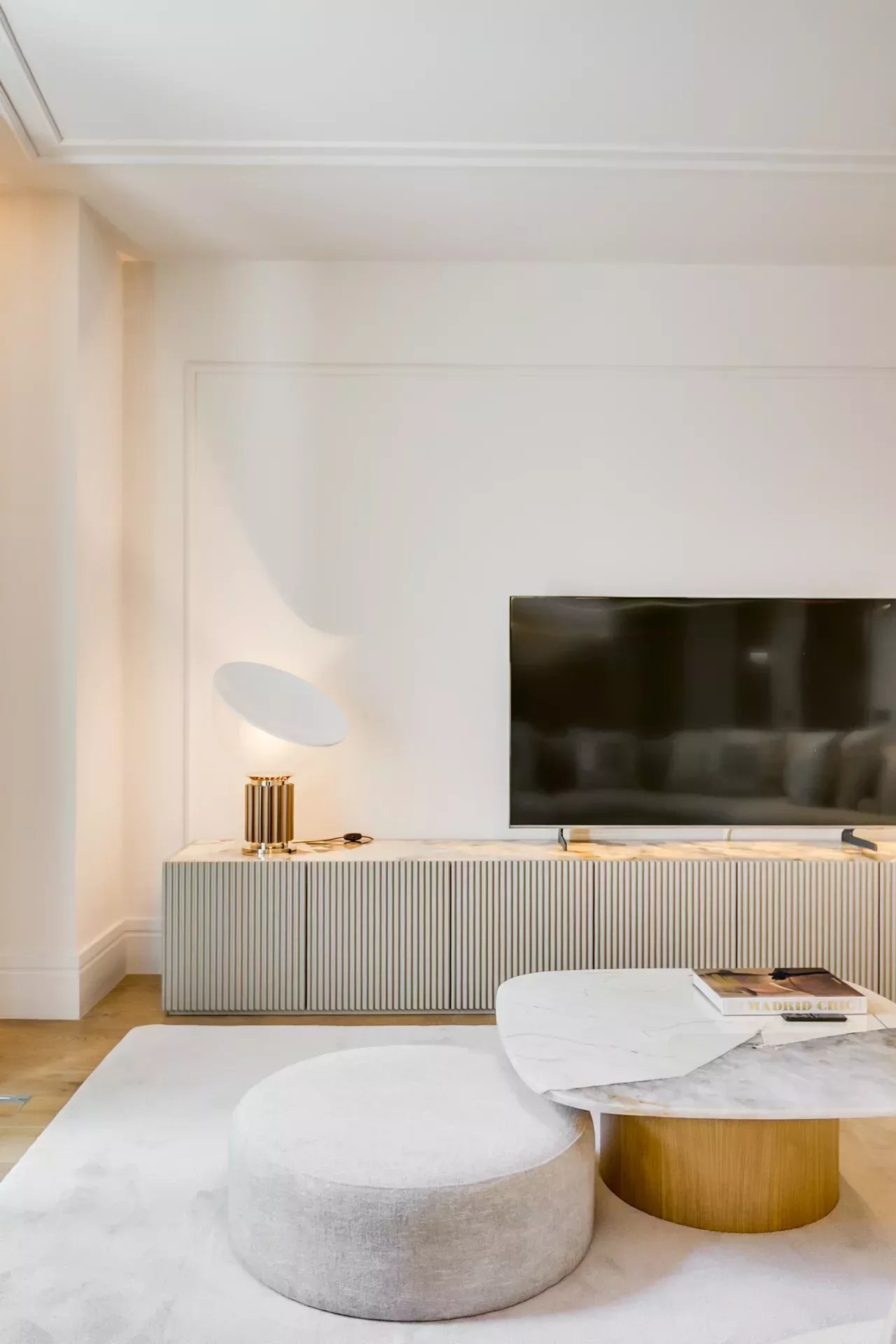 In terms of technology, the property includes a comprehensive home automation system that allows control of lighting, climate, and the creation of different ambiances. It also features electric blinds and Dedar brand sheer curtains, along with a 70-inch television in the living room.