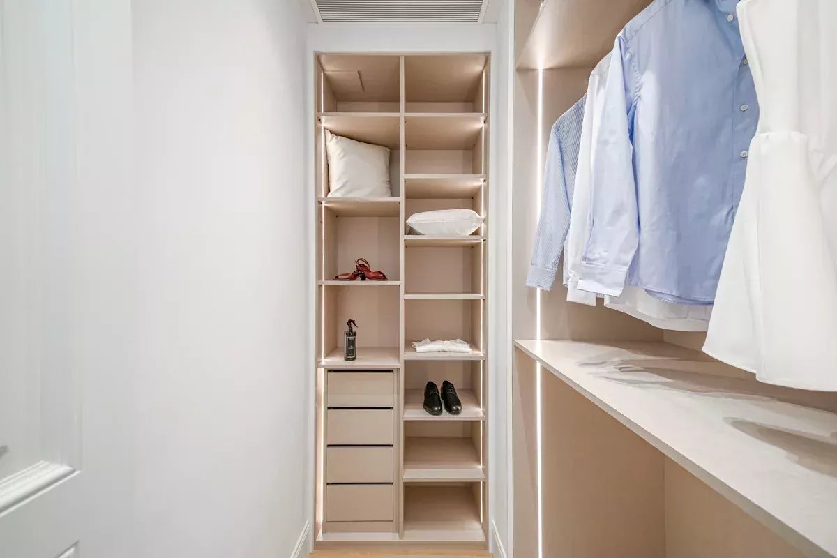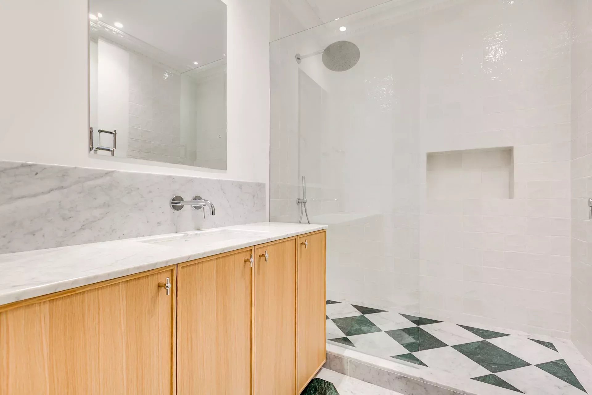 The master suite is a true urban retreat, featuring a bedroom, work area, built-in wardrobes, two walk-in closets, and an impressive Carrara marble bathroom with a bathtub. The sleeping area is completed by three additional bedrooms, all with en-suite bathrooms.