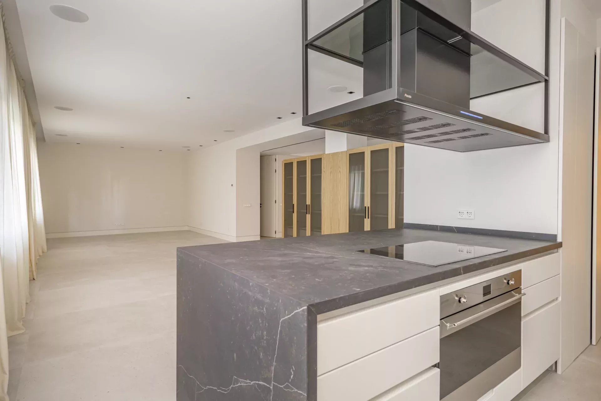 The main living room is bright and spacious, with large windows offering direct views of the vibrant Castellana. The fully equipped kitchen with high-end appliances stands out for its functionality and elegance.