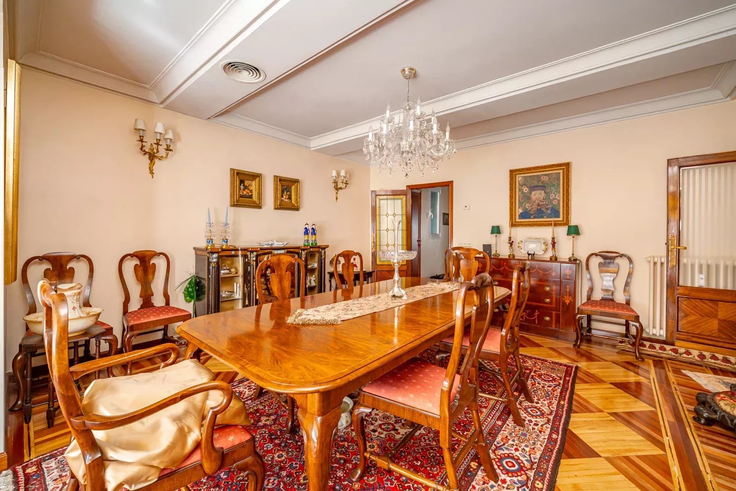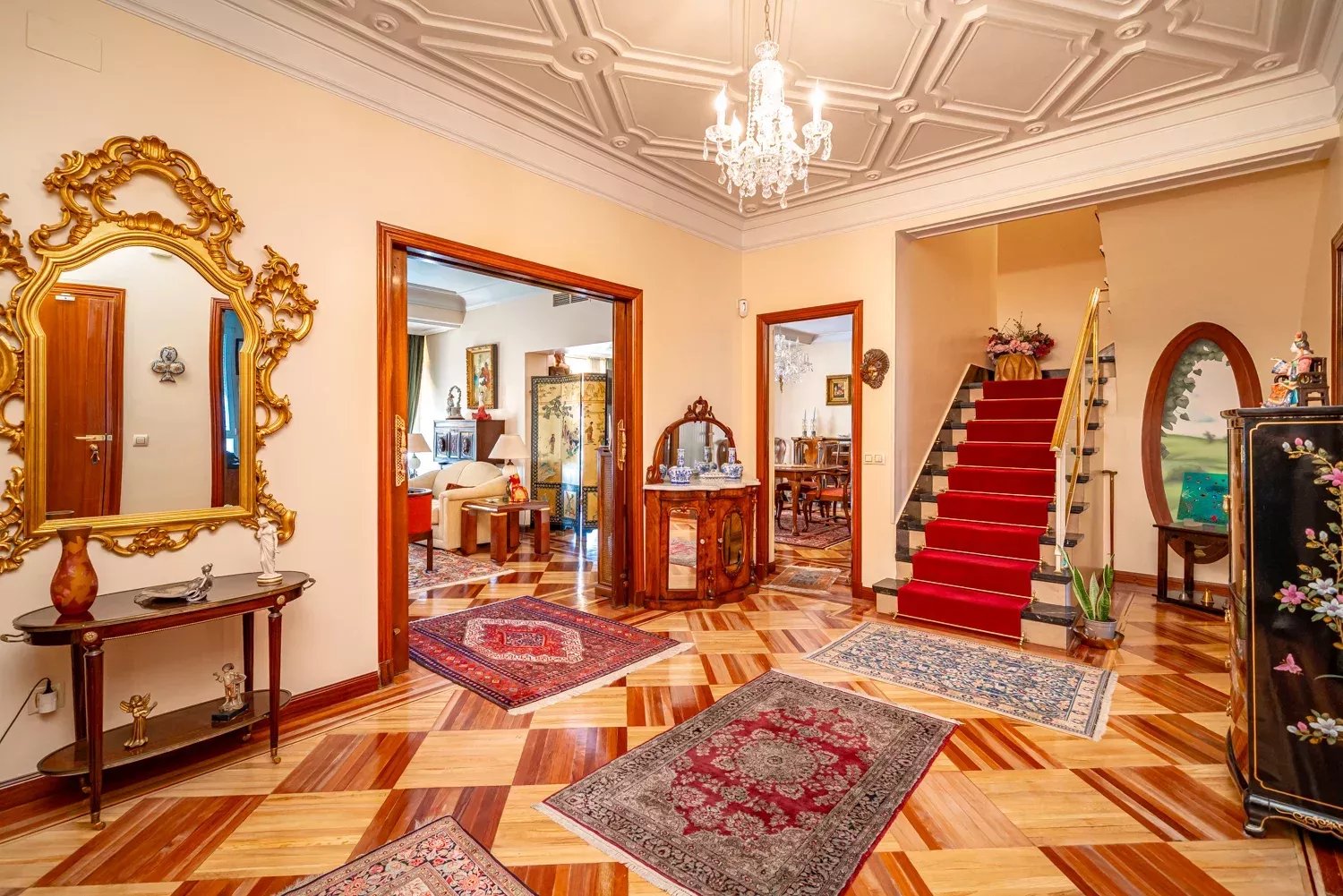 On the first floor, you are welcomed by an elegant entrance hall leading to two spacious living rooms with large windows that flood the space with natural light, creating a warm and cozy atmosphere. There is also an office and a service room for added convenience. The kitchen is spacious and designed for practicality, equipped with a dumbwaiter and a service door to facilitate the loading of supplies.