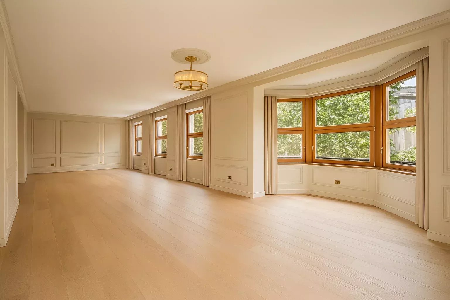 From the grand entrance hall, featuring original stained-glass windows and a sculptural staircase, one immediately senses the distinctive character and discretion that define the property. The perspective is truly unique: the main rooms frame the Italian Embassy with its imposing façade and gardens, composing a living tableau beyond the large windows. Natural light and a sense of spaciousness flood the entire floor—difficult to replicate even in Madrid’s prime market.