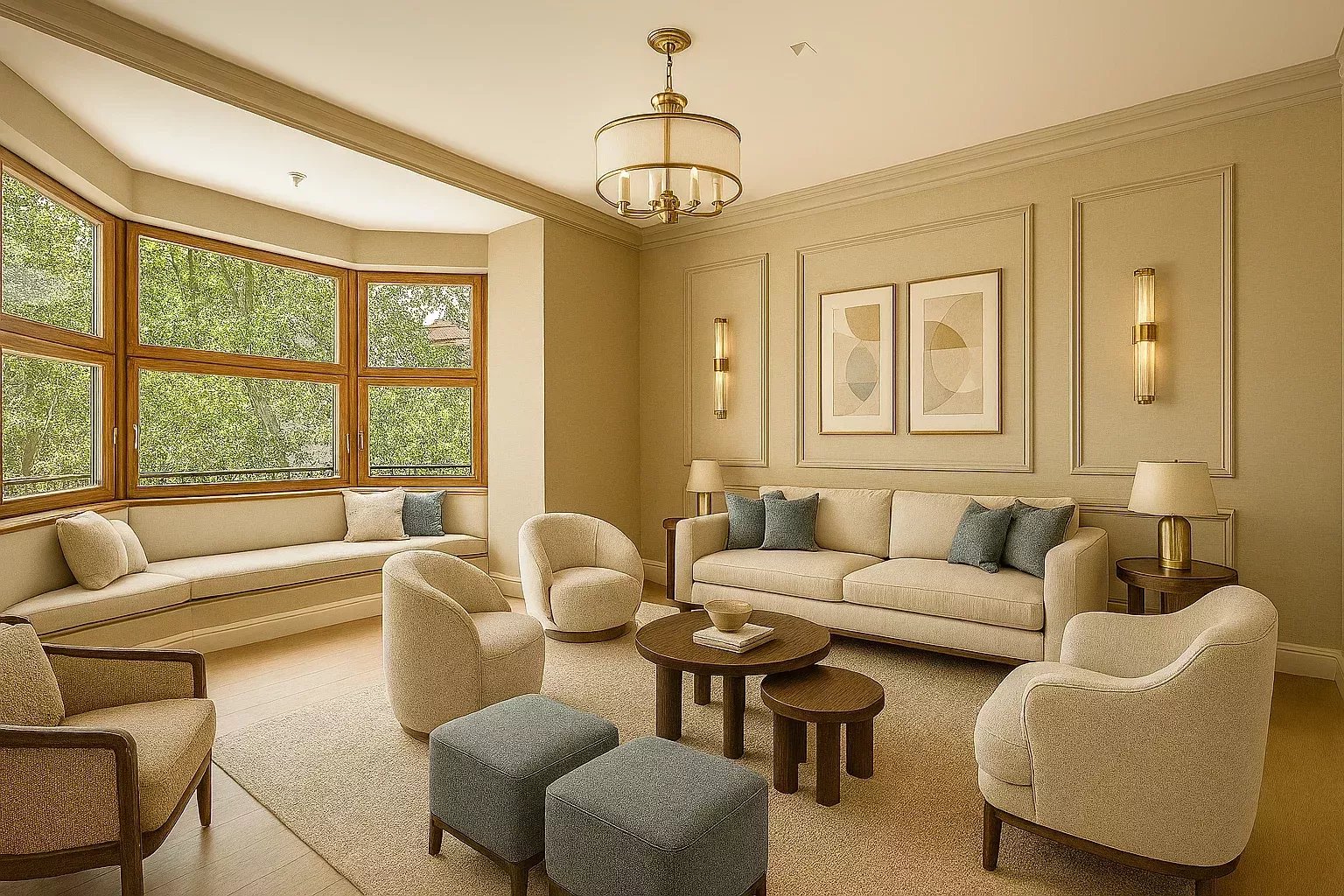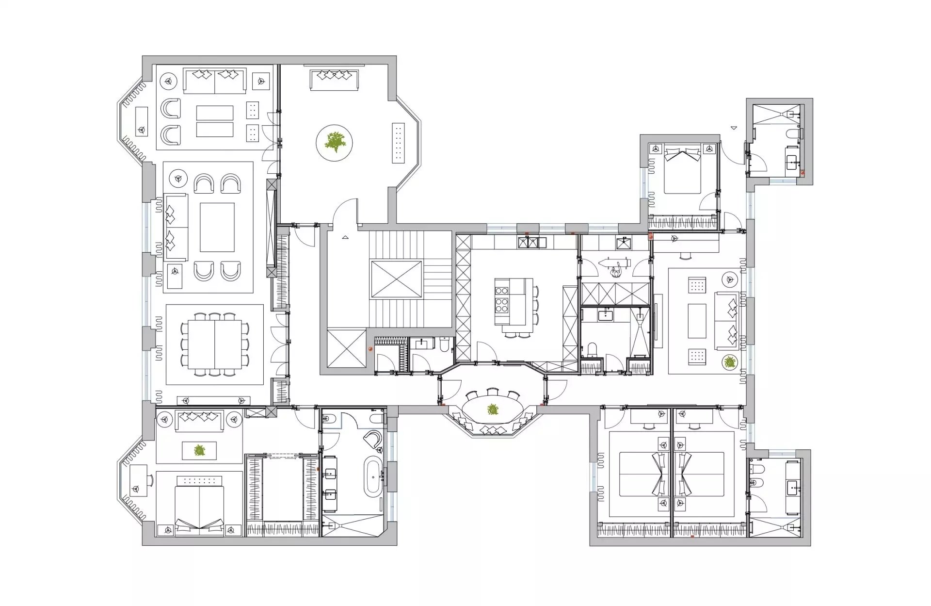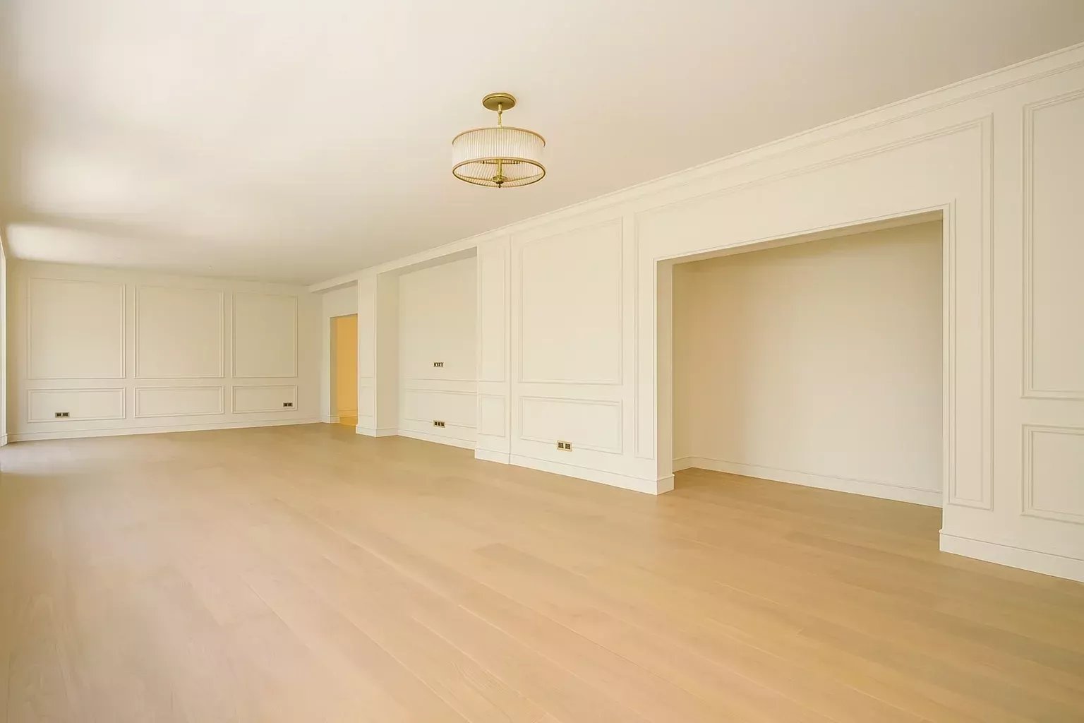 With a balanced rectangular layout, the residence flows seamlessly between generous reception areas and private quarters. A hall clad in Palancar limestone and Nero Marquina marble leads to two adjoining living rooms facing the street and to a formal dining room with the same privileged views. A TV/cinema room offers a more intimate atmosphere. A discreetly located guest powder room completes this area.