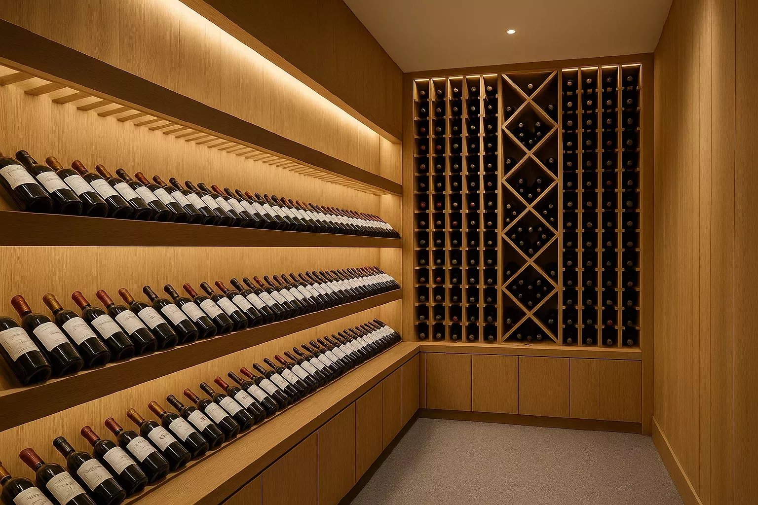 Service spaces meet the same exacting standards: a contemporary kitchen with central island, cabinetry in oak and white lacquer, porcelain countertops, and high-end appliances; a pantry, separate laundry room, and a climate-controlled wine cellar with oak shelving and an insulated glazed door.