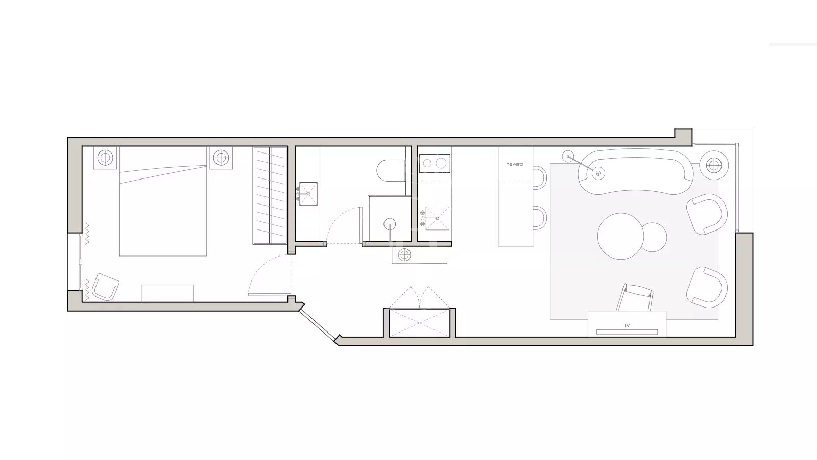 The bedroom is positioned independently from the living area and includes built-in wardrobes that maximize storage without taking up additional space. The centrally located bathroom is fitted with a shower and updated fixtures following the recent renovation.