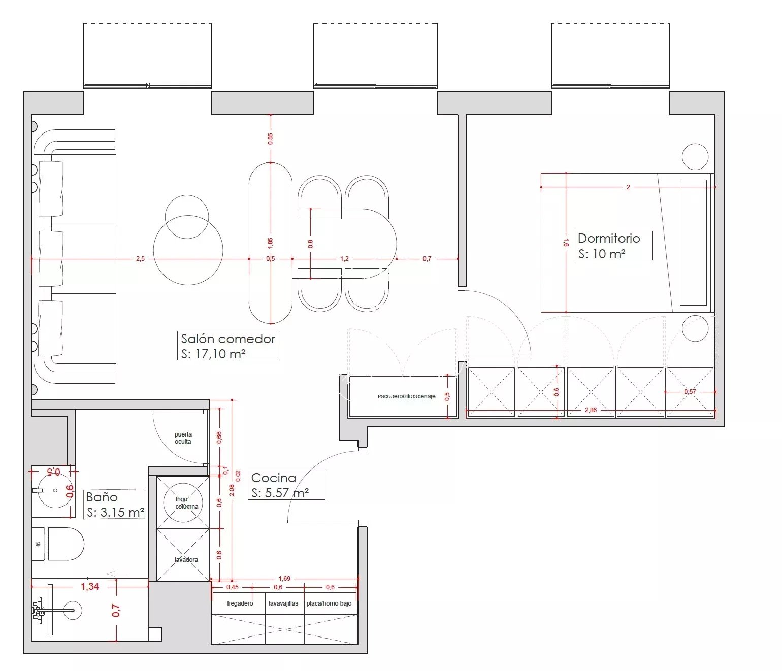 The layout has been carefully designed to make the most of every square meter. The living-dining room, measuring 17.10 sqm, is spacious and bright, with access to the balconies and enough room to comfortably distinguish between the living and dining areas.
