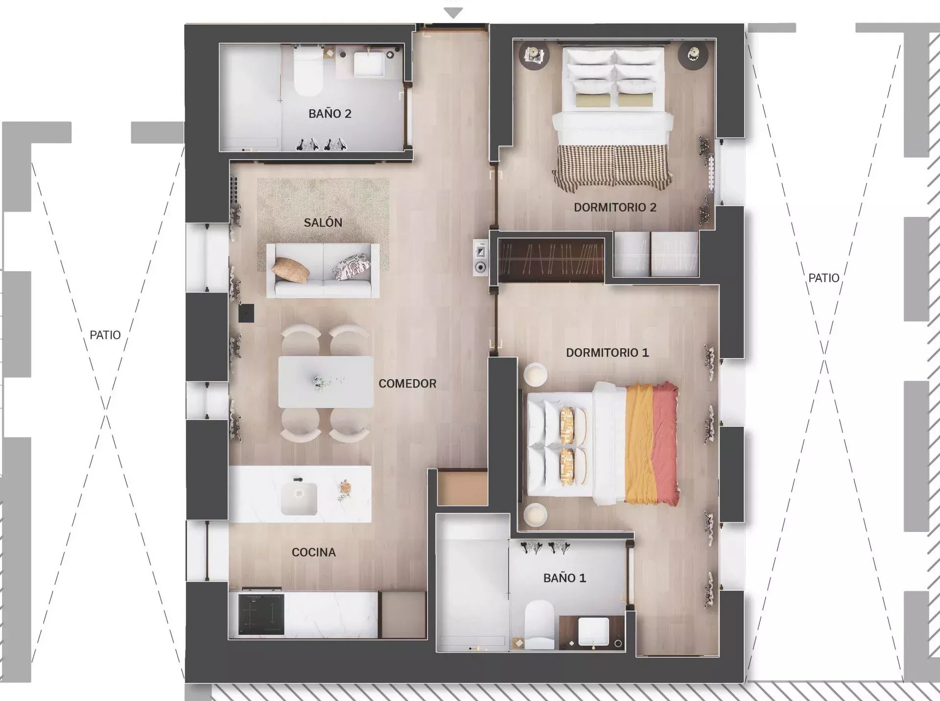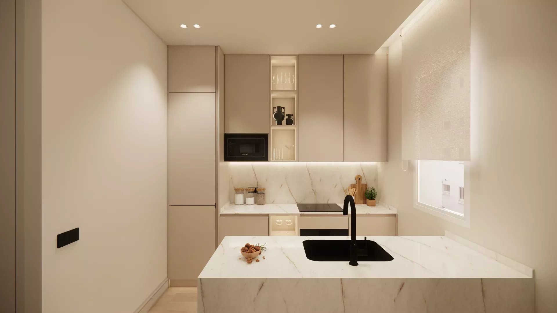 The fully furnished and equipped kitchen has been designed to be enjoyed both on a daily basis and for more special occasions. It has two double bedrooms and two full bathrooms with modern finishes, as well as individual gas heating and air conditioning to ensure maximum comfort.