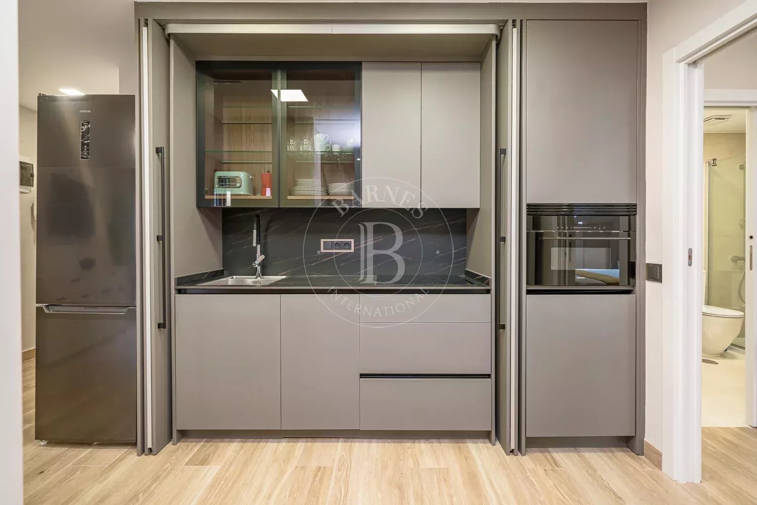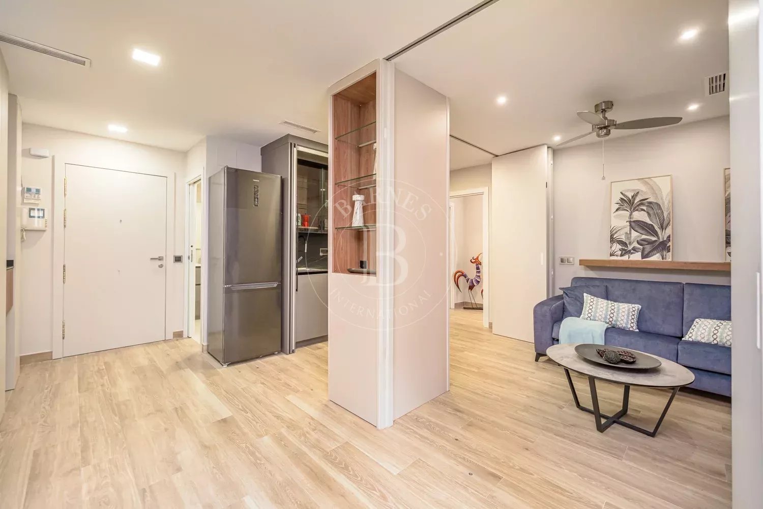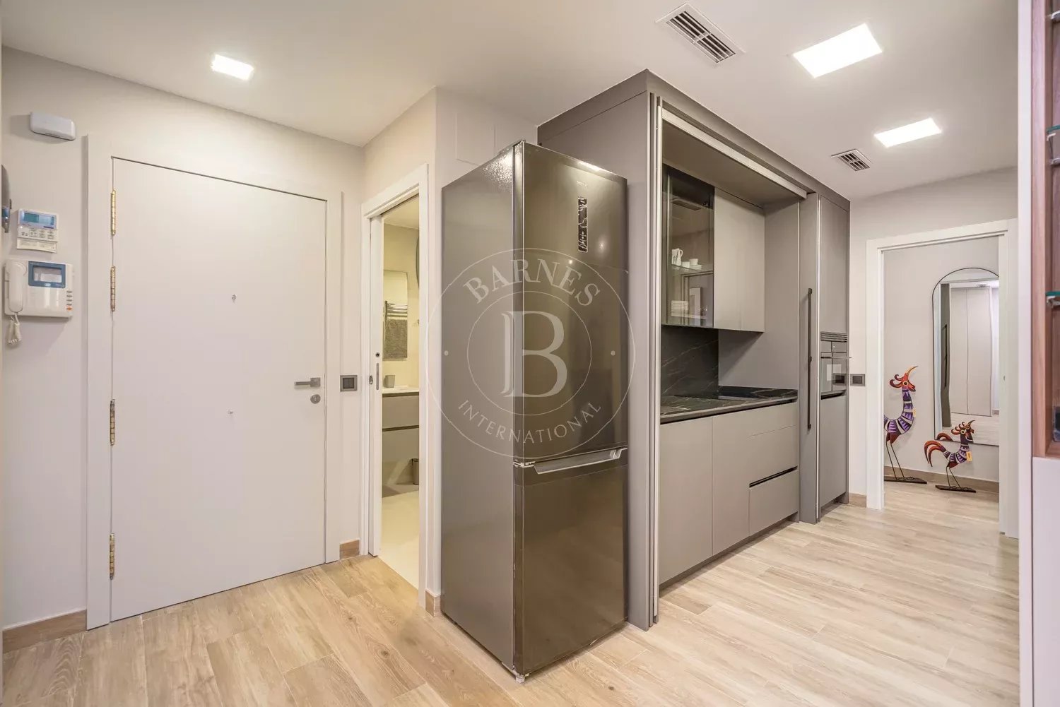 The entrance opens onto a spacious living area with an open-plan kitchen, designed as a bright, flowing space where natural light moves effortlessly throughout. This area has been carefully conceived to offer a modern and refined living experience, seamlessly blending aesthetics and functionality into a single concept. Large windows allow daylight to flood the room, enhancing the noble materials, clean lines, and the sense of openness characteristic of high-end contemporary homes.