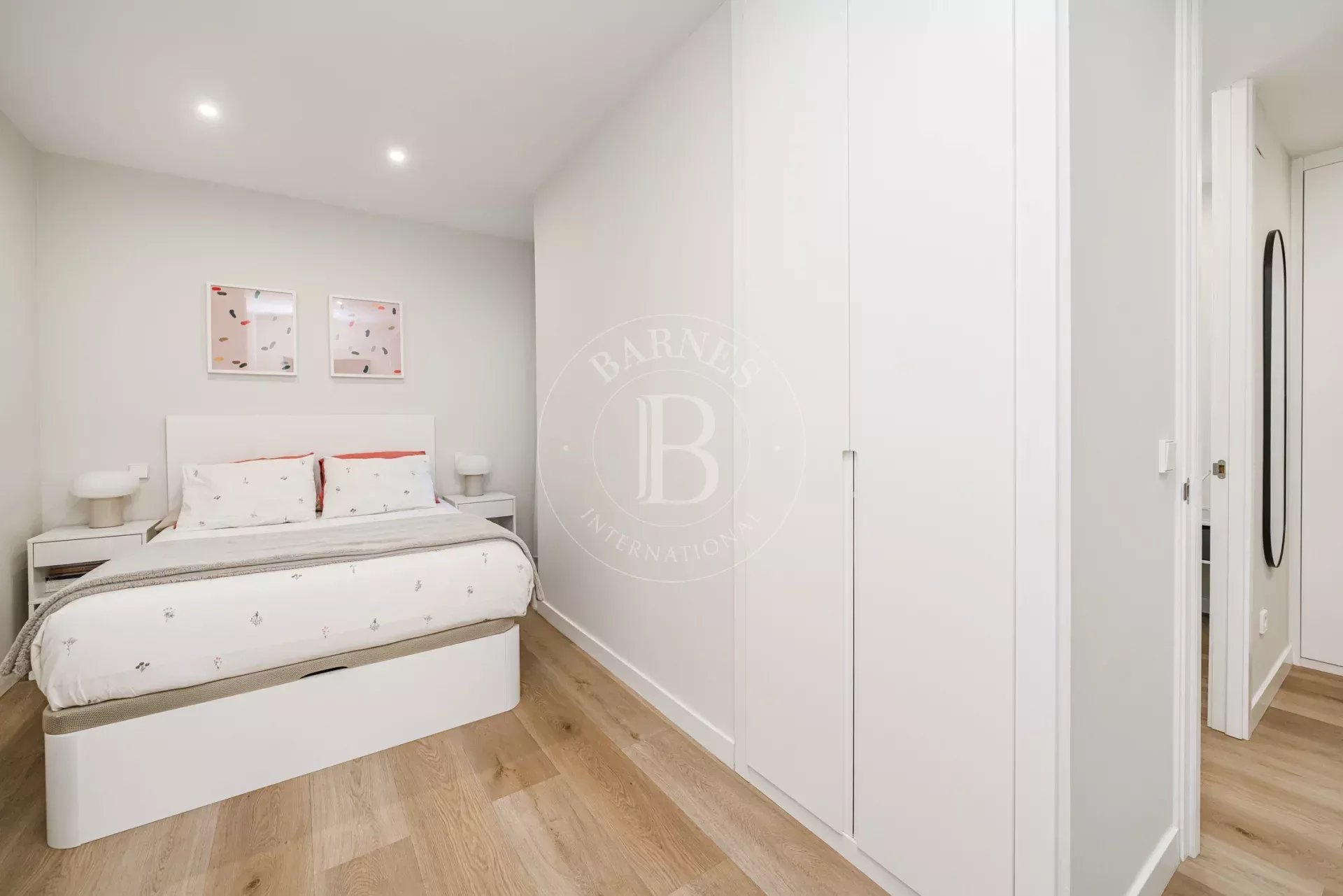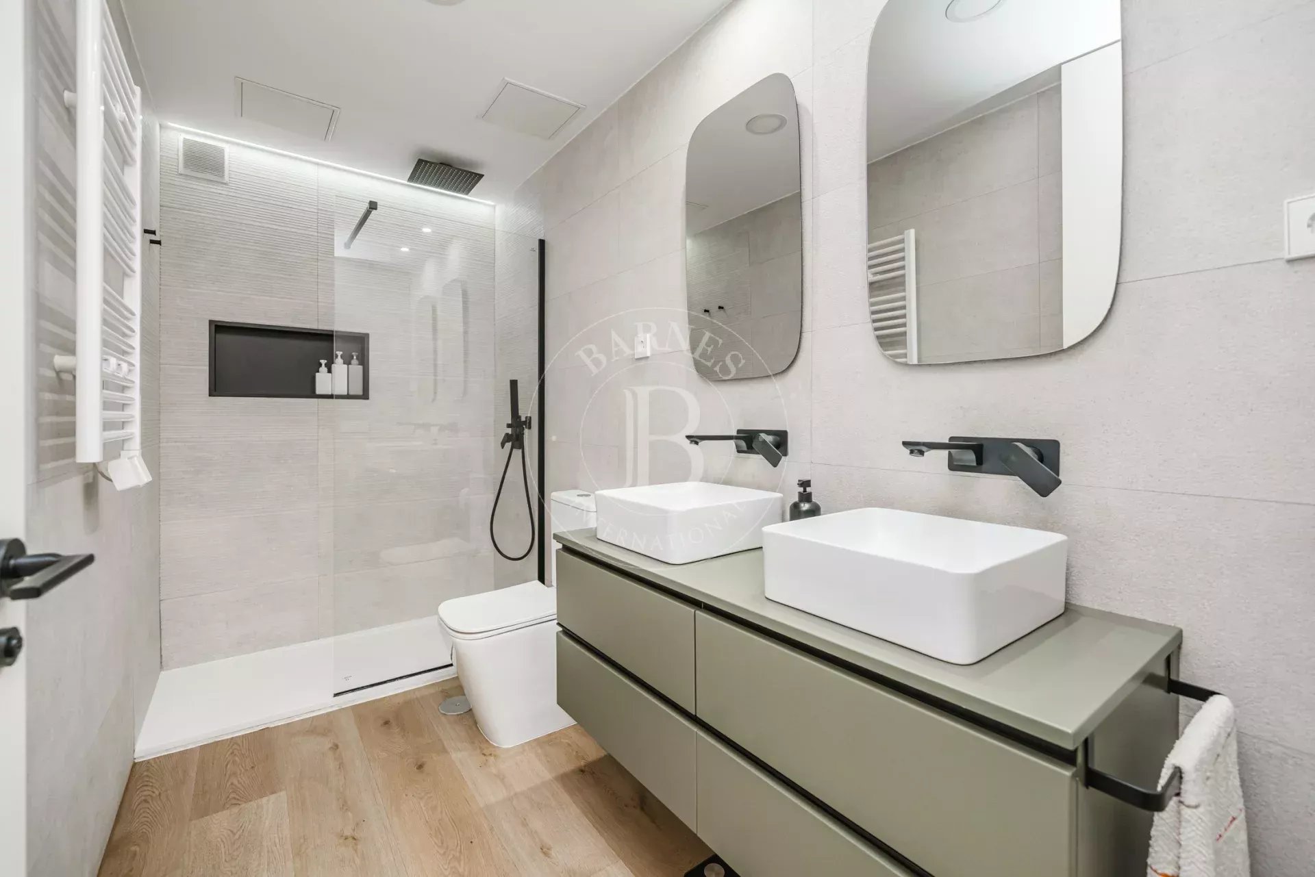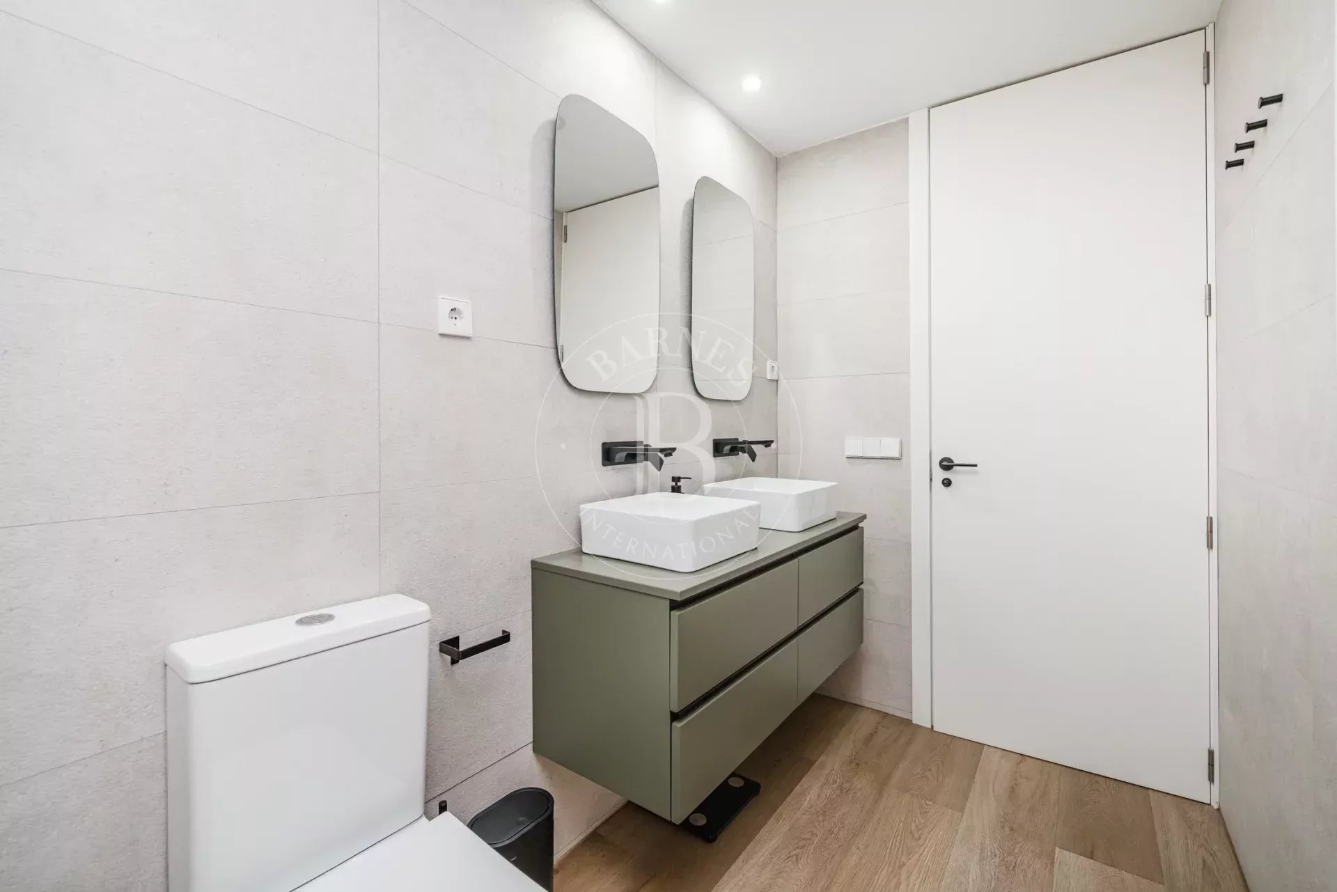 The sleeping area comprises two double bedrooms, both with custom-designed wardrobes and good natural light. The generously sized bathroom features a double sink and a rain shower, enhancing the overall sense of comfort.