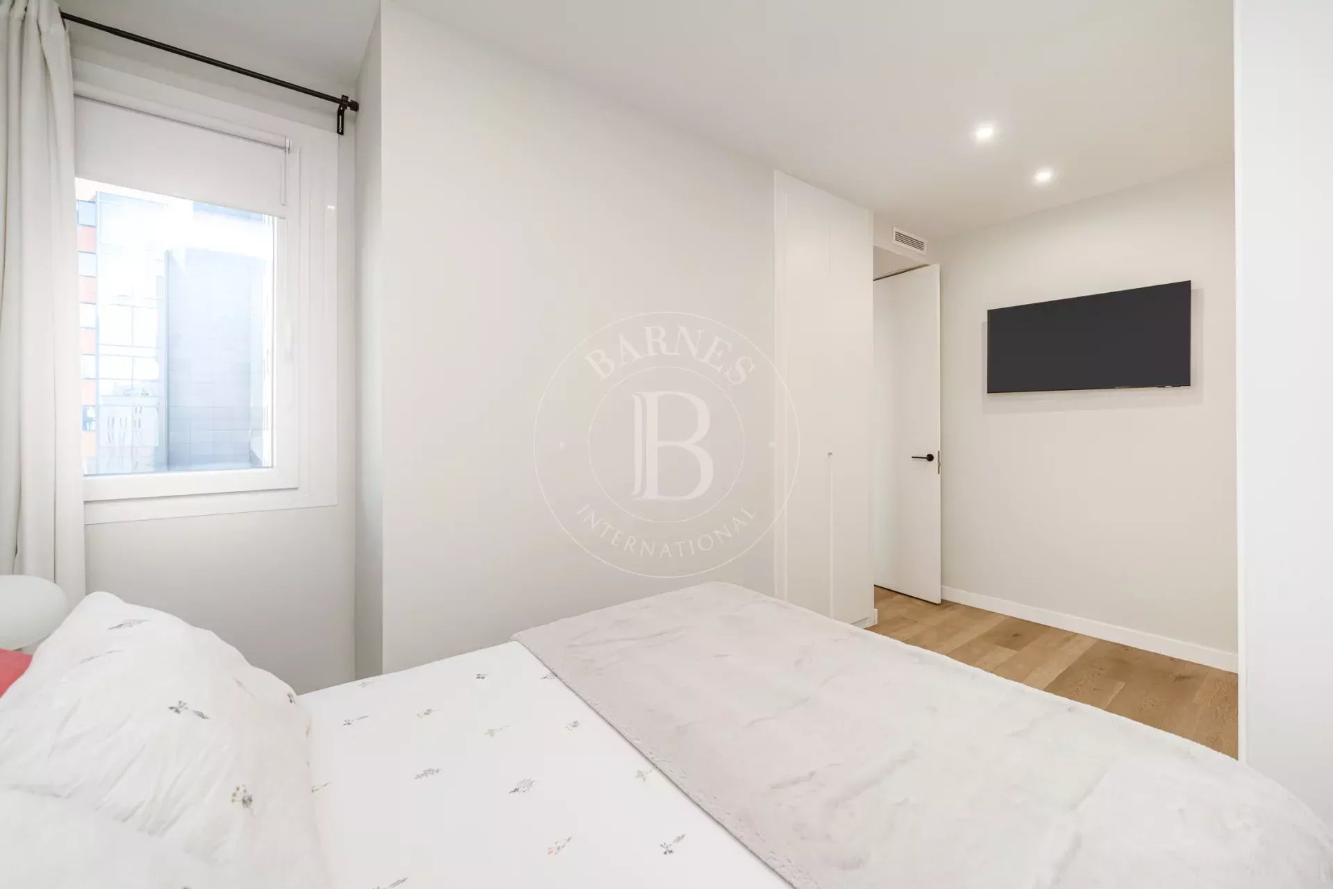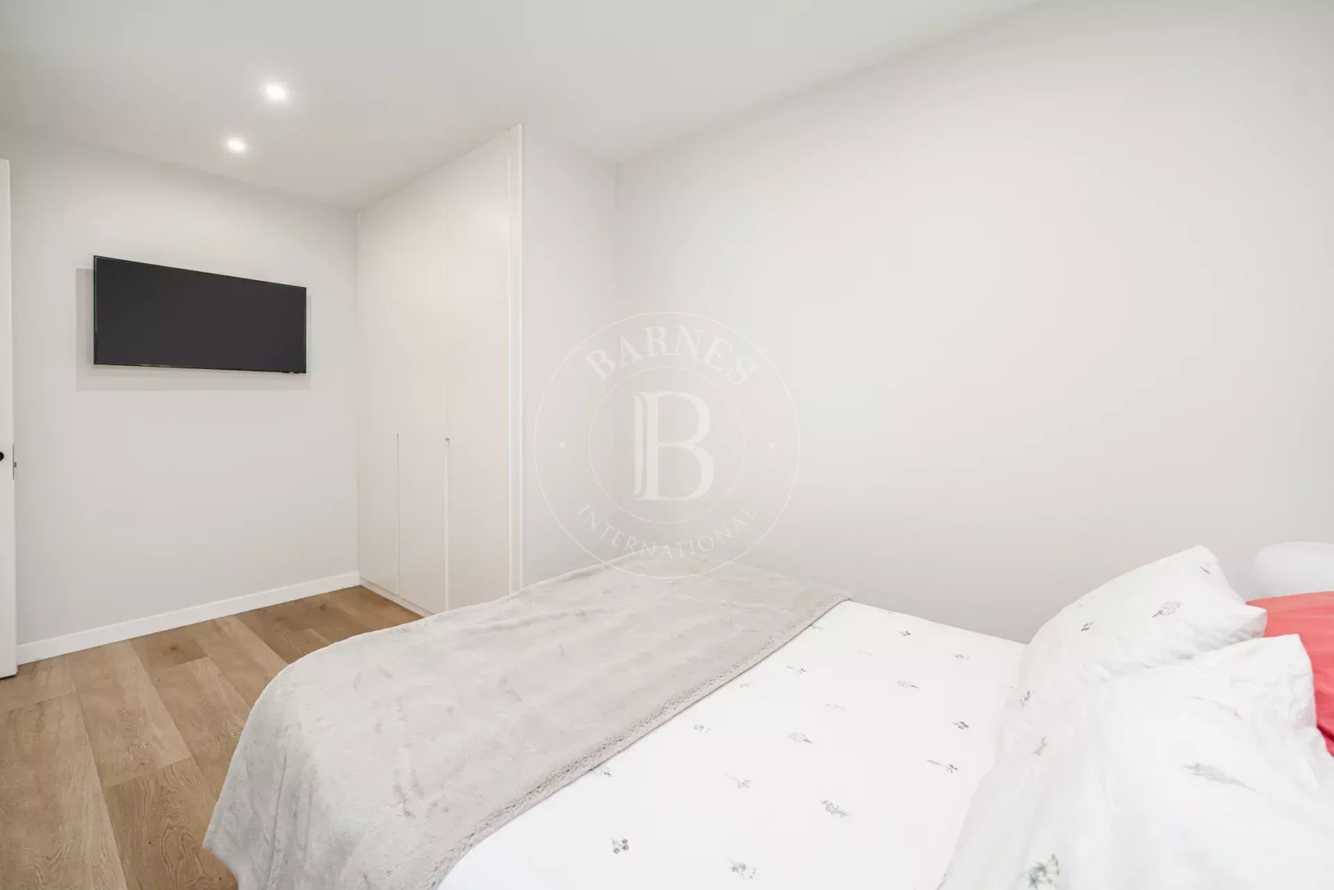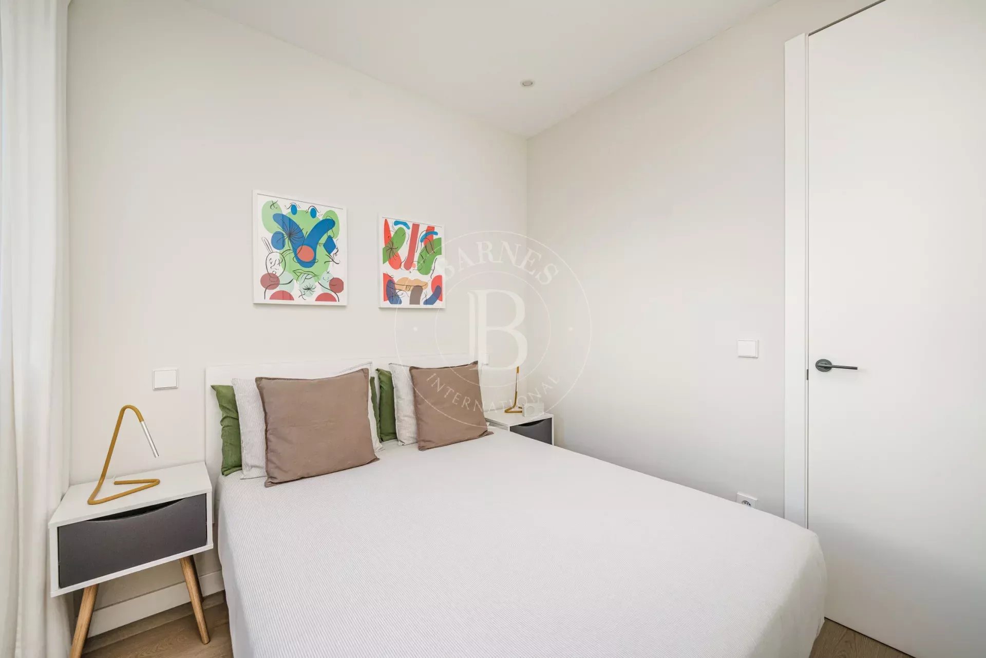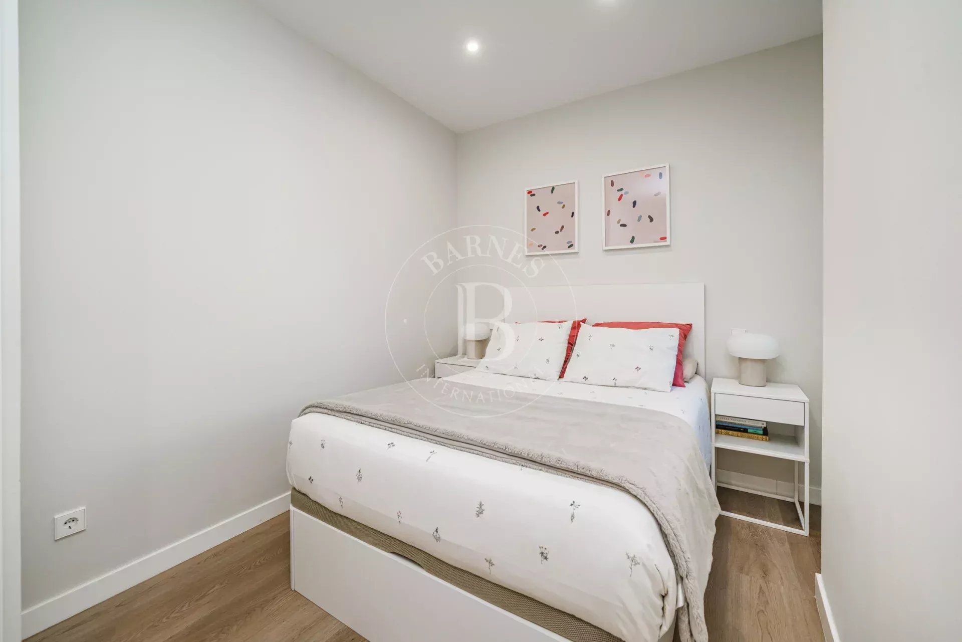 The sleeping area comprises two double bedrooms, both with custom-designed wardrobes and good natural light. The generously sized bathroom features a double sink and a rain shower, enhancing the overall sense of comfort.