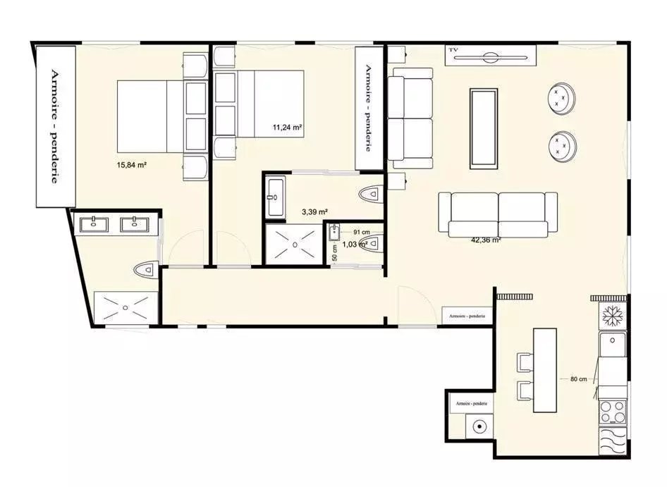 The refined interior includes two main en-suite bedrooms and an additional guest toilet. A spacious open-plan living/dining/kitchen area creates the perfect setting for contemporary lifestyles.