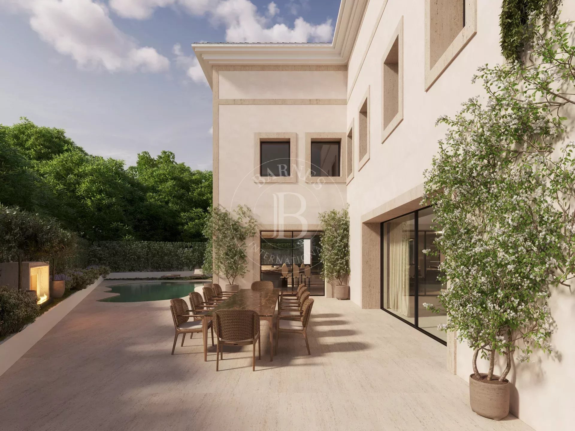 Its spacious interiors open onto the garden through large windows, creating a fluid continuity between the interior and exterior. The house has a spectacular master suite that occupies the entire upper floor and enjoys a private terrace, several additional bedrooms with en-suite bathrooms, separate service areas, and rooms designed for maximum comfort.