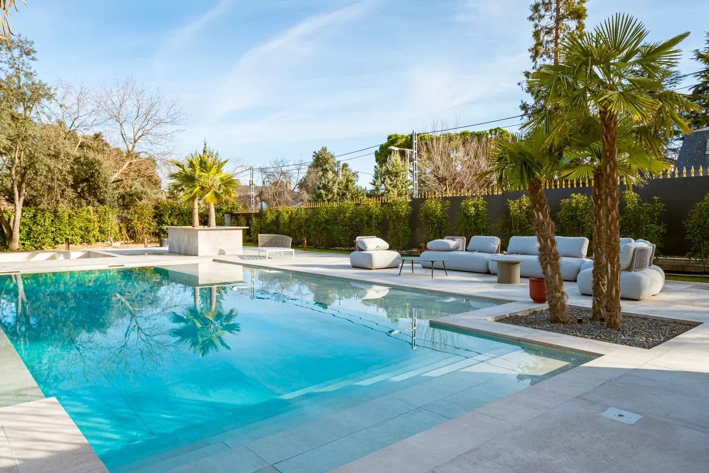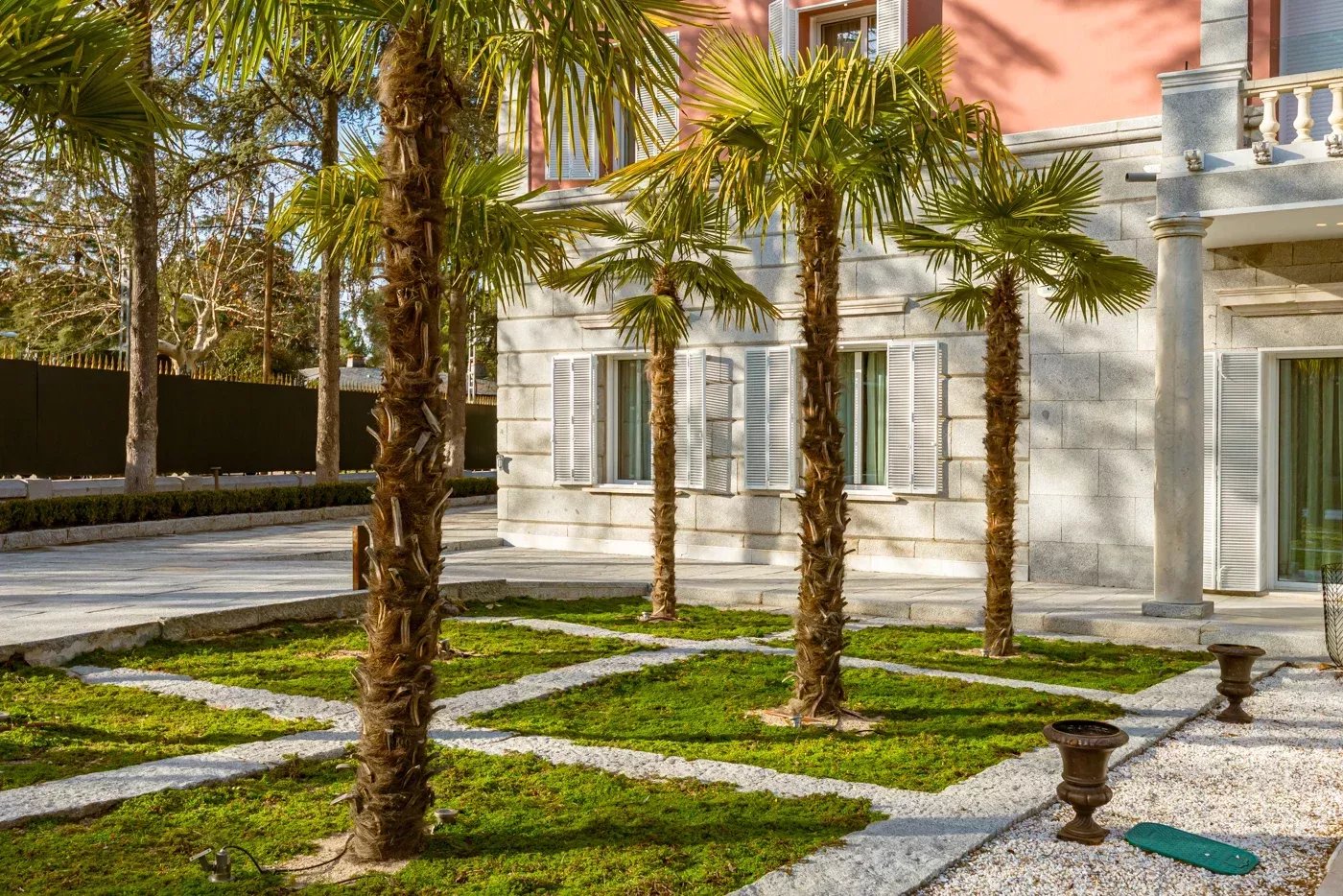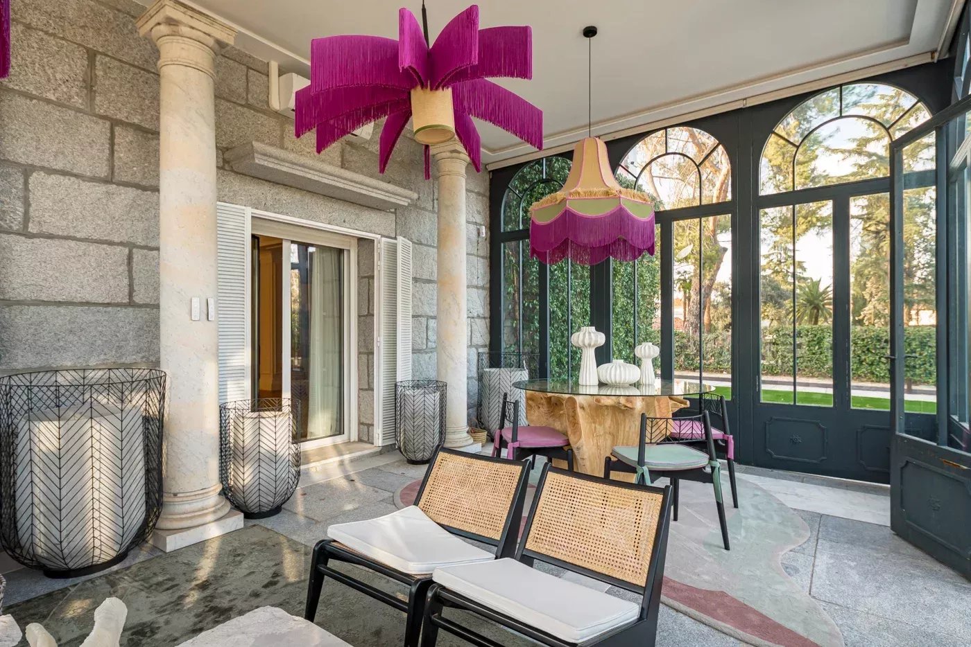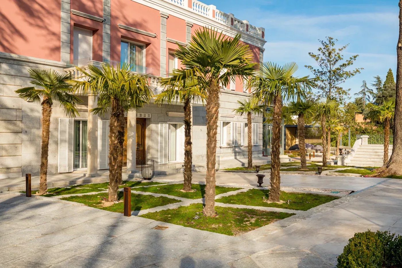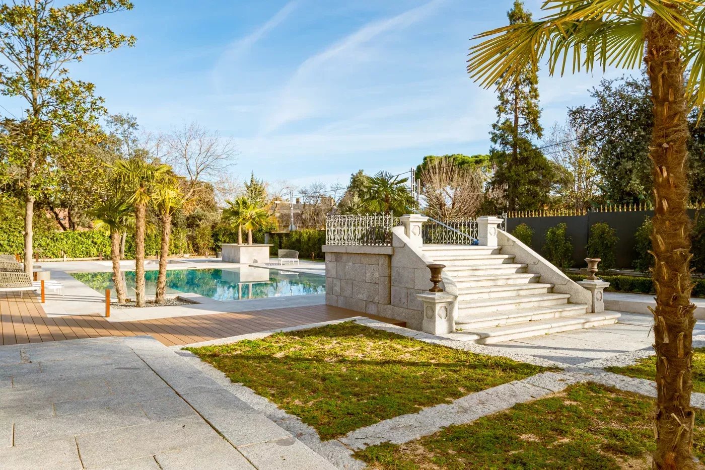 This exclusive home blends historical elements rescued from a former palace on Paseo de la Castellana with a contemporary luxury aesthetic. It offers total privacy, surrounded by a beautifully landscaped garden enclosed by an iconic original wrought-iron fence.