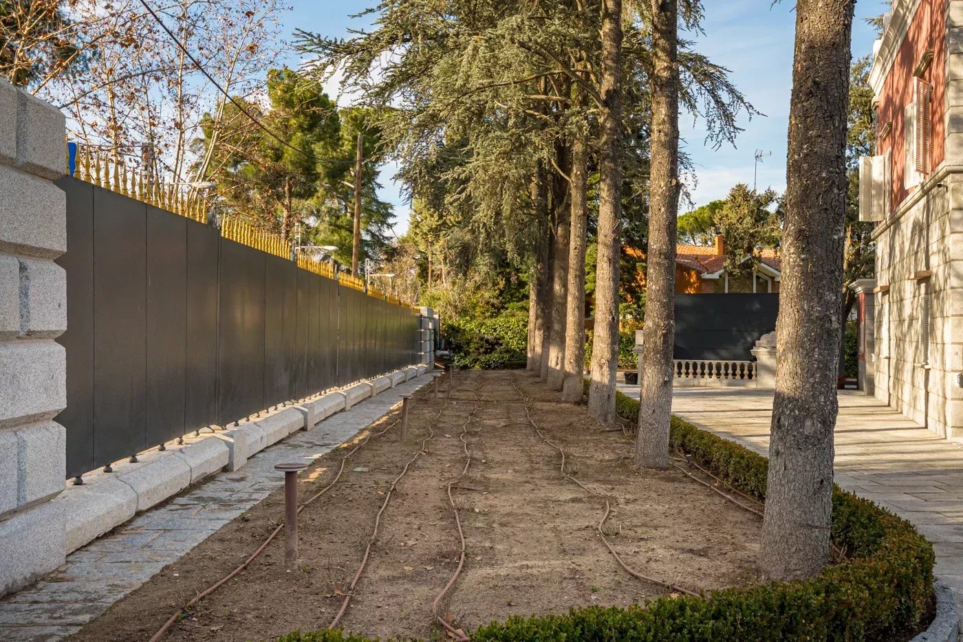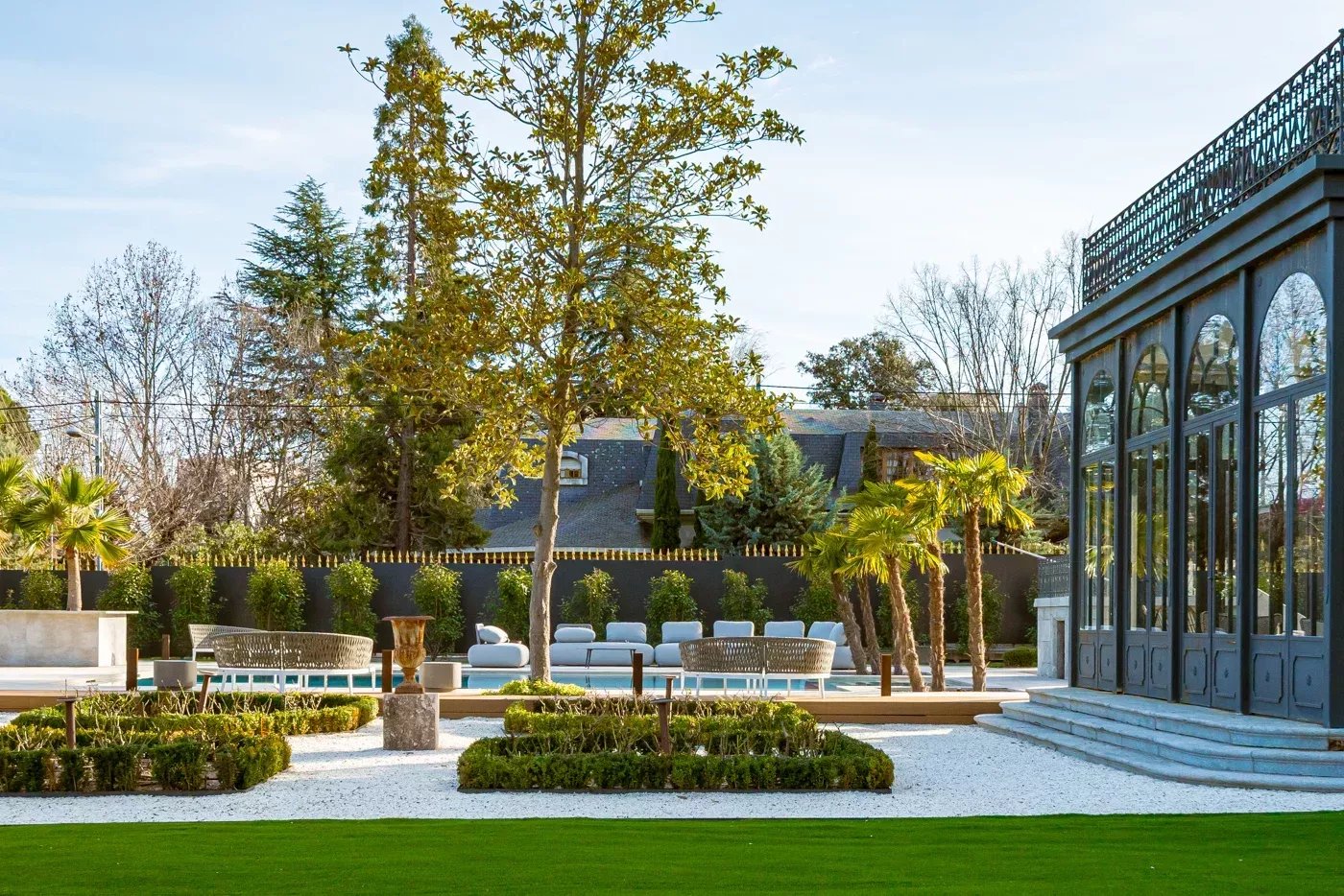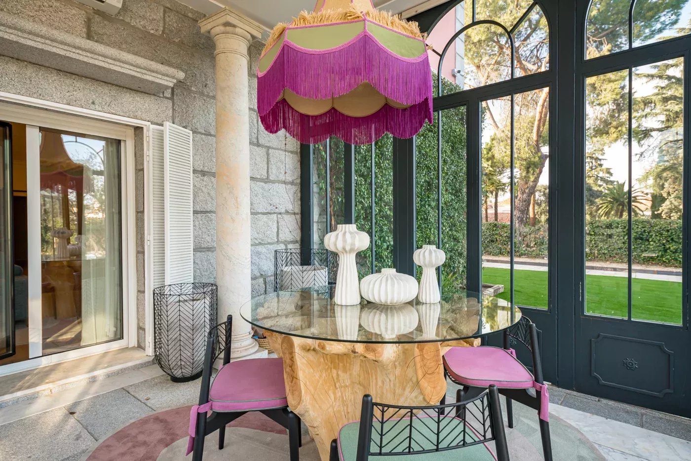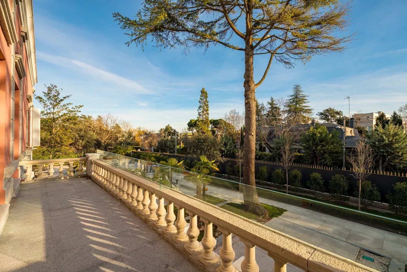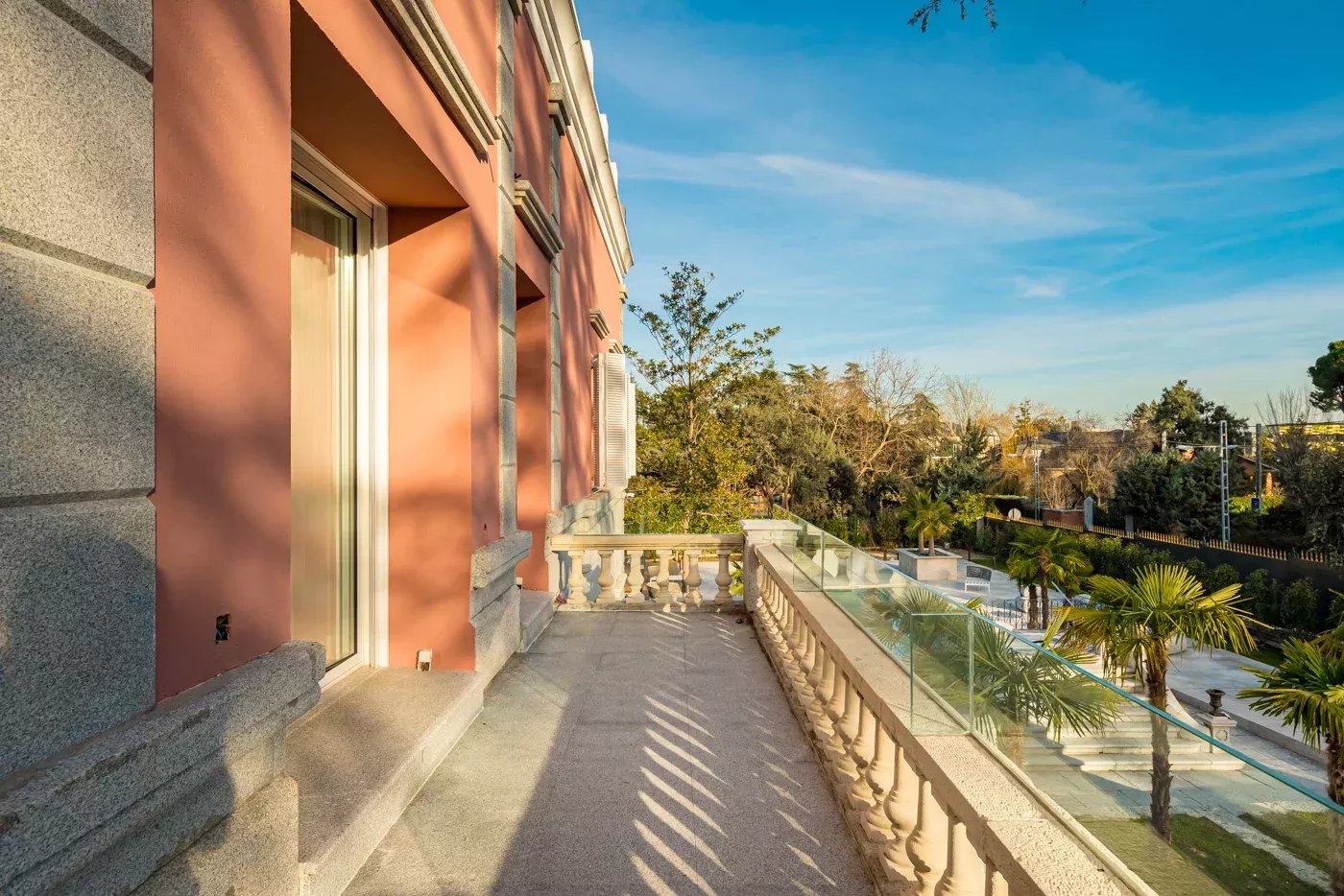 This exclusive home blends historical elements rescued from a former palace on Paseo de la Castellana with a contemporary luxury aesthetic. It offers total privacy, surrounded by a beautifully landscaped garden enclosed by an iconic original wrought-iron fence.