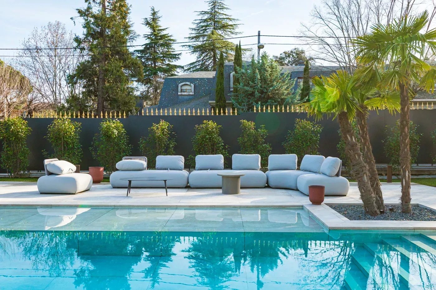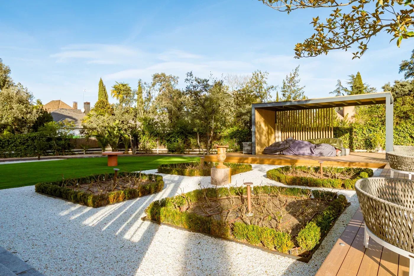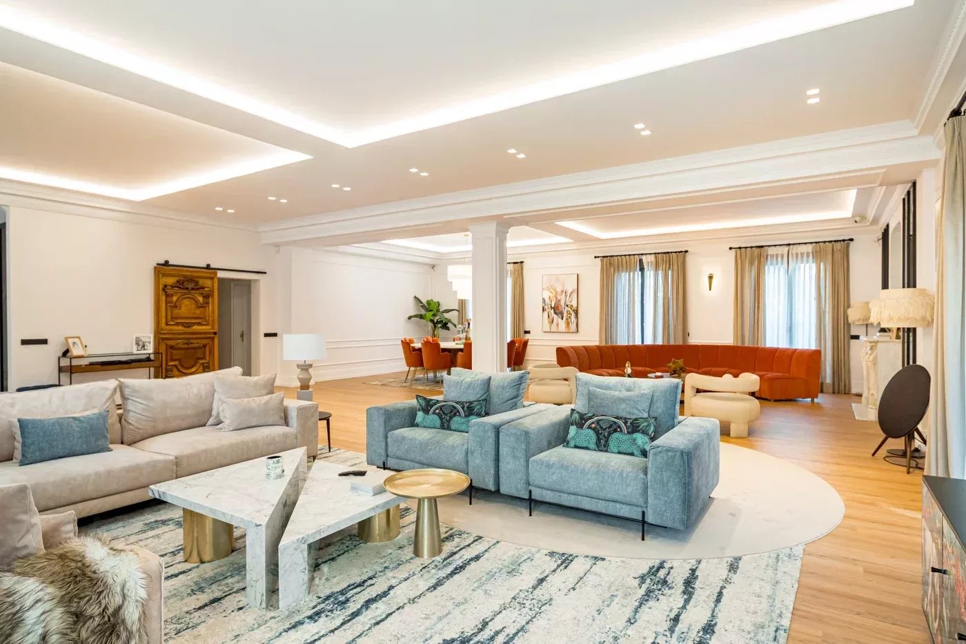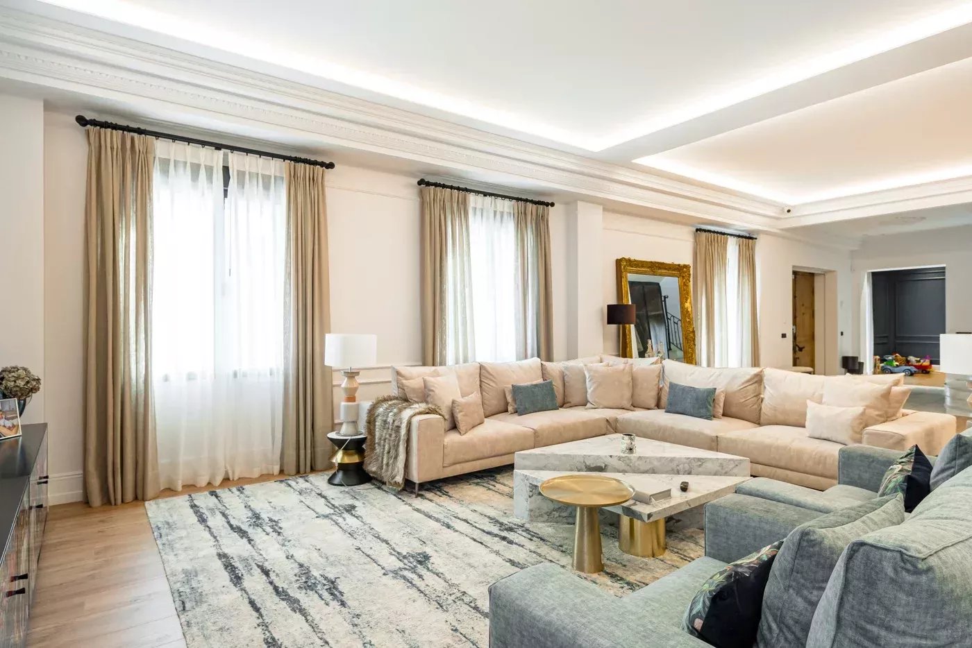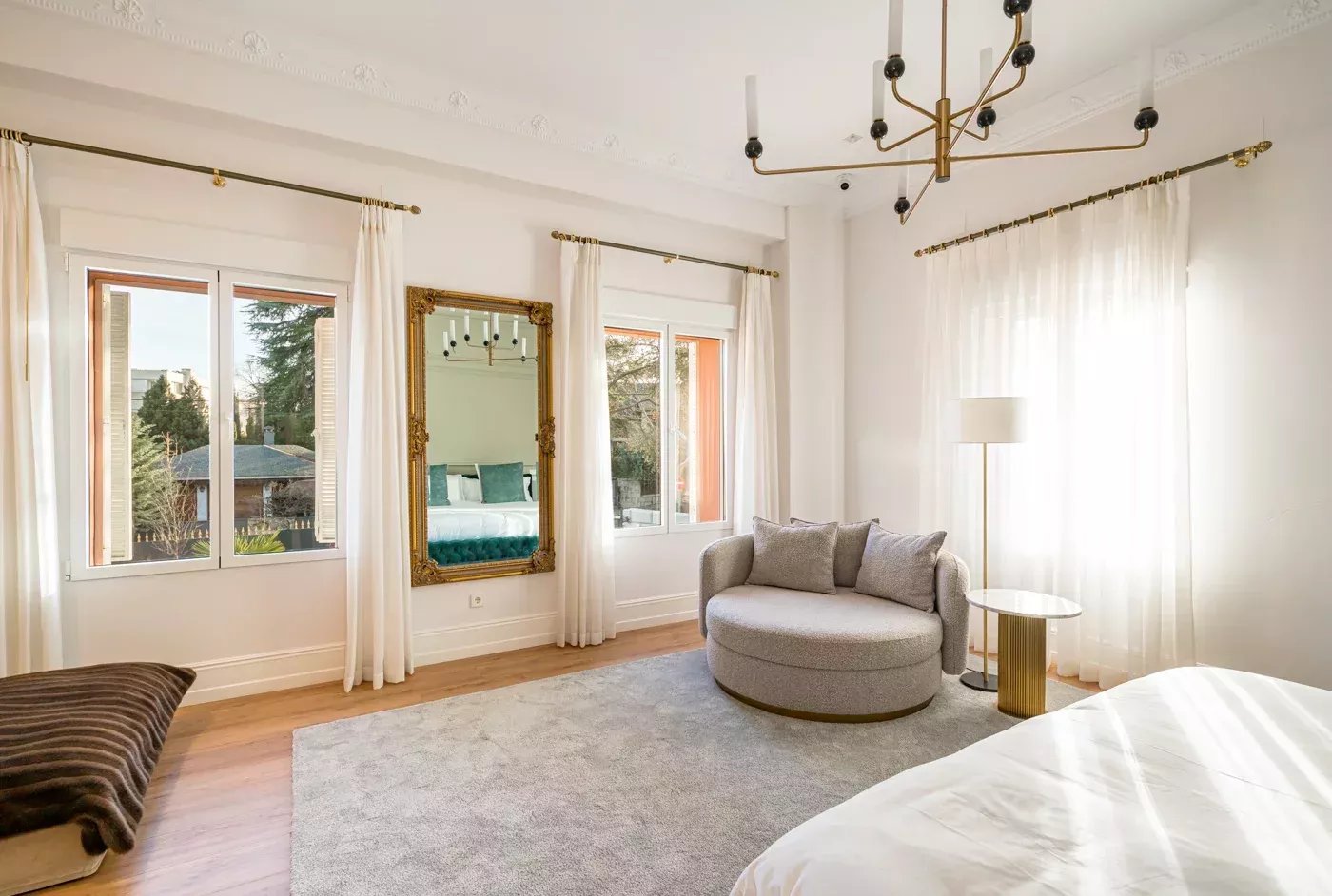 This exclusive home blends historical elements rescued from a former palace on Paseo de la Castellana with a contemporary luxury aesthetic. It offers total privacy, surrounded by a beautifully landscaped garden enclosed by an iconic original wrought-iron fence.