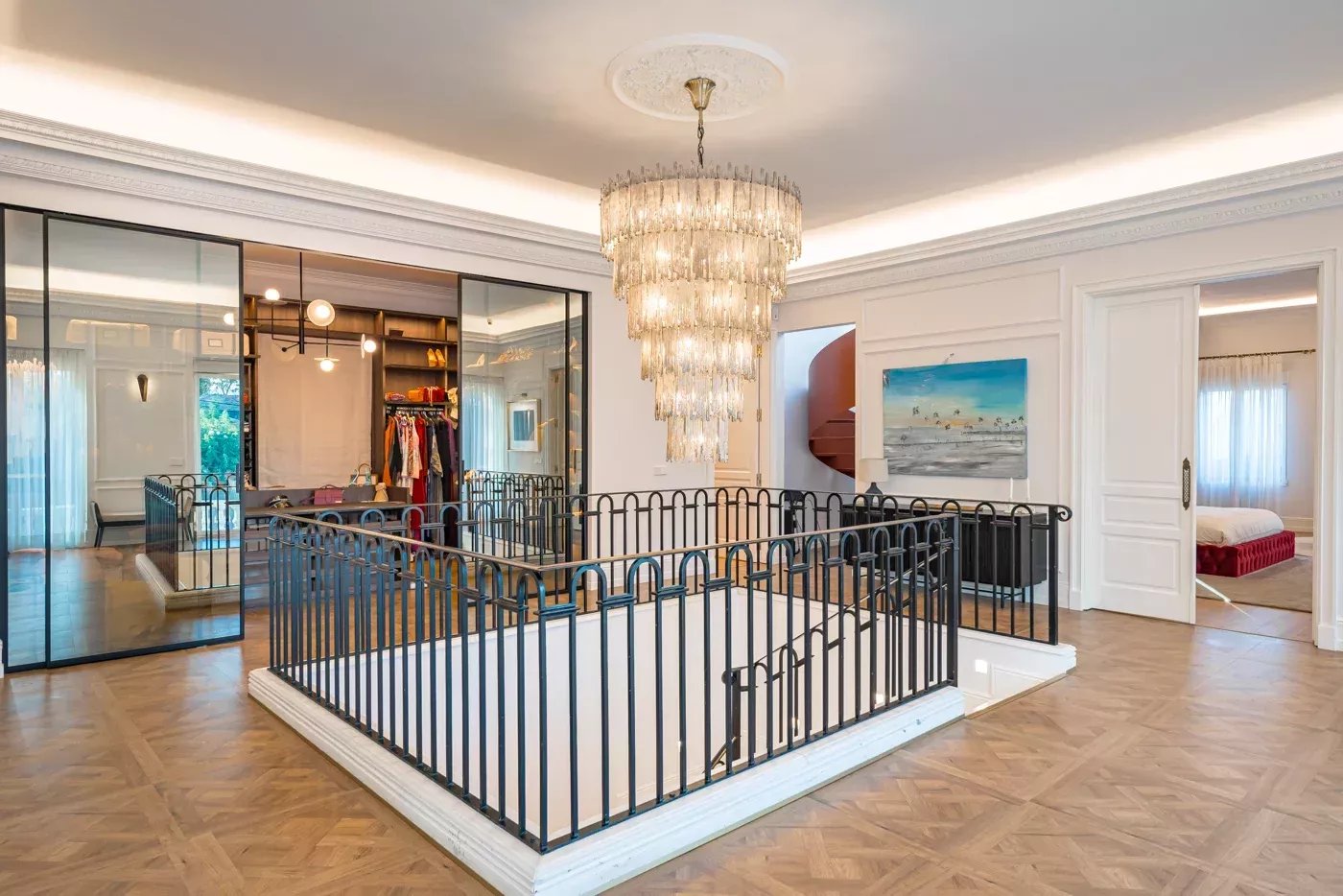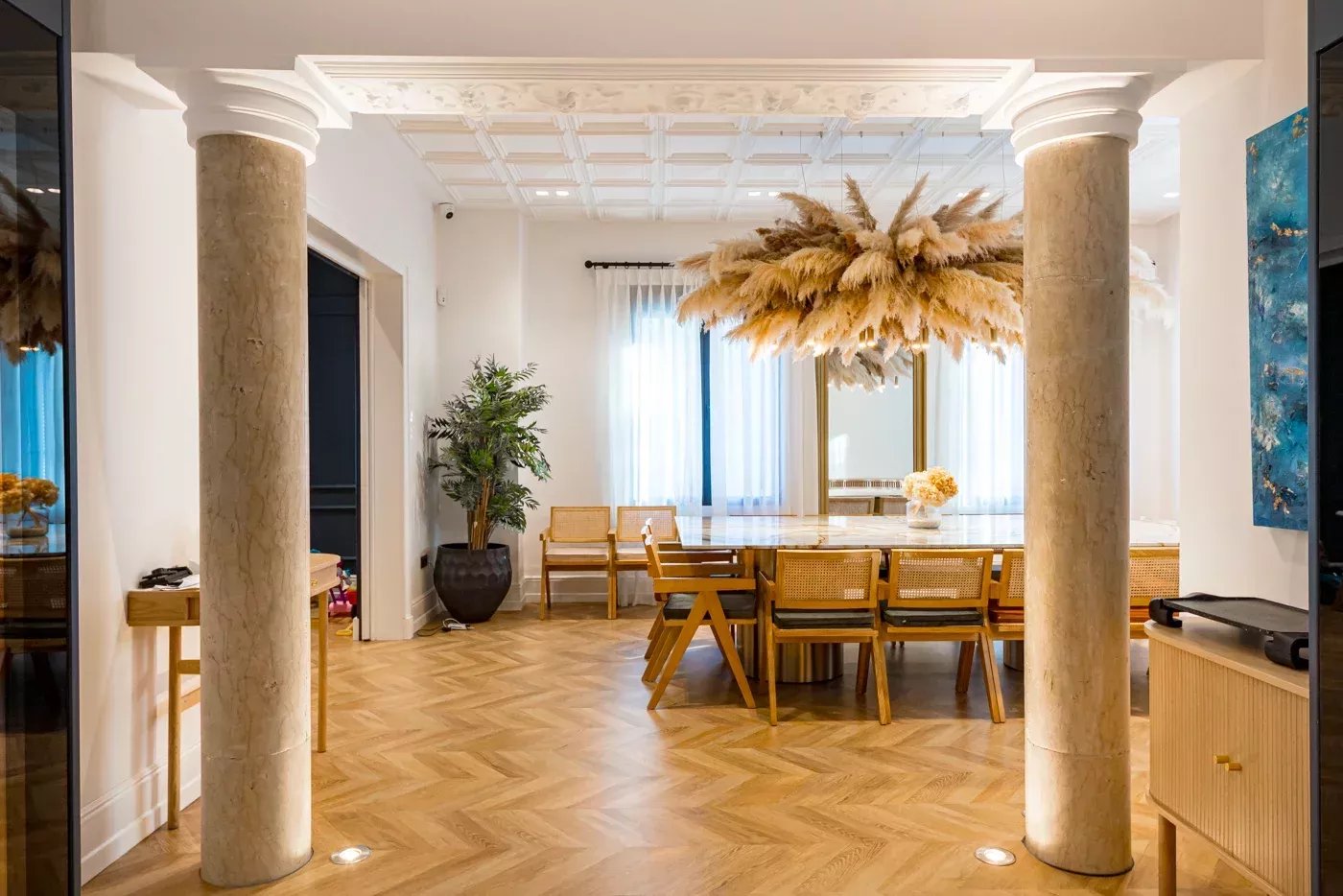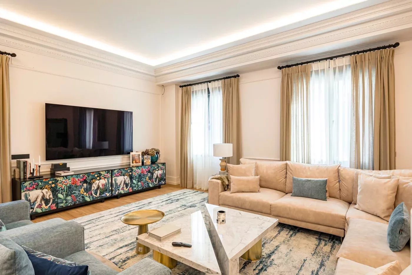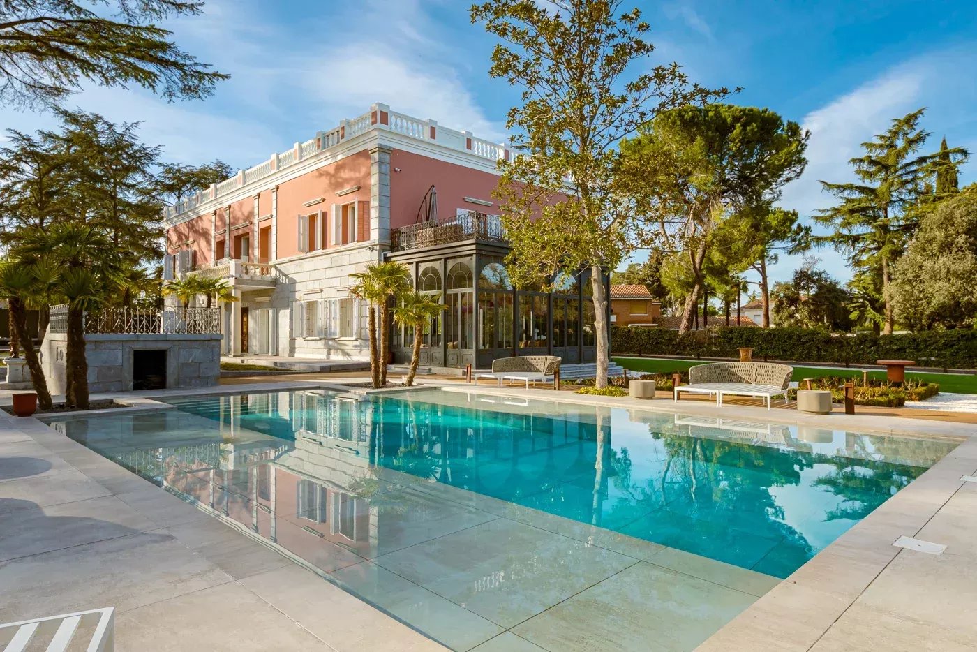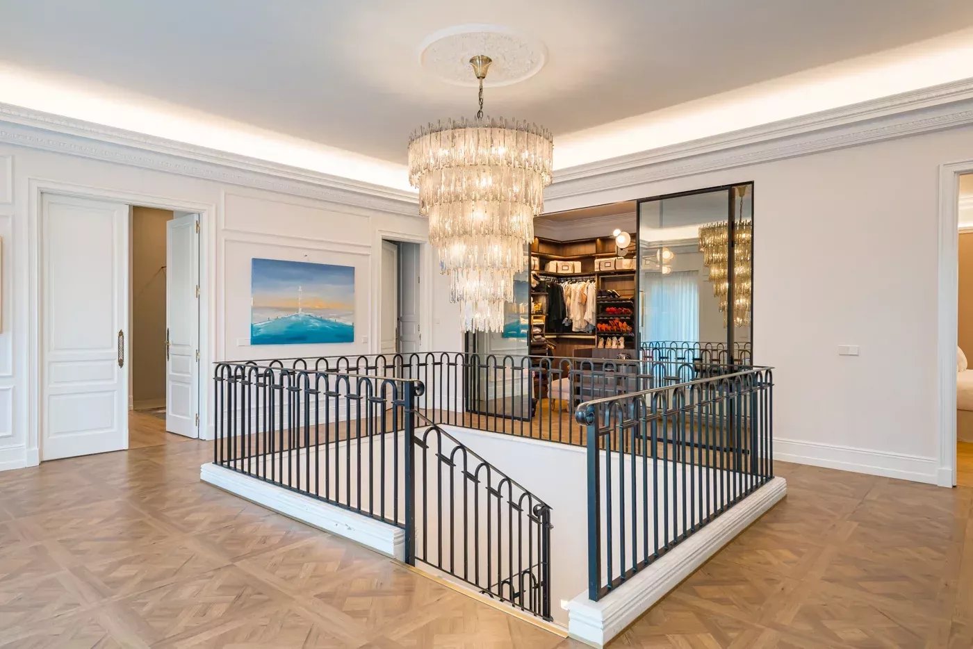 This exclusive home blends historical elements rescued from a former palace on Paseo de la Castellana with a contemporary luxury aesthetic. It offers total privacy, surrounded by a beautifully landscaped garden enclosed by an iconic original wrought-iron fence.