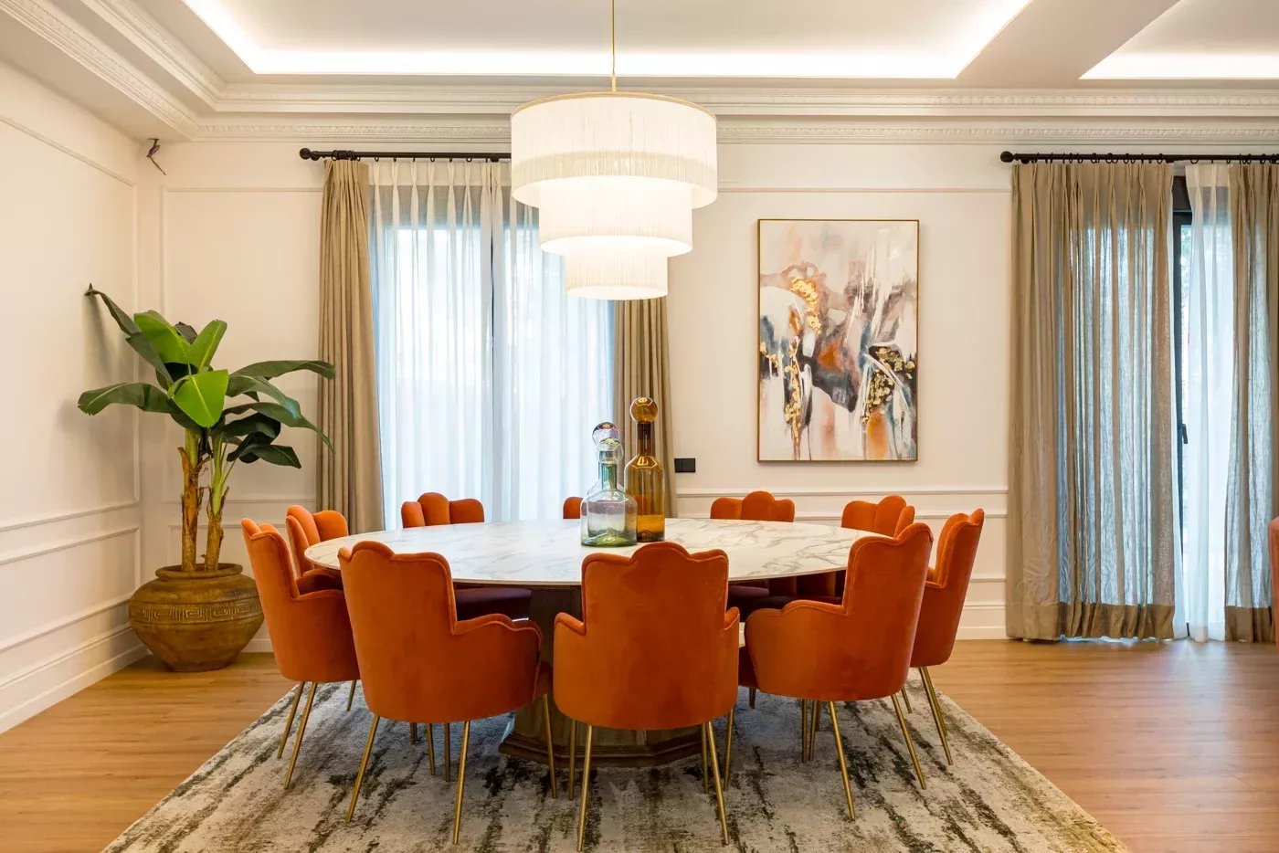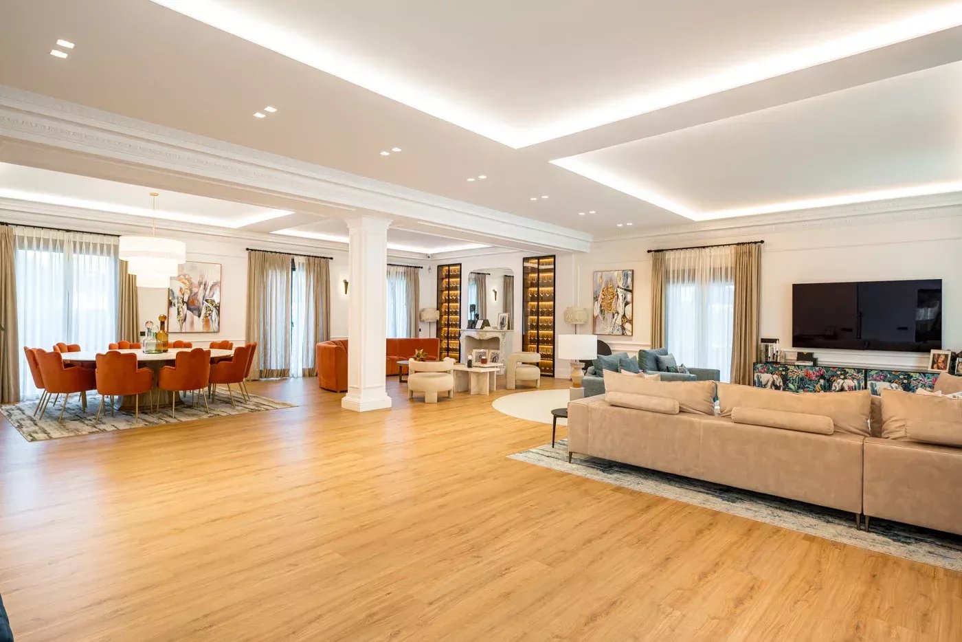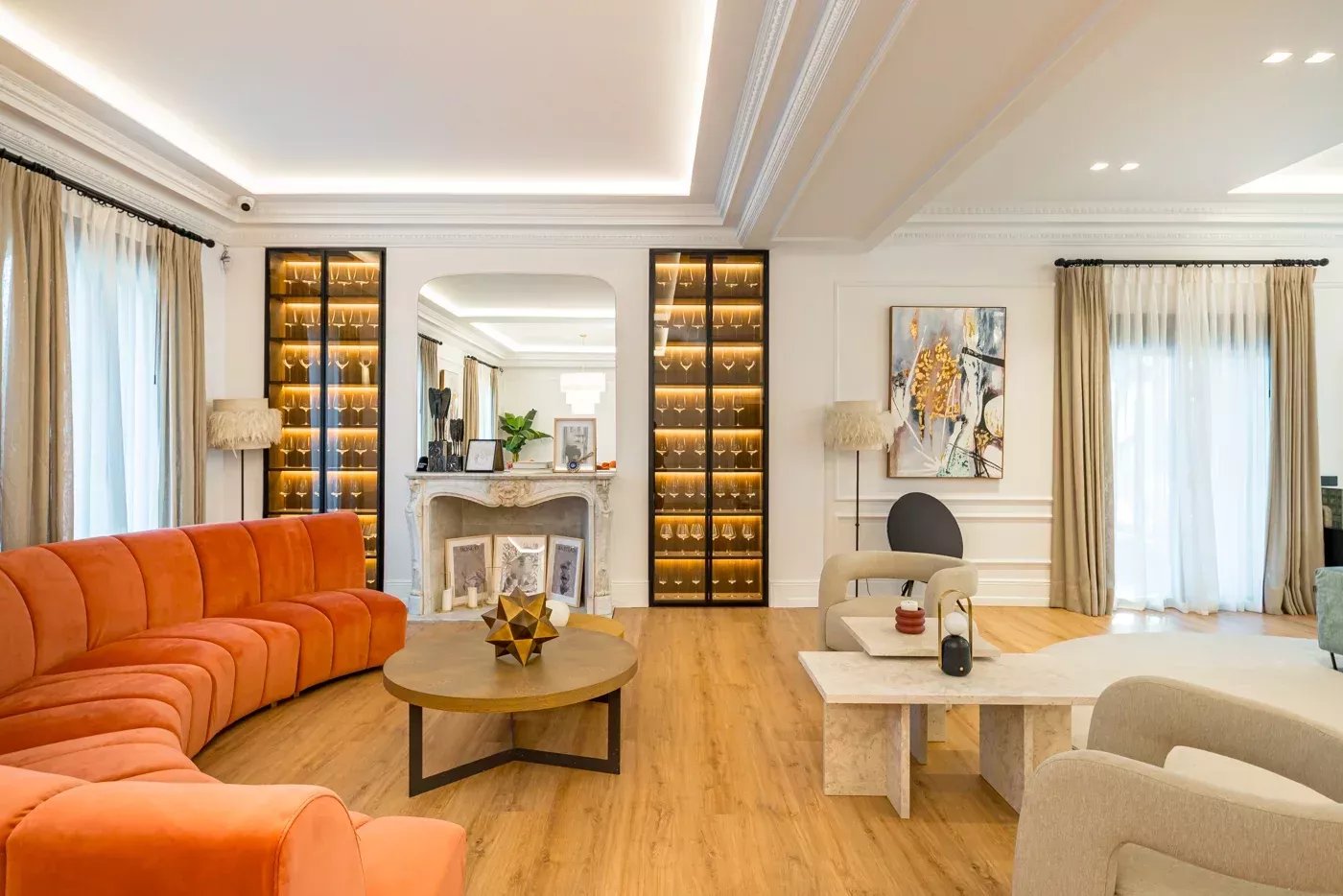 The main entrance features an elegant palm-lined driveway leading into the house. On the main floor, a 120 m² reception area is distributed into a formal living room, TV lounge, and dining room, with direct access to a glazed sunroom overlooking the garden. On the opposite wing, you'll find the family dining area and an open-plan kitchen with central island, equipped with high-end appliances, a laundry room, and a guest toilet.