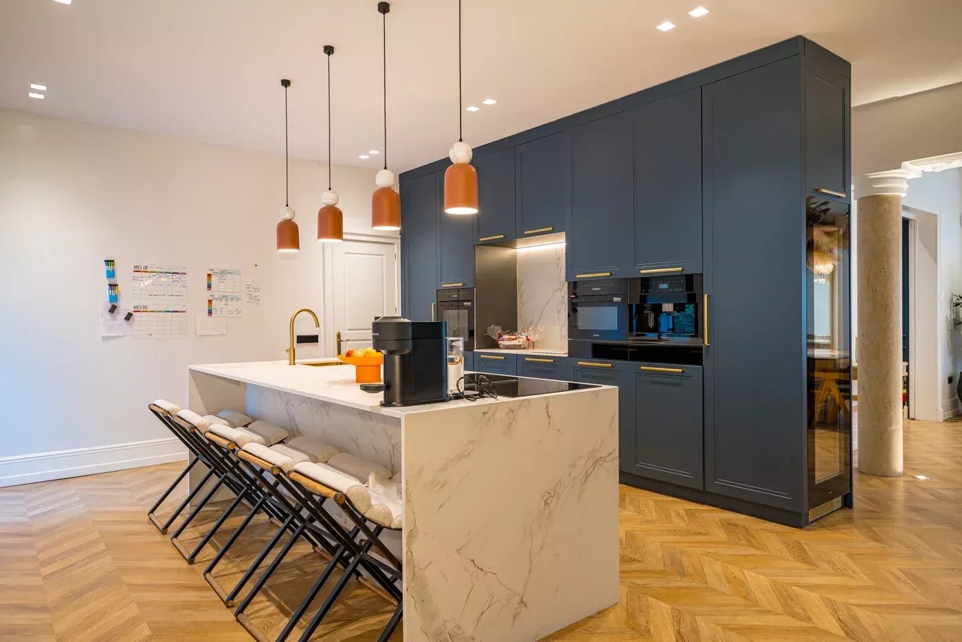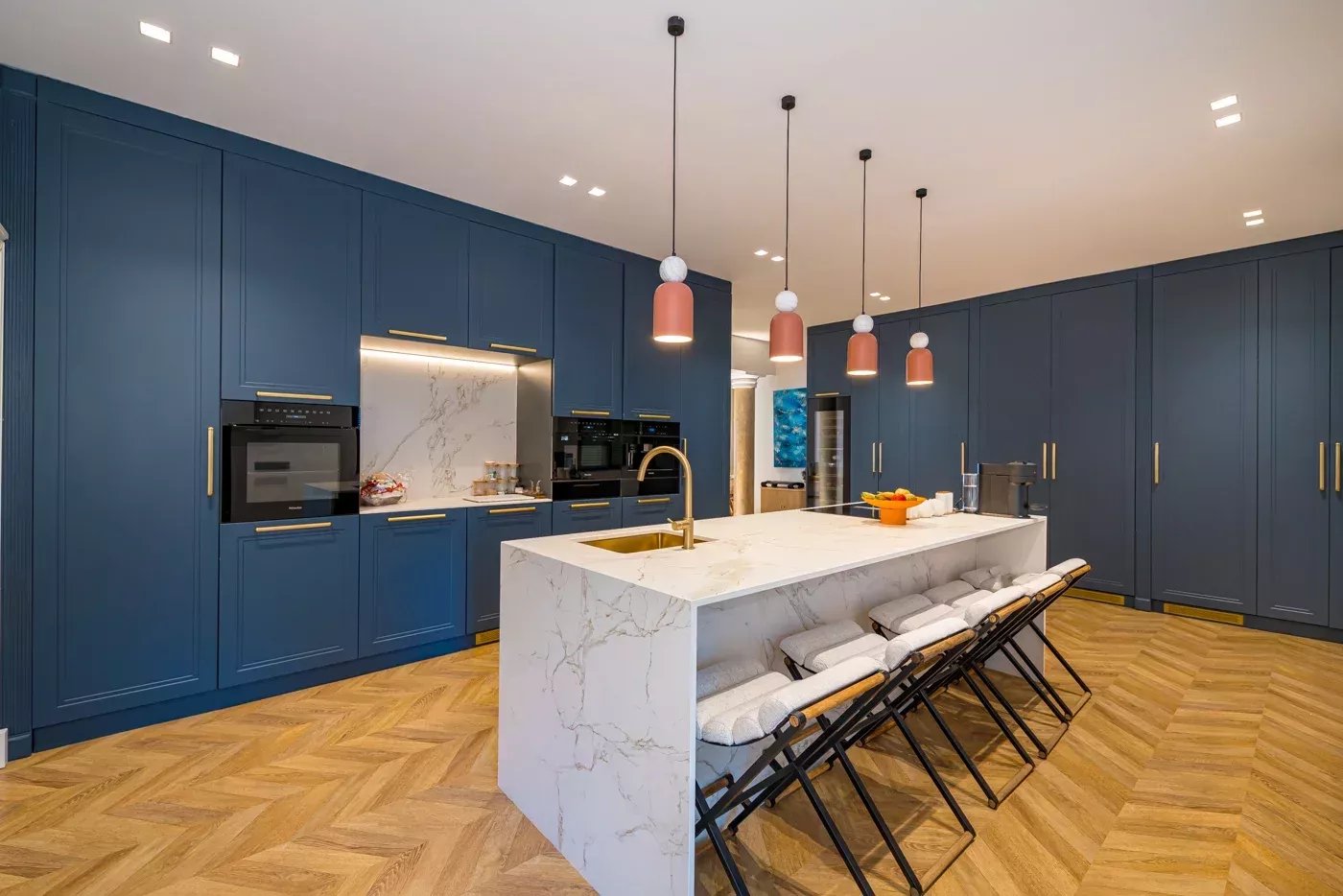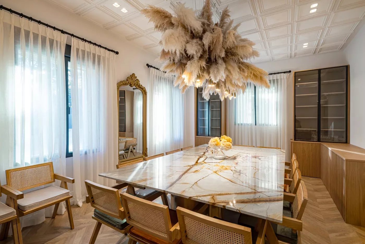 The main entrance features an elegant palm-lined driveway leading into the house. On the main floor, a 120 m² reception area is distributed into a formal living room, TV lounge, and dining room, with direct access to a glazed sunroom overlooking the garden. On the opposite wing, you'll find the family dining area and an open-plan kitchen with central island, equipped with high-end appliances, a laundry room, and a guest toilet.