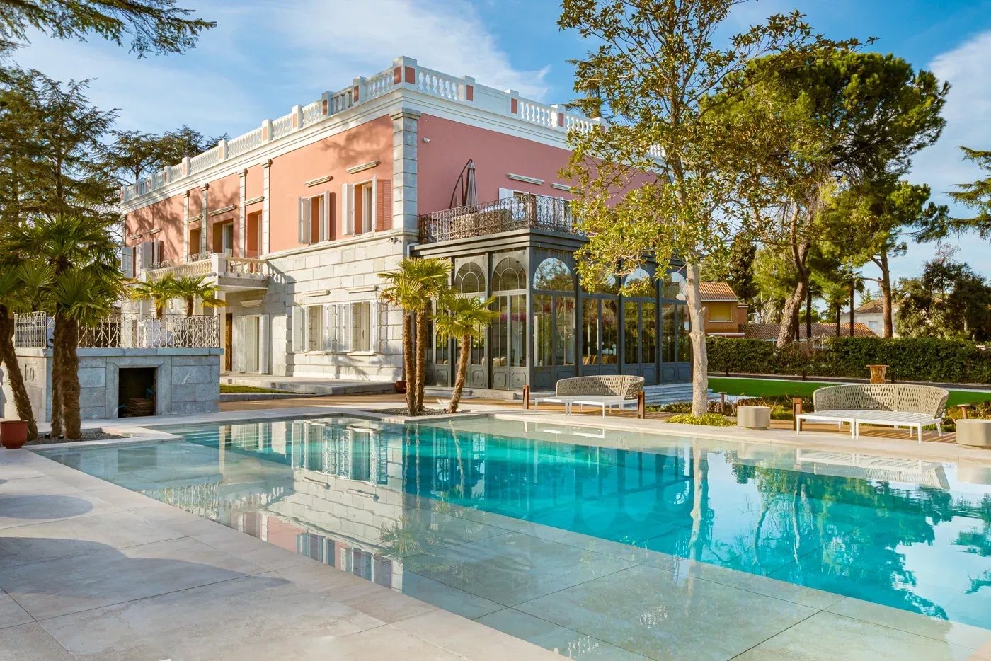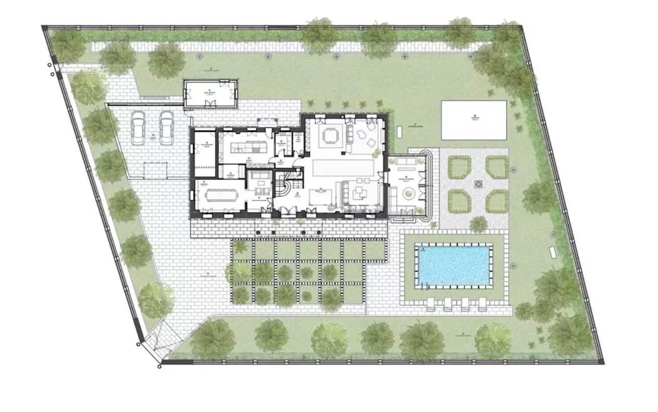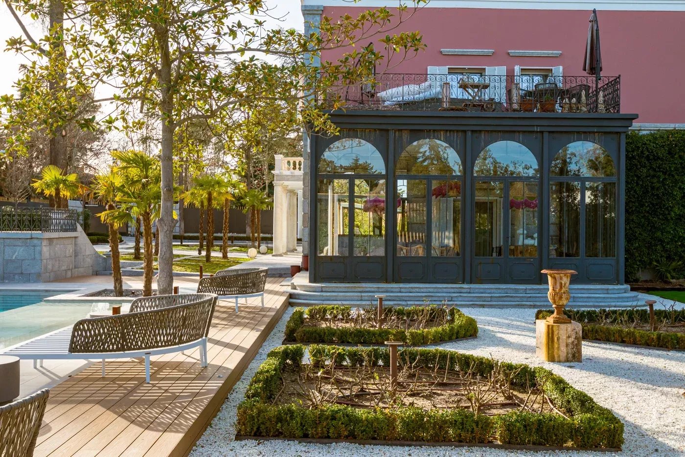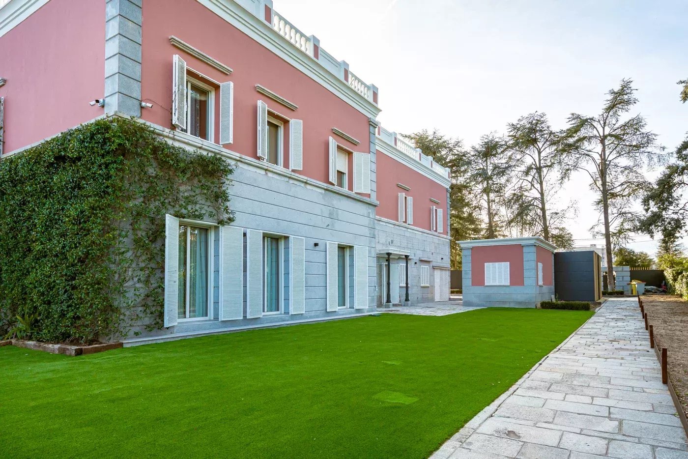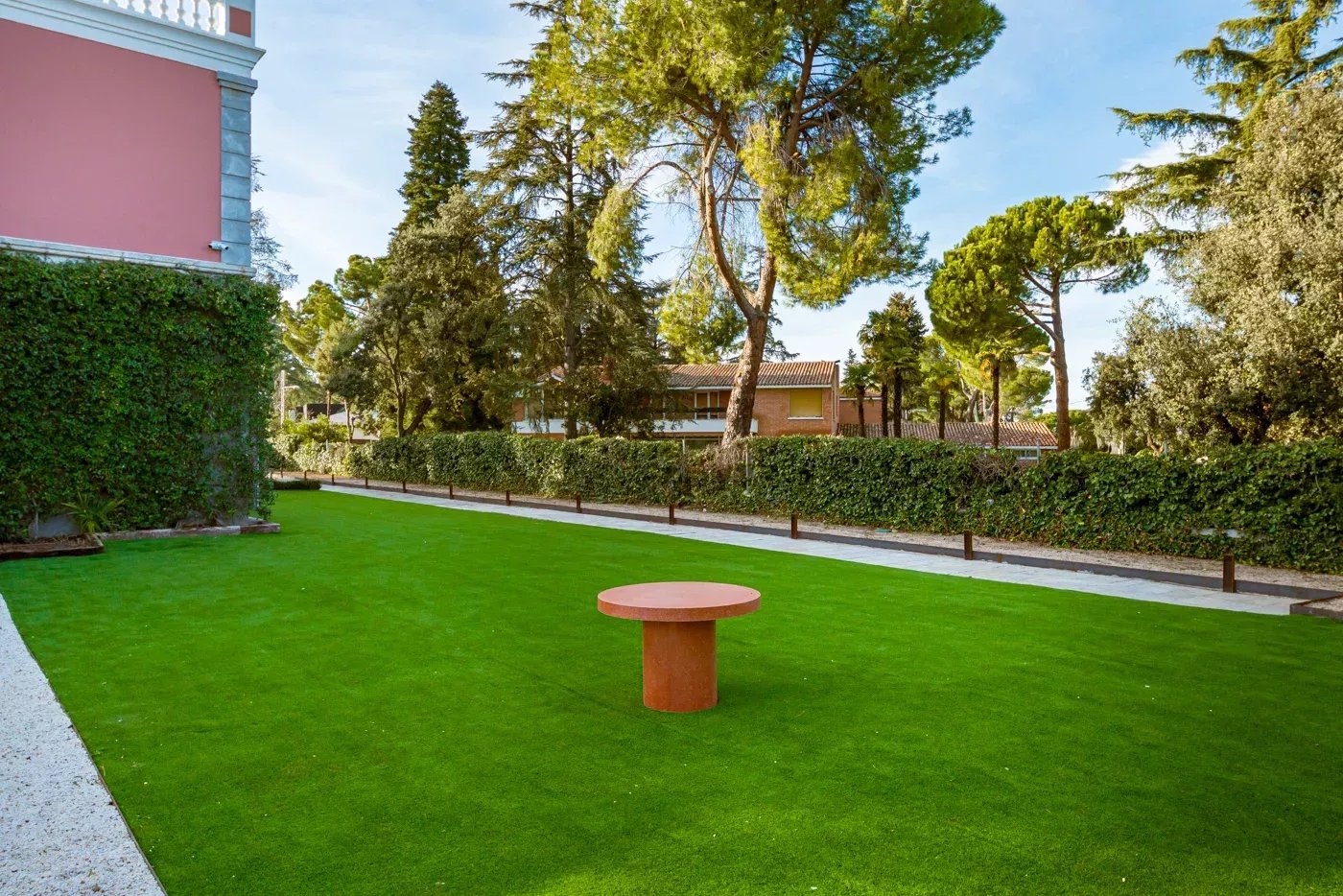 In the sunniest part of the garden, there is a main pool with lounge area, a second intimate pool perfect for family use, a charming rose garden, and an expansive artificial lawn ideal for social events and private gatherings. This area includes four outdoor bathrooms and two guest powder rooms.