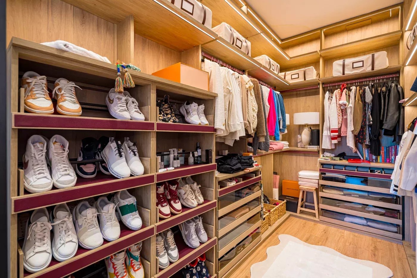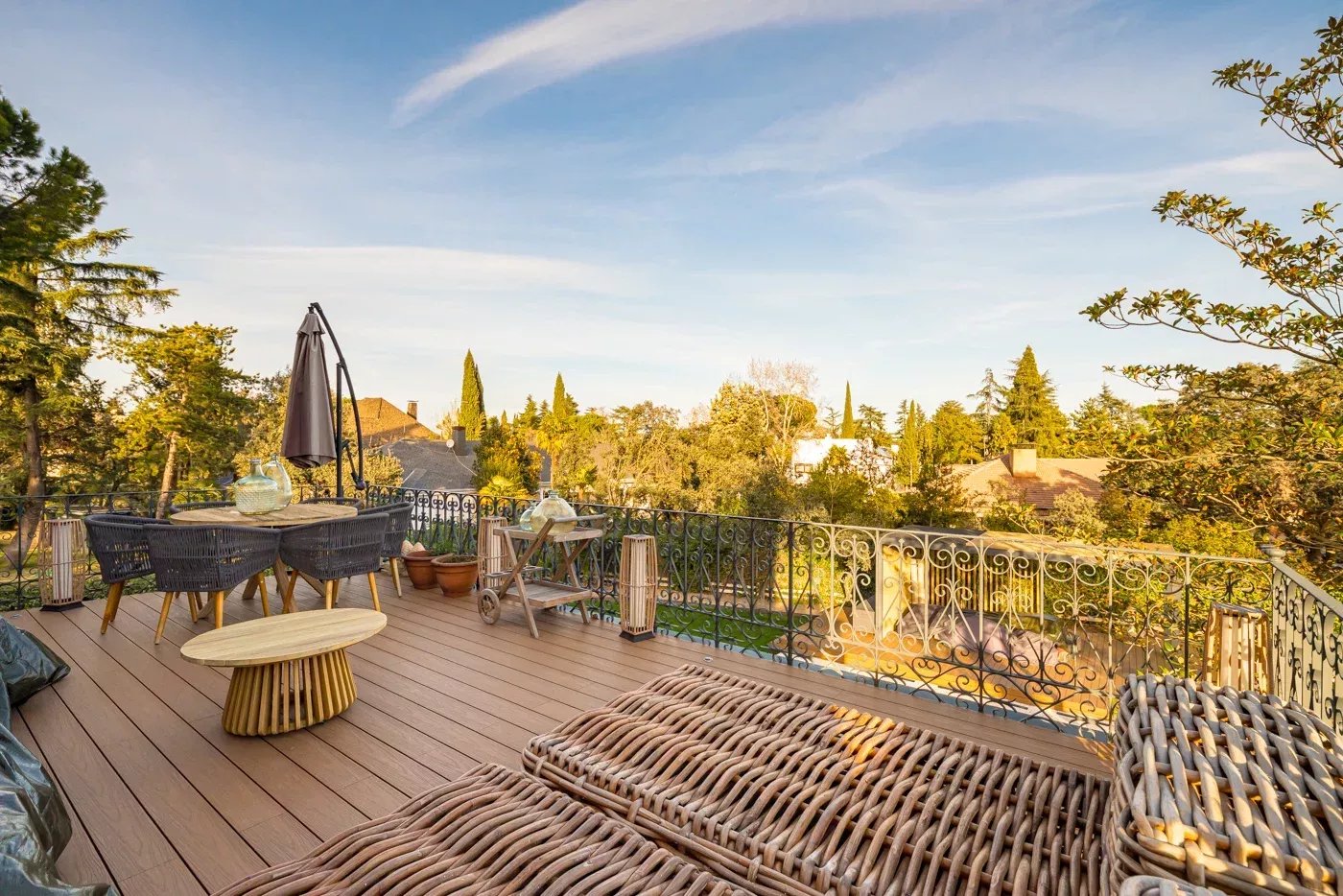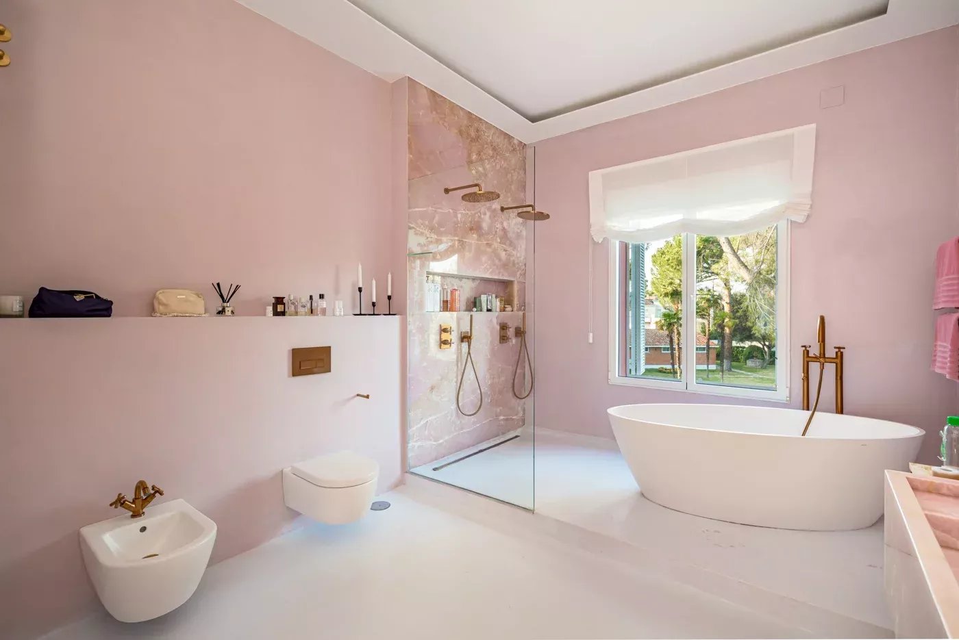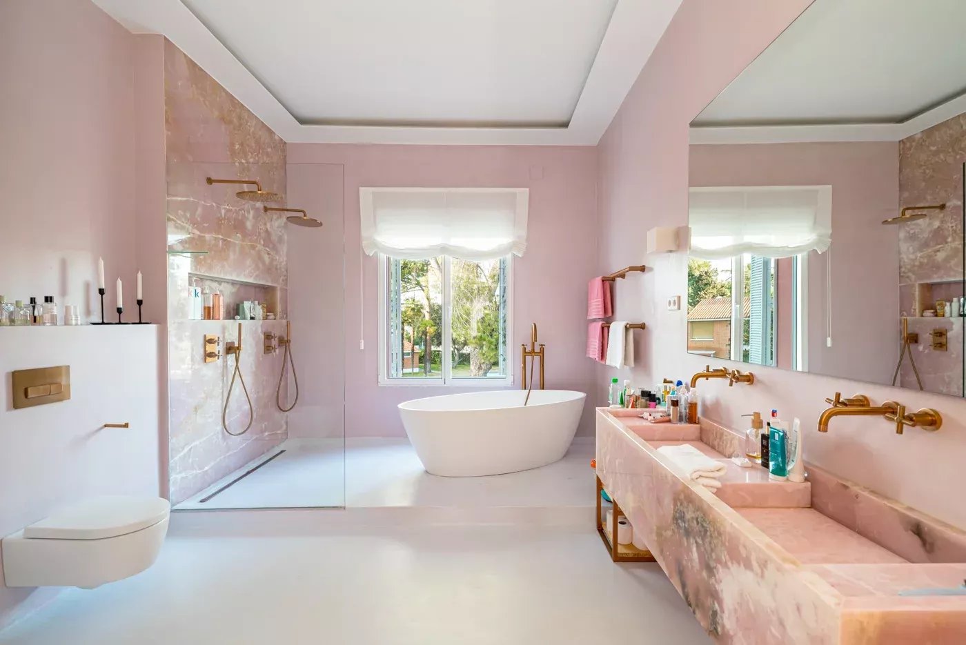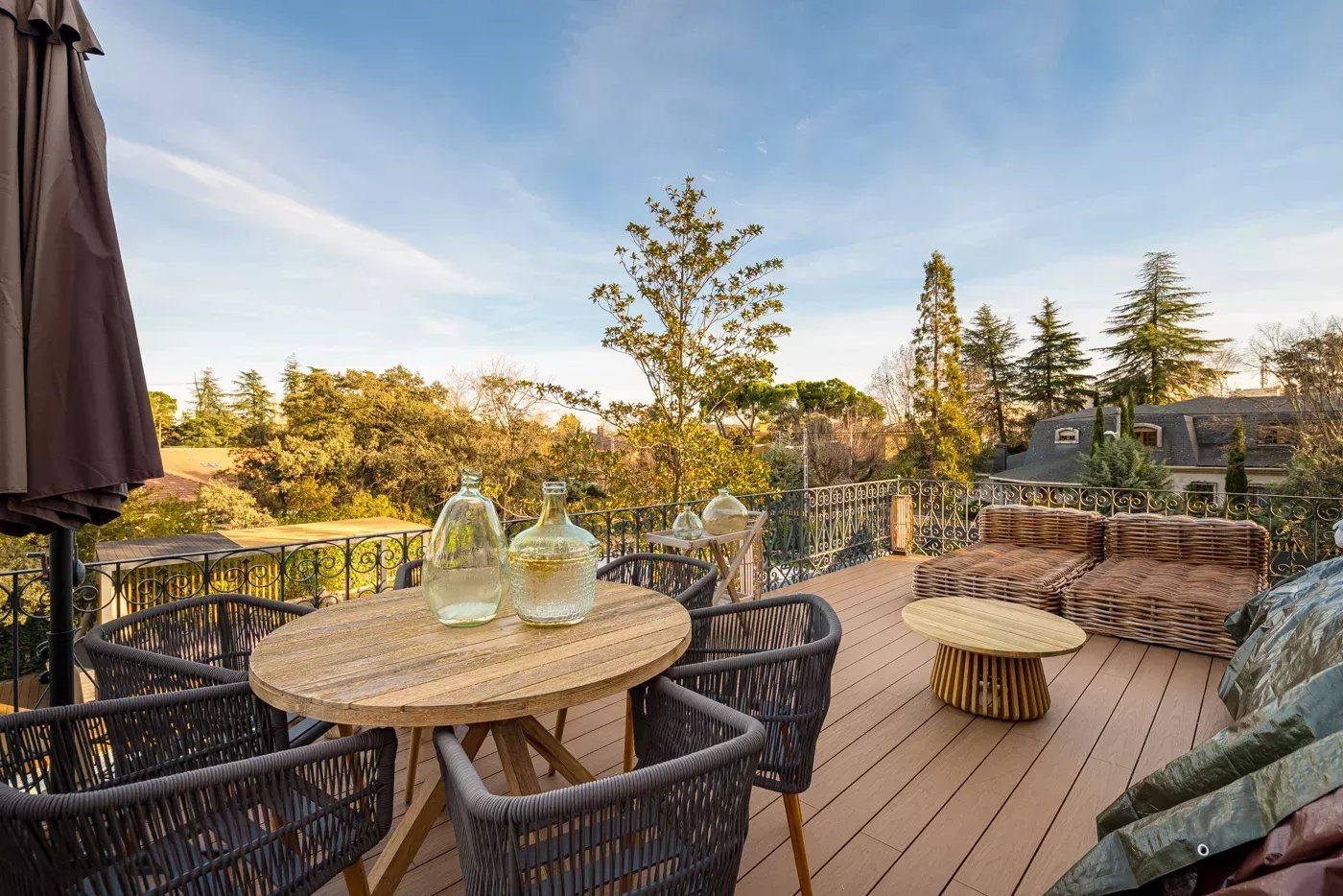 In the sunniest part of the garden, there is a main pool with lounge area, a second intimate pool perfect for family use, a charming rose garden, and an expansive artificial lawn ideal for social events and private gatherings. This area includes four outdoor bathrooms and two guest powder rooms.