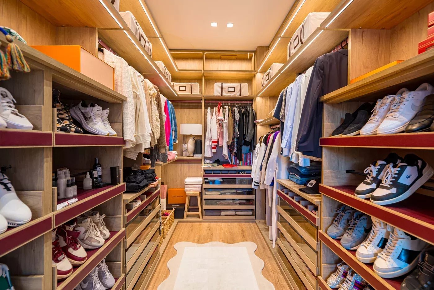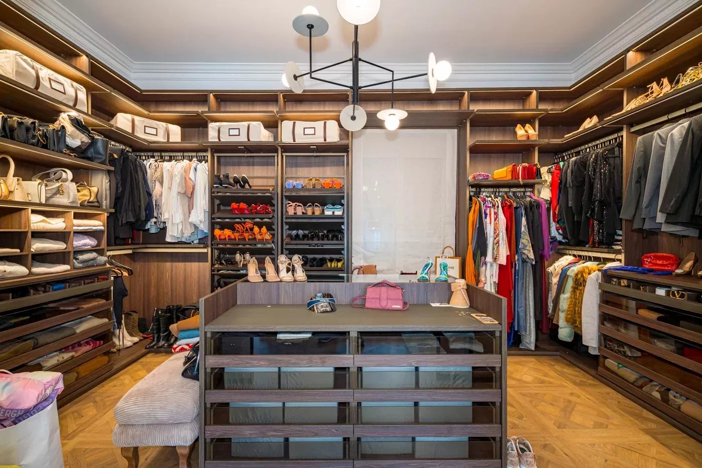 The upper floor offers four exterior double en-suite bedrooms, each with a full bathroom. The master suite includes a private walk-in closet, a terrace with garden views, and an additional shared walk-in wardrobe with natural light.